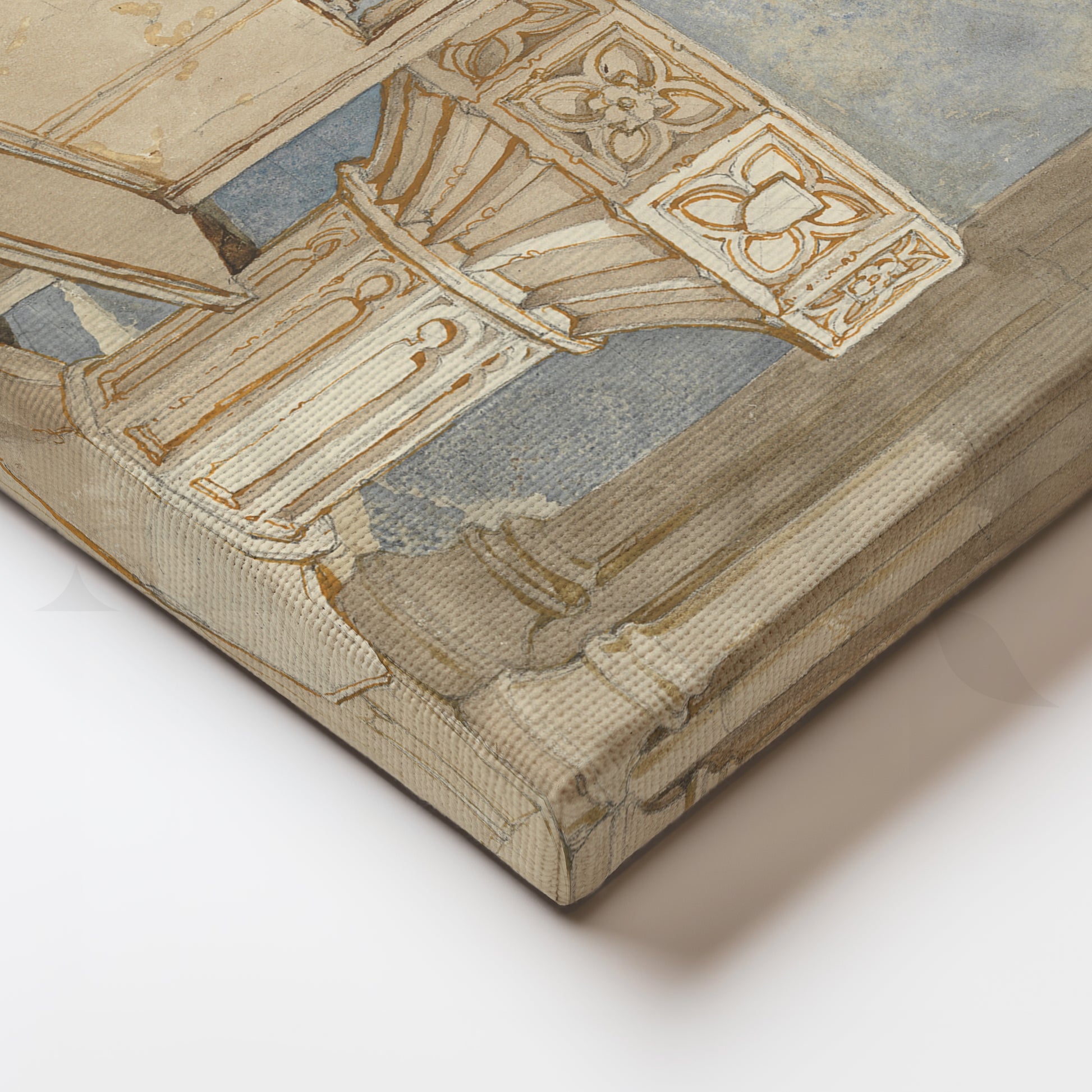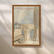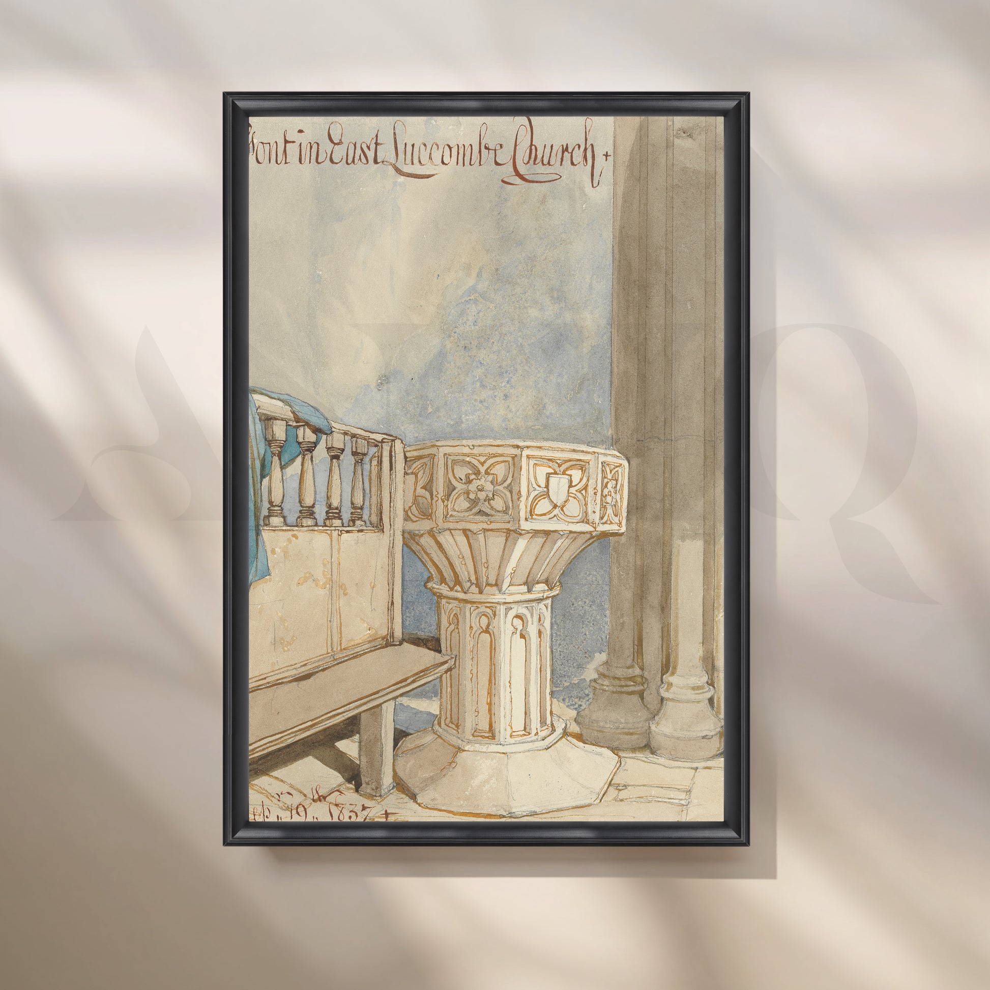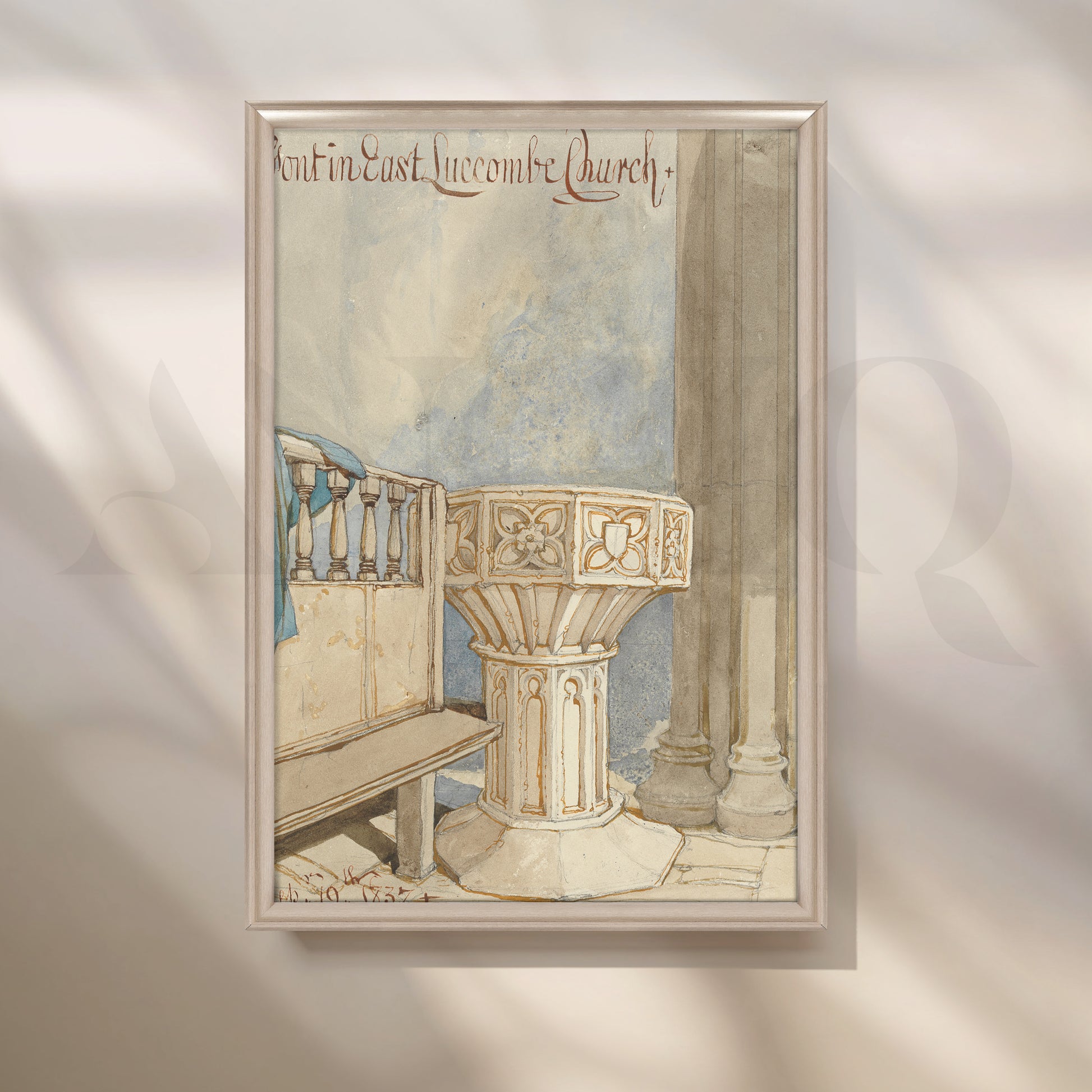 A serene Anciq watercolor painting of a church font with soft architectural details, radiating peace and spirituality. Ideal for hallways, meditation rooms, or calm corners. Keywords: church interior painting, watercolor architecture art, spiritual home decor, minimalistic wall art, peaceful hallway artwork.