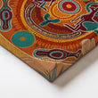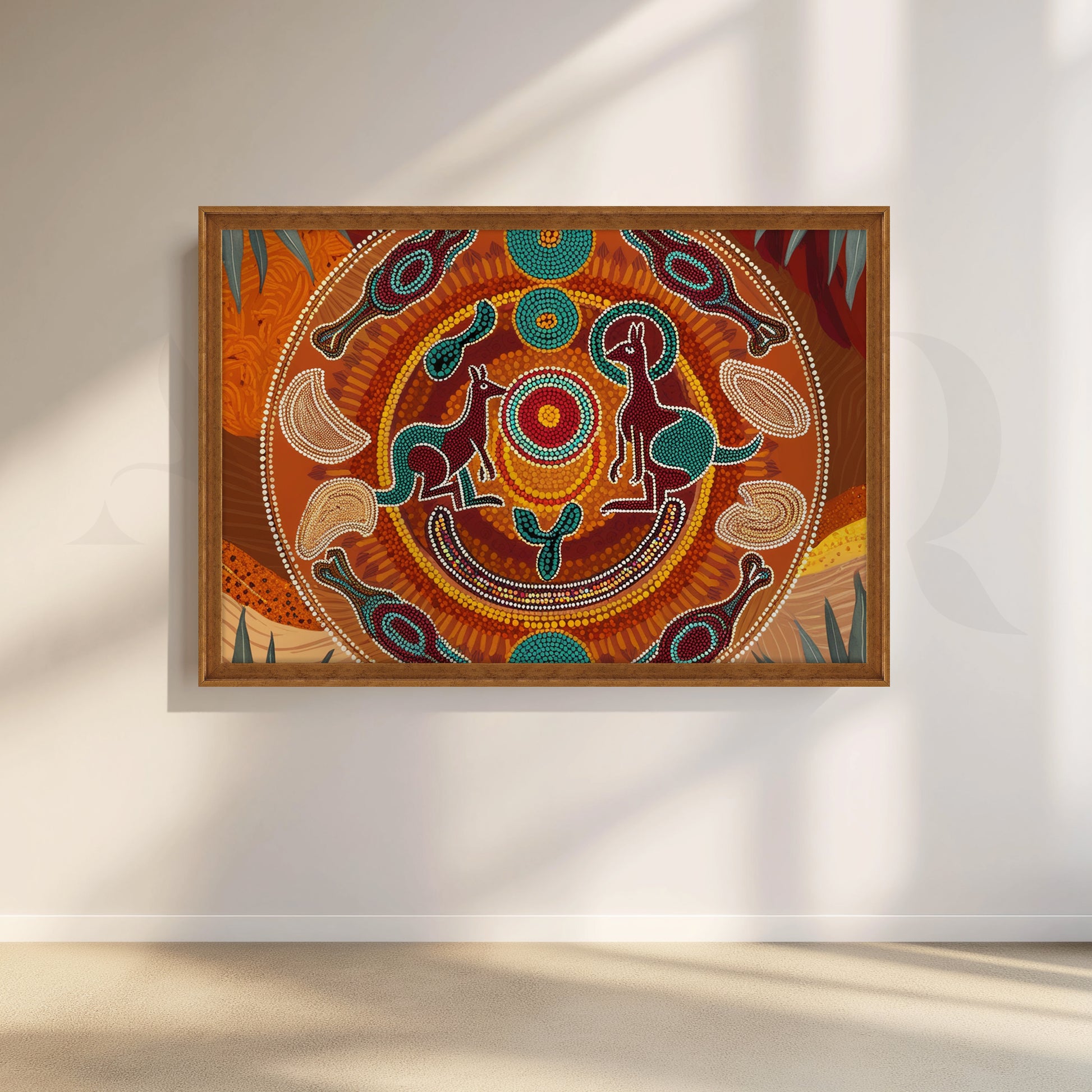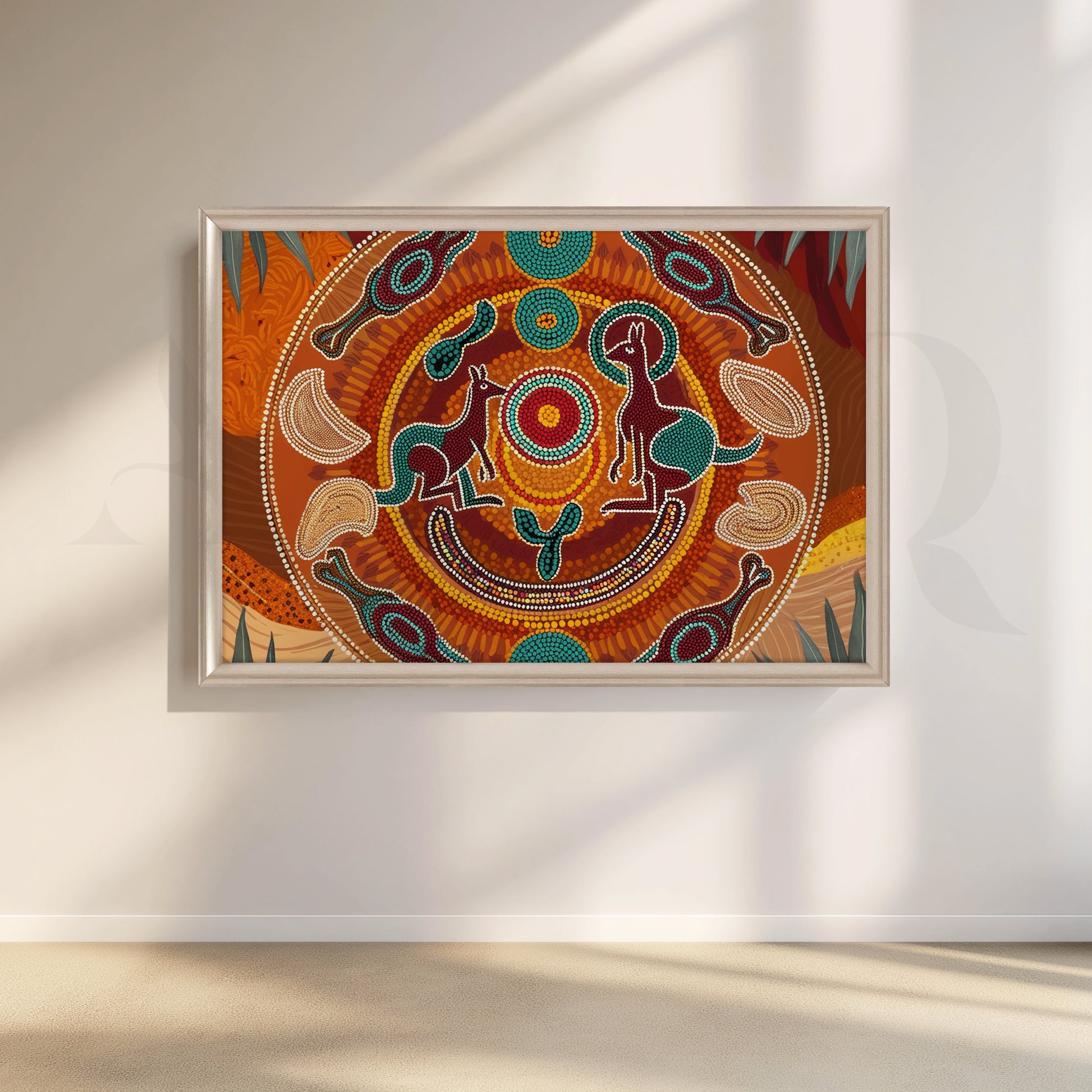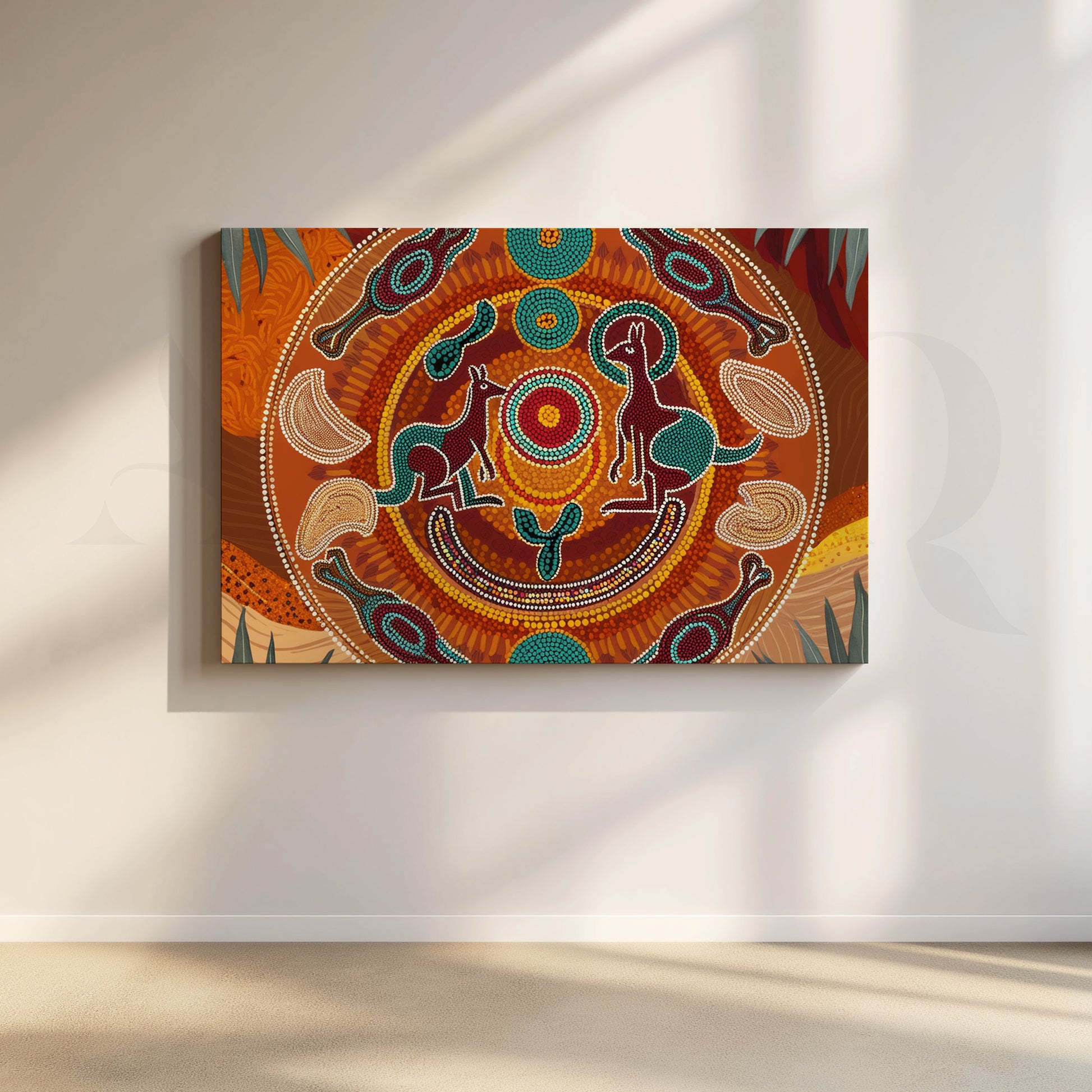 This Anciq artwork captures a mesmerizing tribal composition in warm ochre, teal, and brown tones—depicting kangaroos and native motifs within a radiant circular pattern. Perfect for living rooms or earthy-themed interiors. Keywords: tribal art canvas, aboriginal wall decor, earthy tone painting, circular ethnic artwork, nature-inspired wall art.