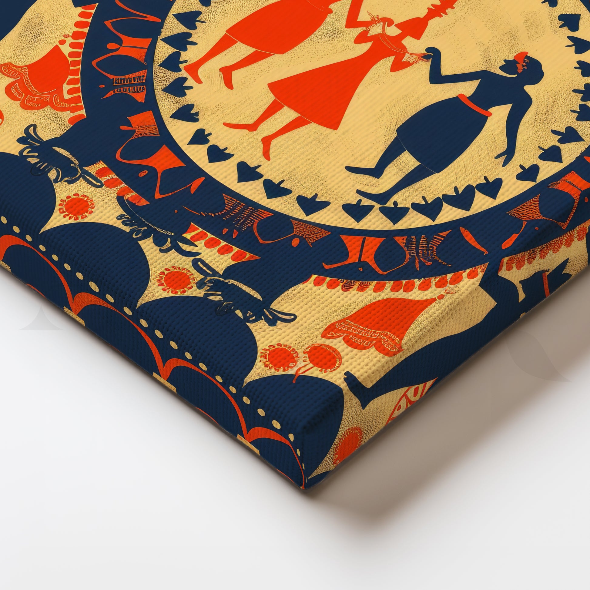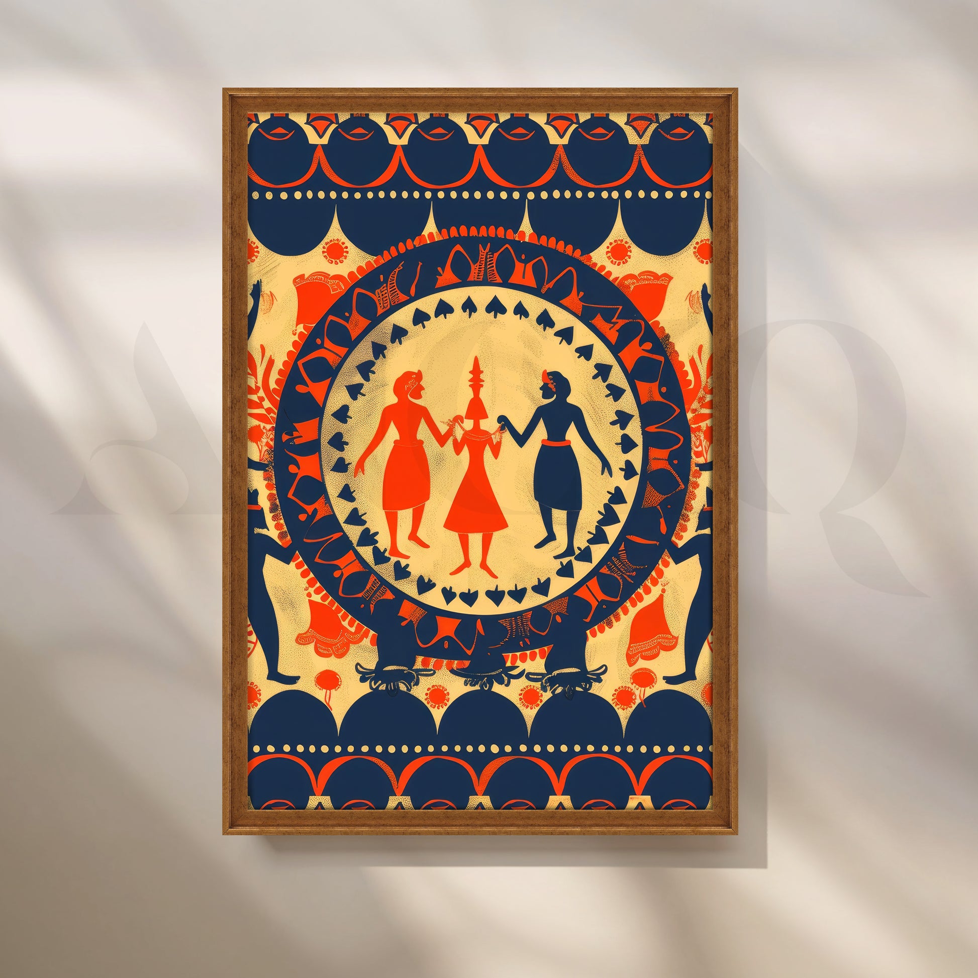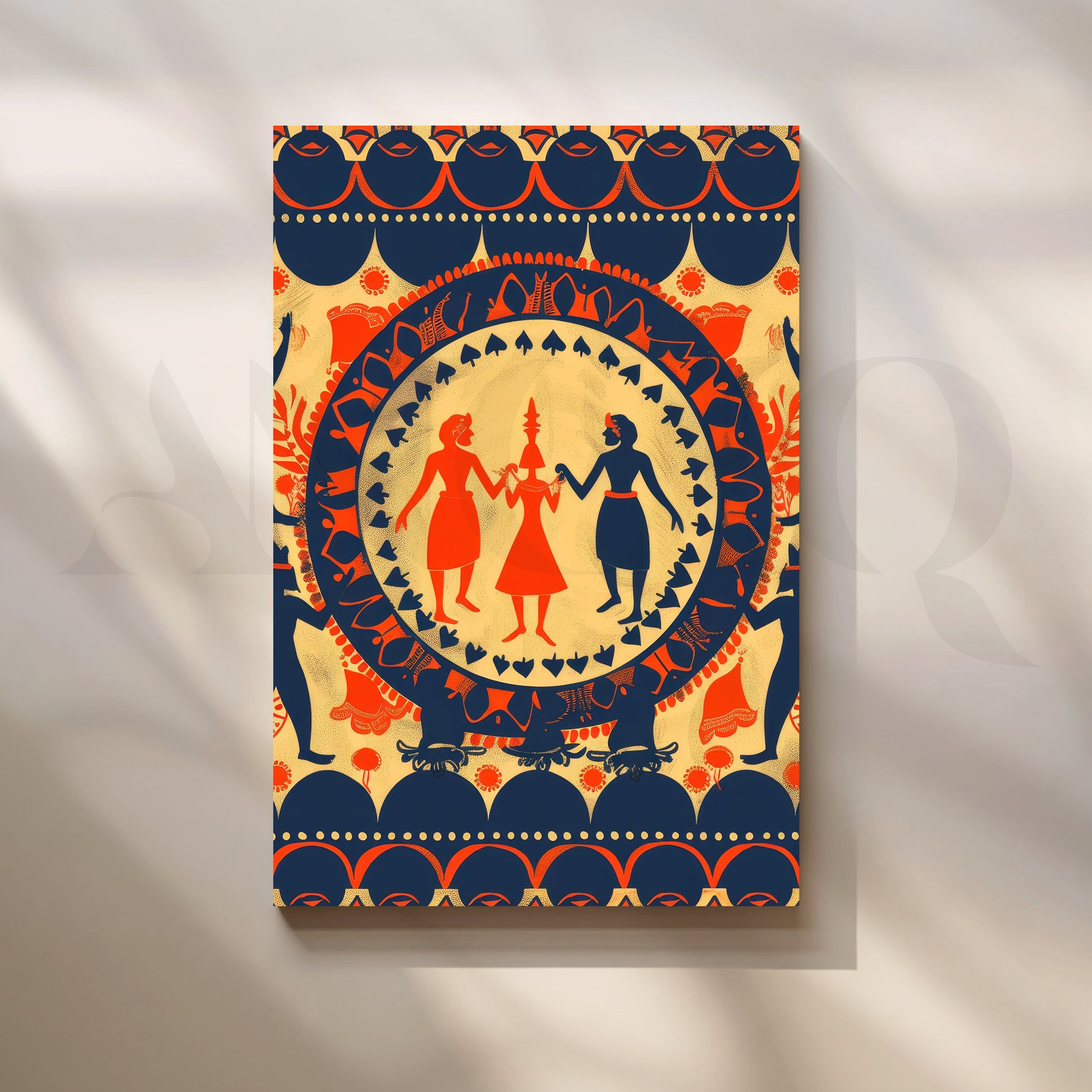 Rich in symbolism, this Anciq artwork showcases tribal women holding hands in rhythmic harmony with earthy navy and saffron hues. Perfect for hallways or entry walls. Keywords: tribal circle art, folk motif painting, earthy tone wall decor, boho ethnic canvas, cultural wall artwork.