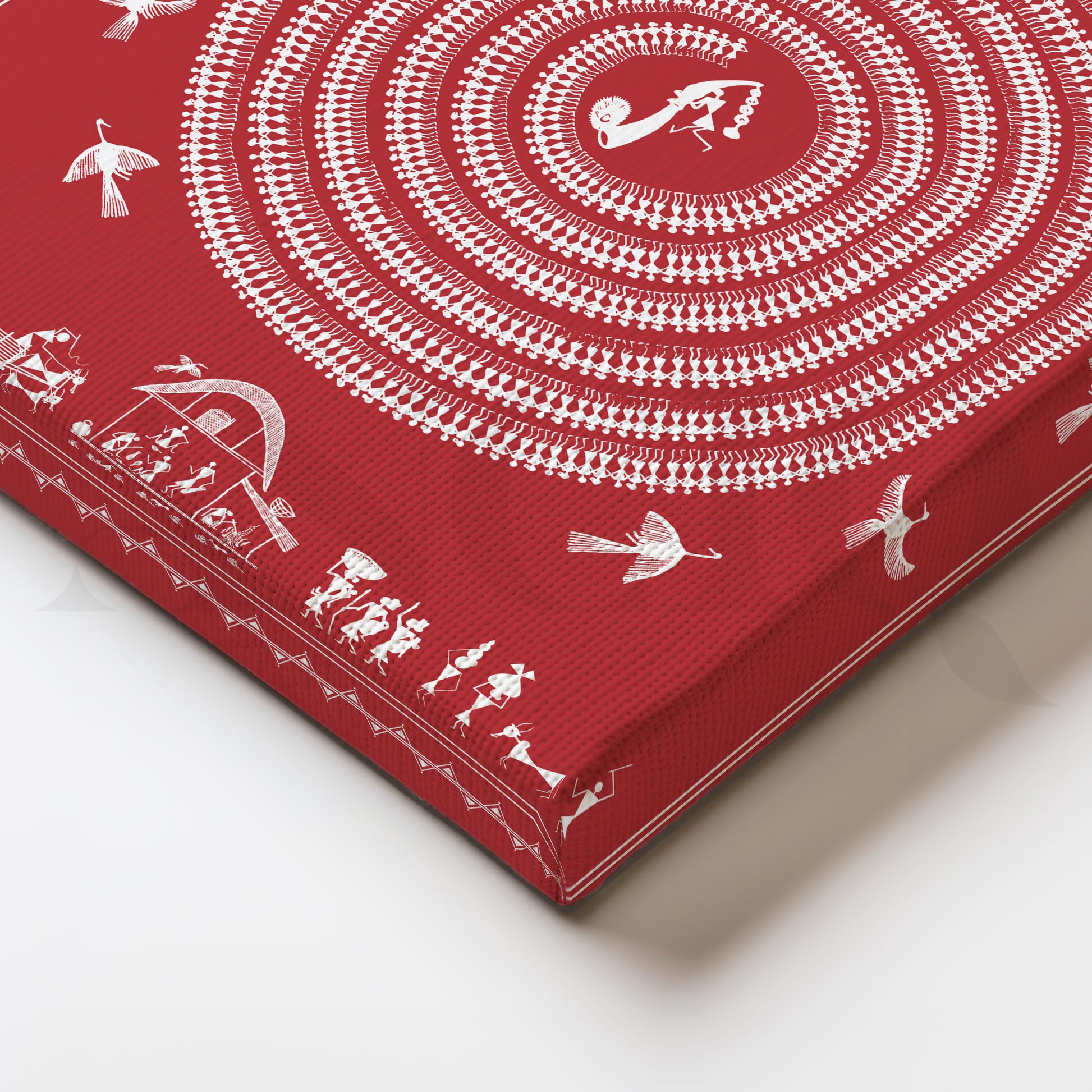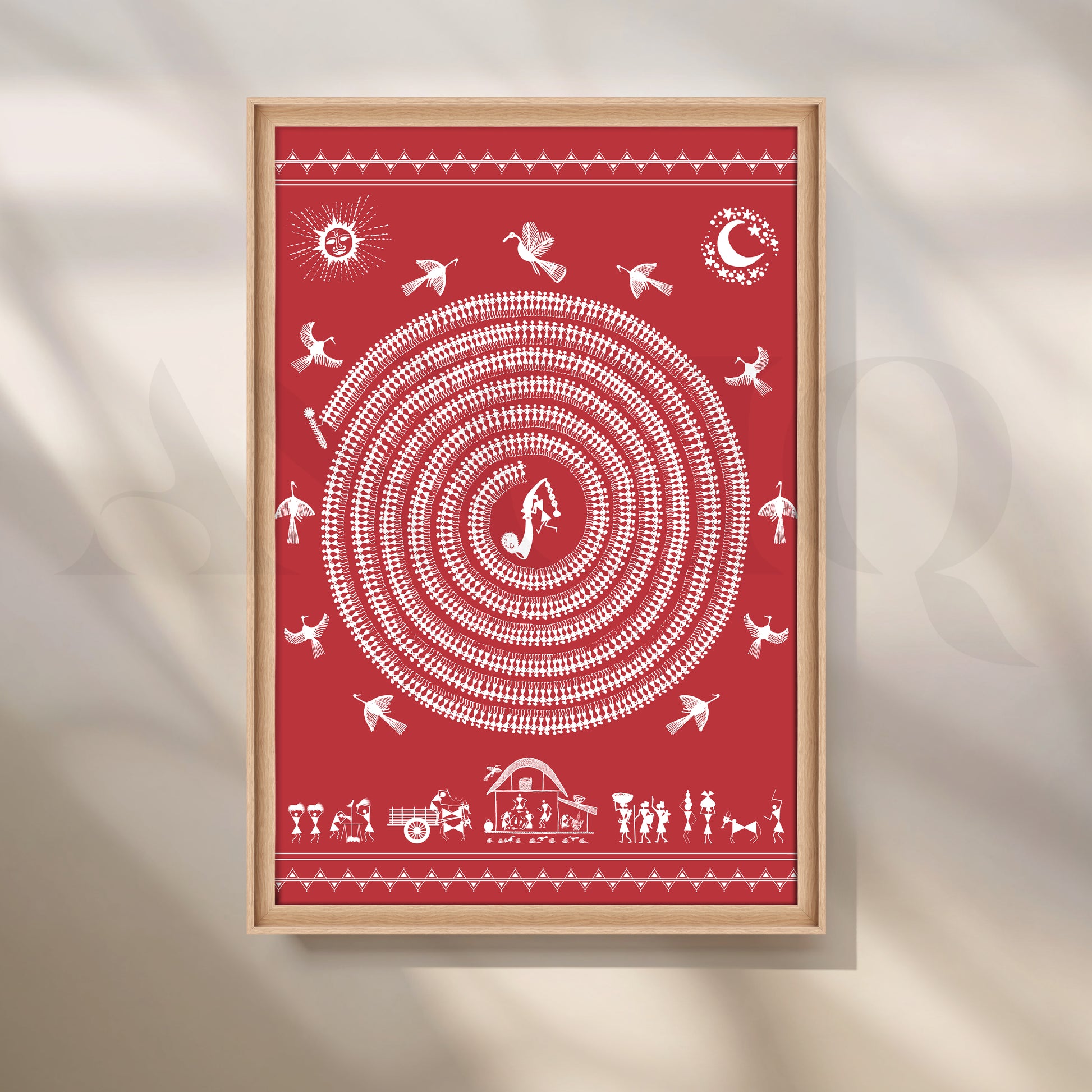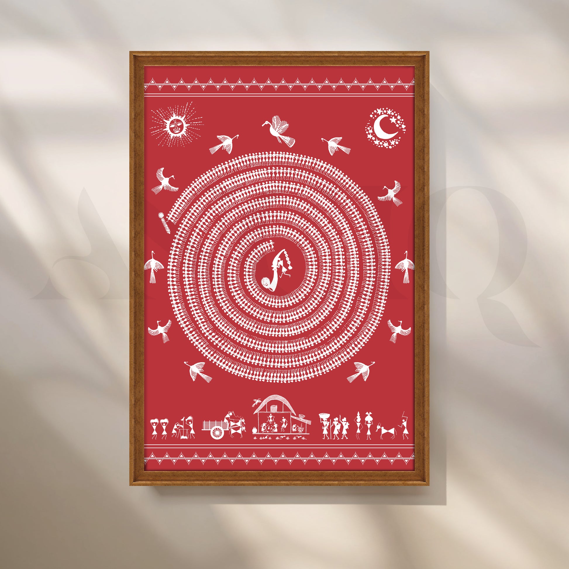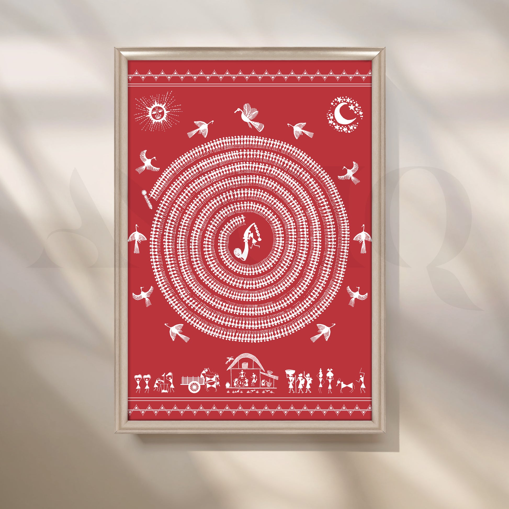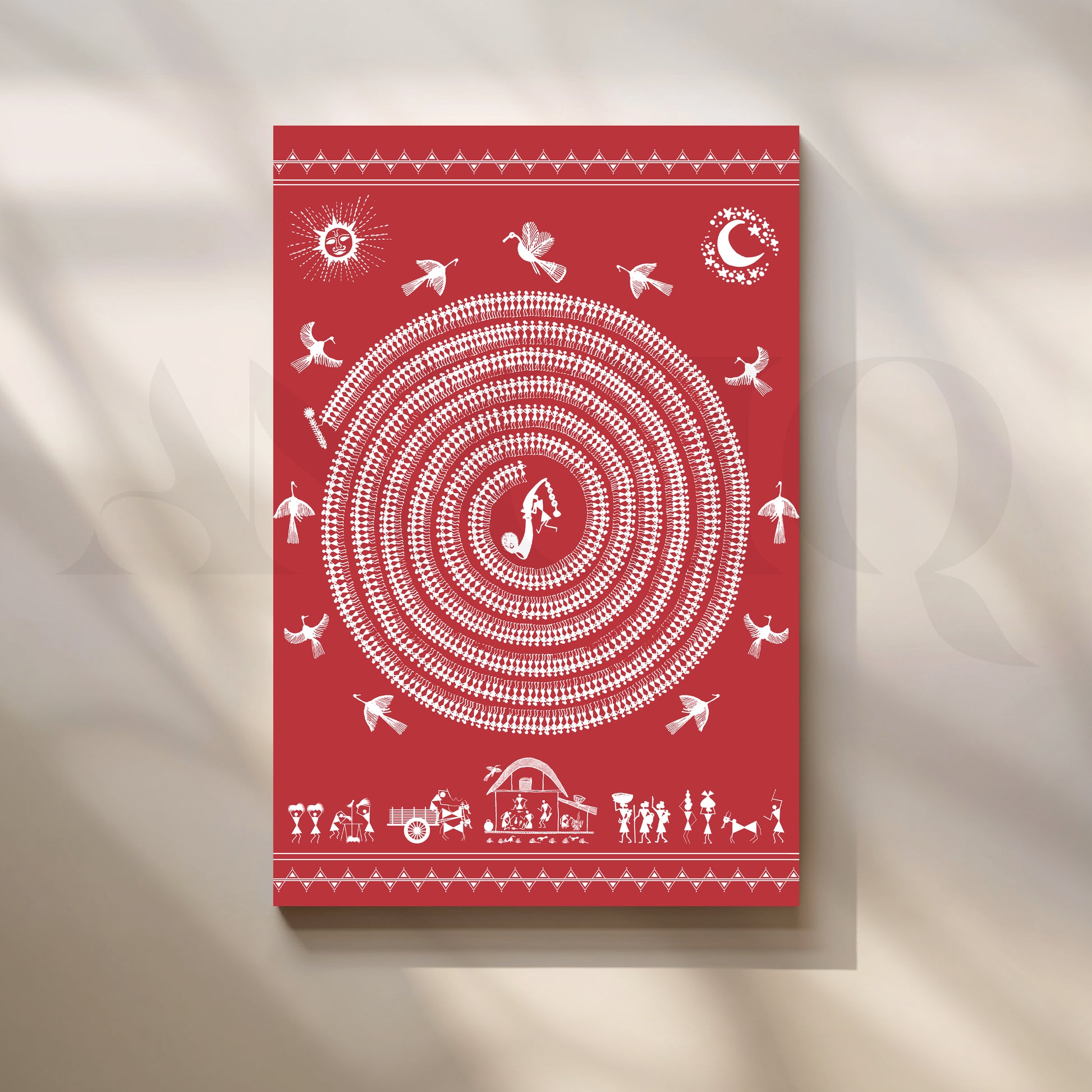 This red and white Warli-inspired Anciq artwork depicts a mesmerizing spiral of human forms symbolizing unity and life’s rhythm. Perfect for living rooms, offices, or meditation spaces. Keywords: Warli art painting, tribal wall decor, red abstract artwork, Indian folk art, symbolic spiritual wall art.