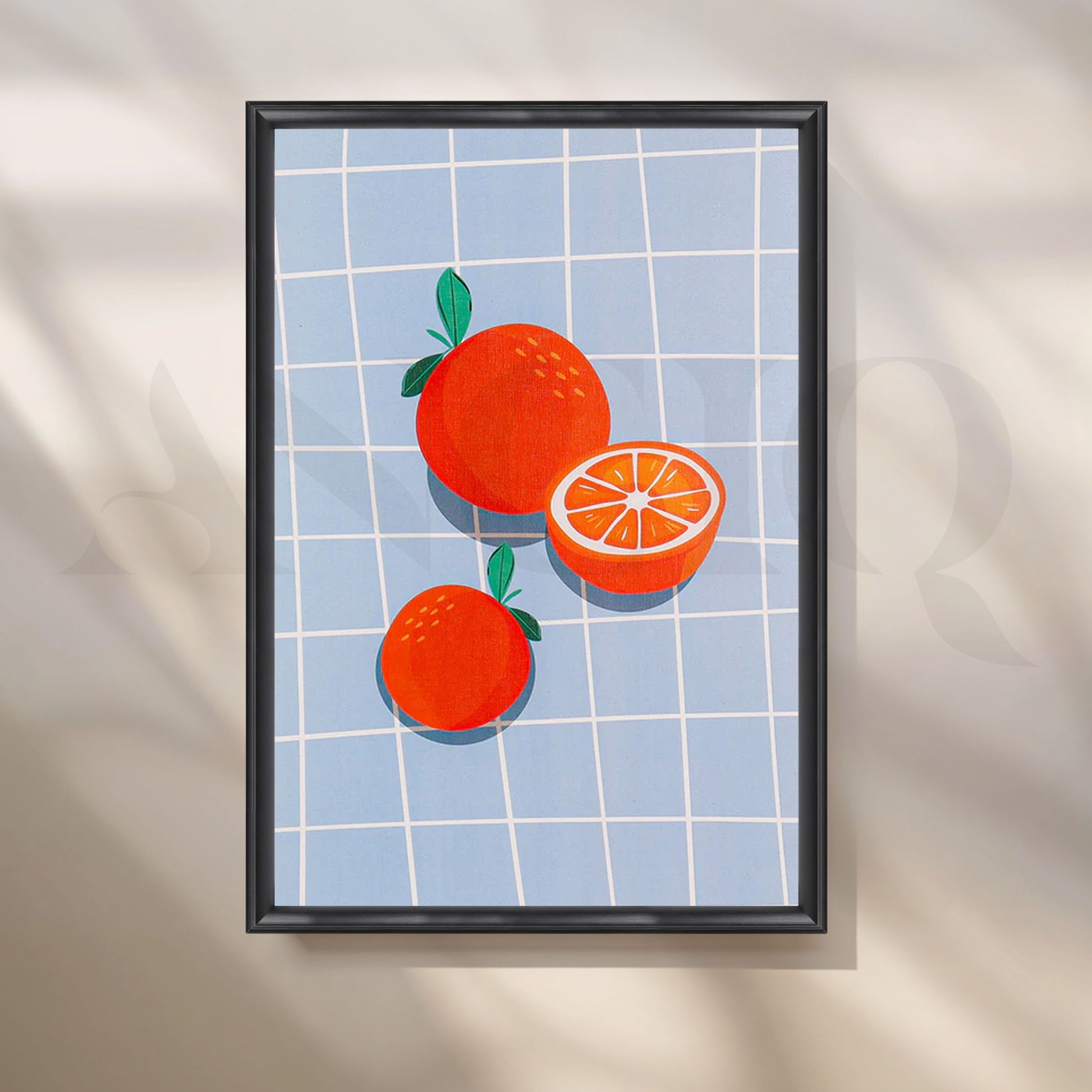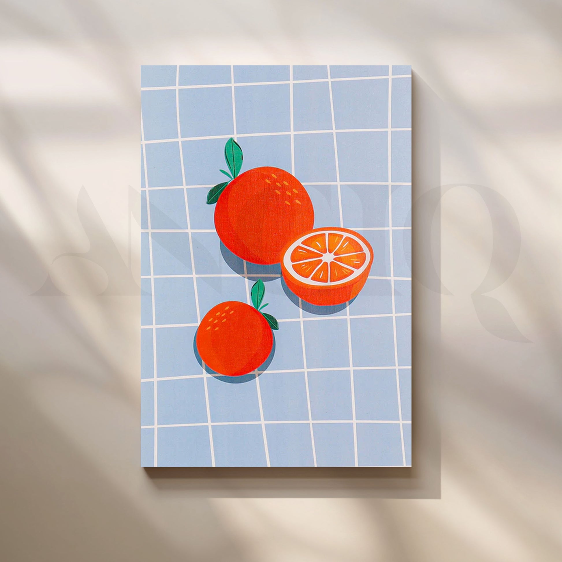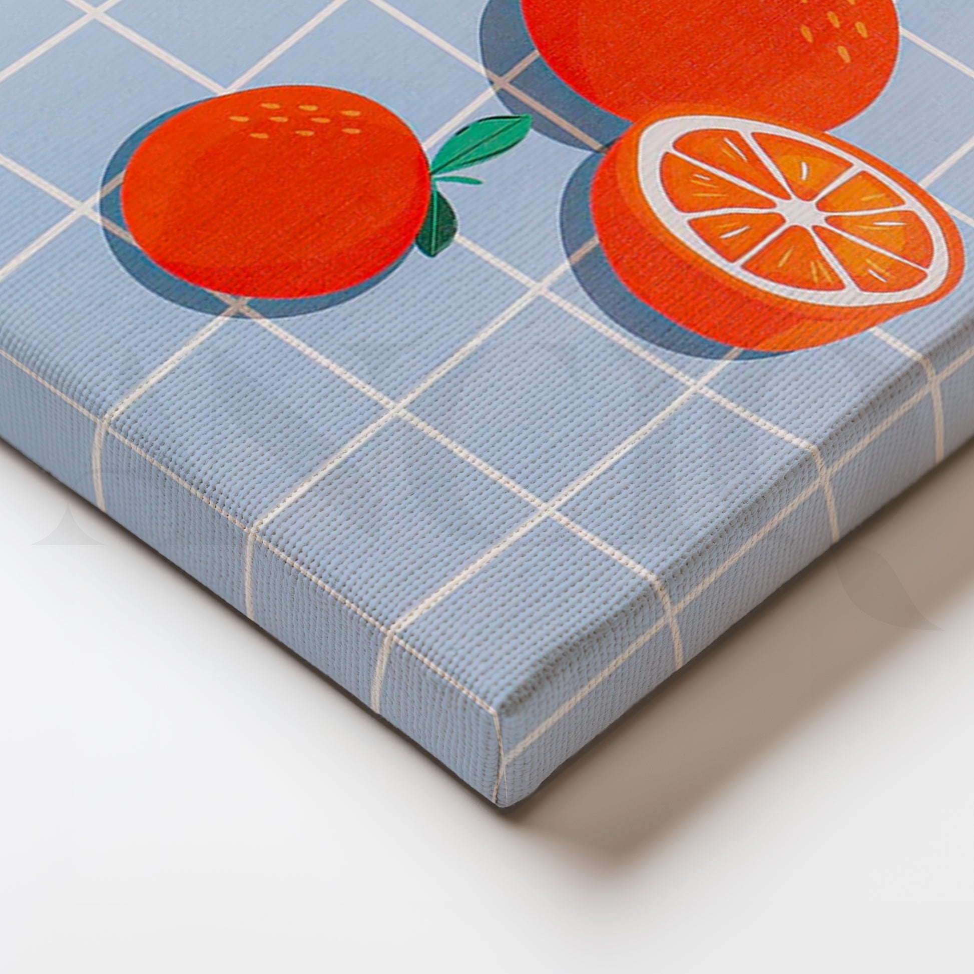 Clean, modern illustration of bright oranges on a powder-blue checkered backdrop—perfect for a cheerful kitchen or breakfast nook. This minimalist fruit artwork complements Scandinavian and mid-century décor. Keywords: kitchen wall art, citrus canvas, orange fruit print, minimal poster, breakfast nook décor, blue grid artwork, modern kitchen décor, Scandinavian wall art.
