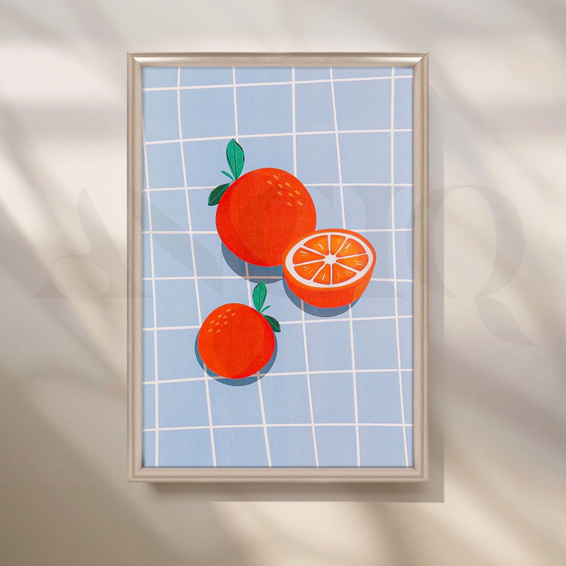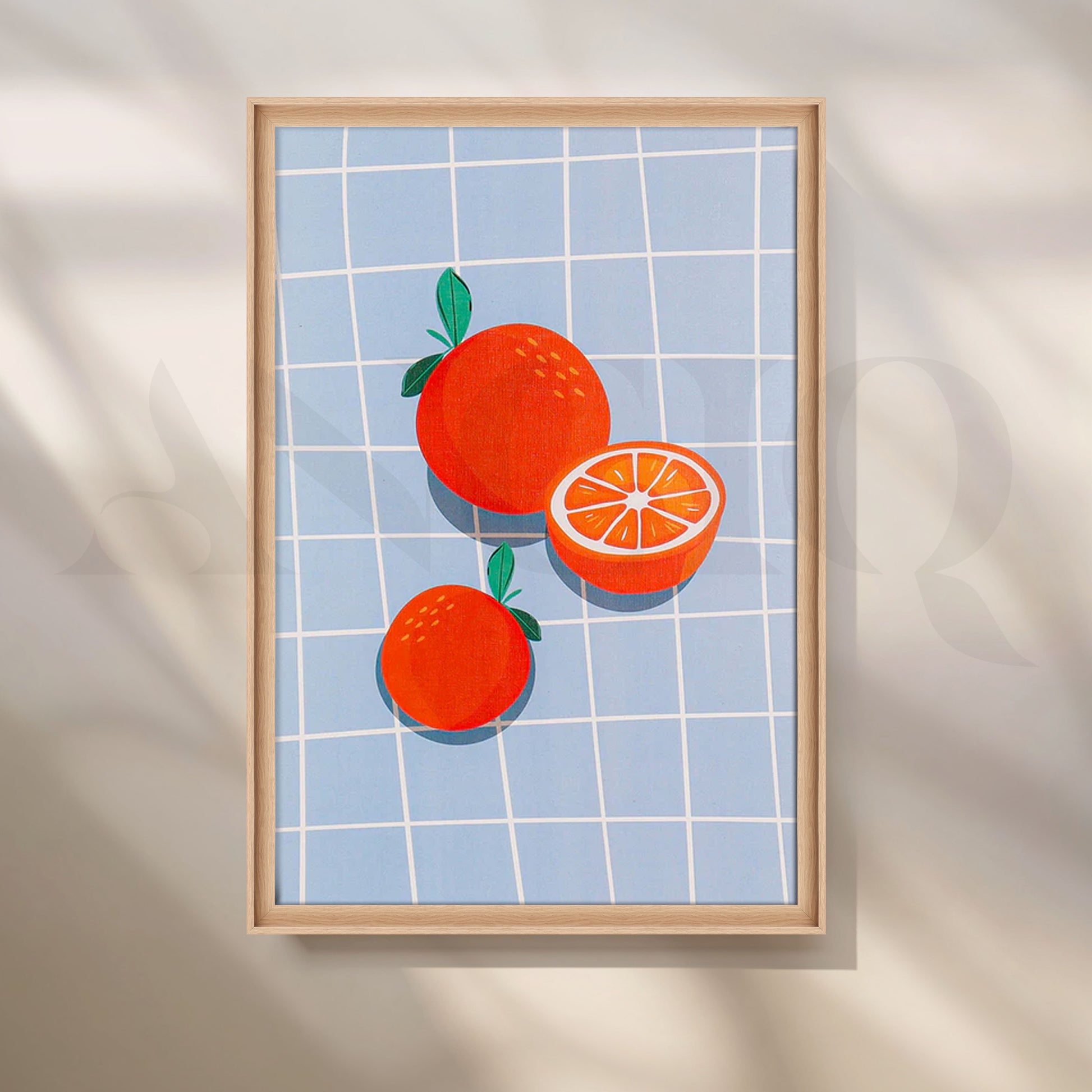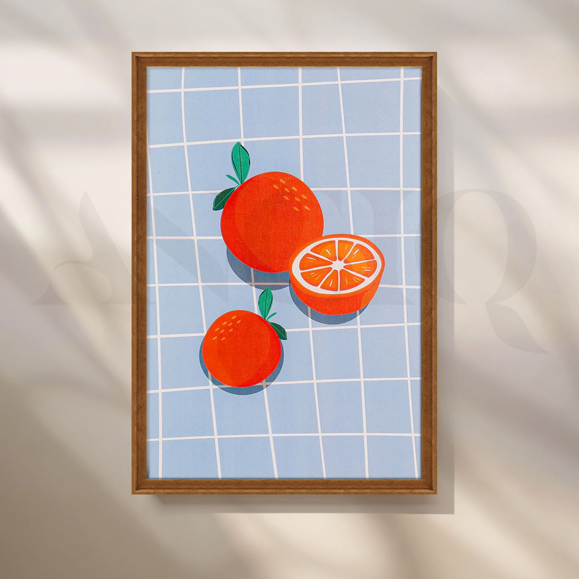 Clean, modern illustration of bright oranges on a powder-blue checkered backdrop—perfect for a cheerful kitchen or breakfast nook. This minimalist fruit artwork complements Scandinavian and mid-century décor. Keywords: kitchen wall art, citrus canvas, orange fruit print, minimal poster, breakfast nook décor, blue grid artwork, modern kitchen décor, Scandinavian wall art.