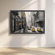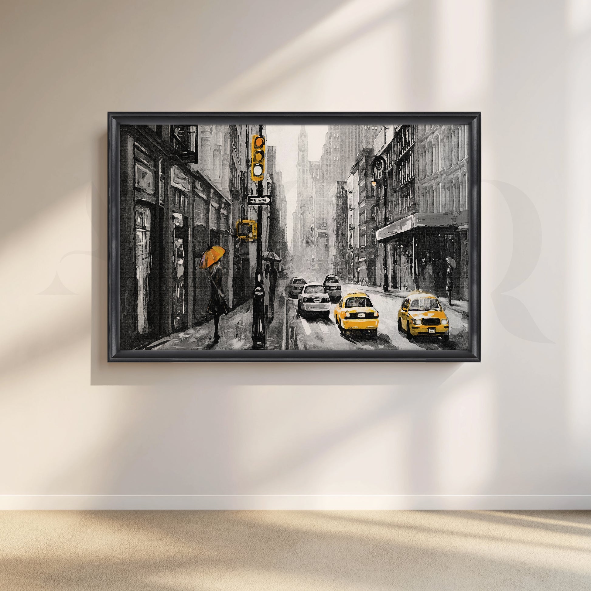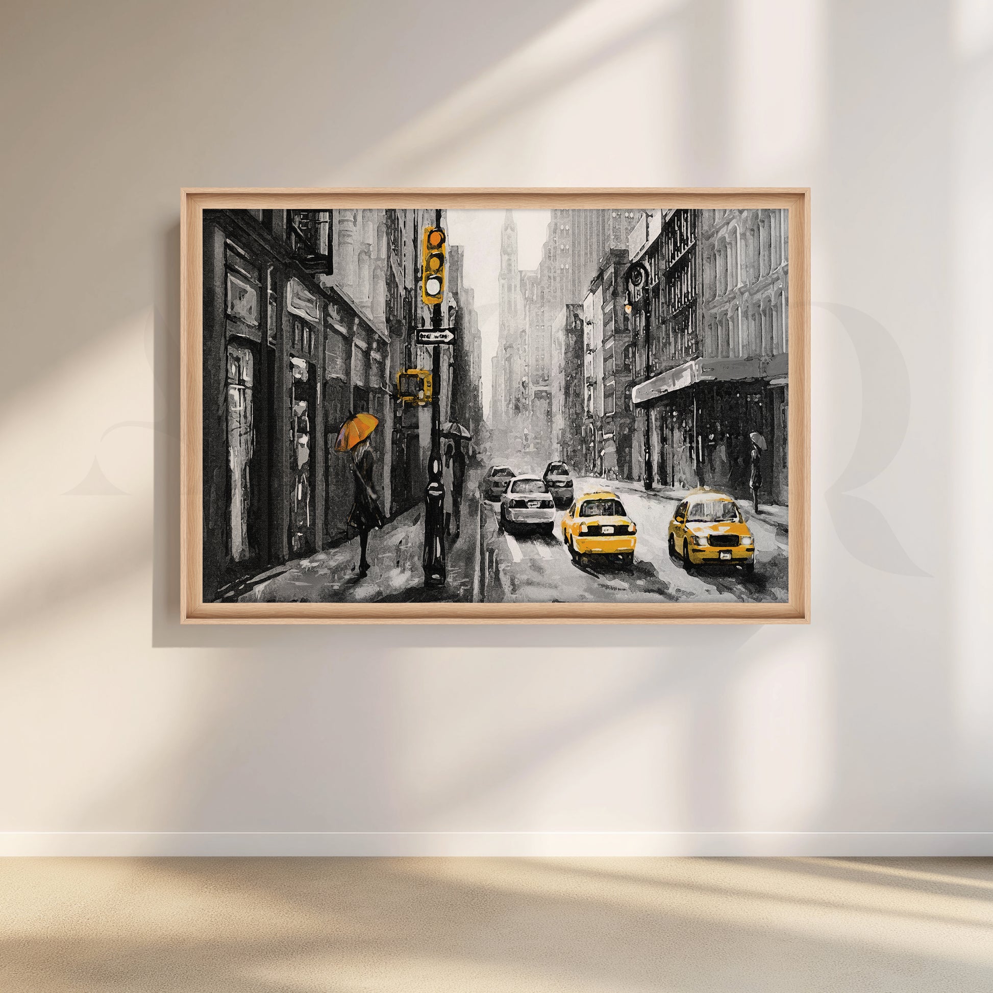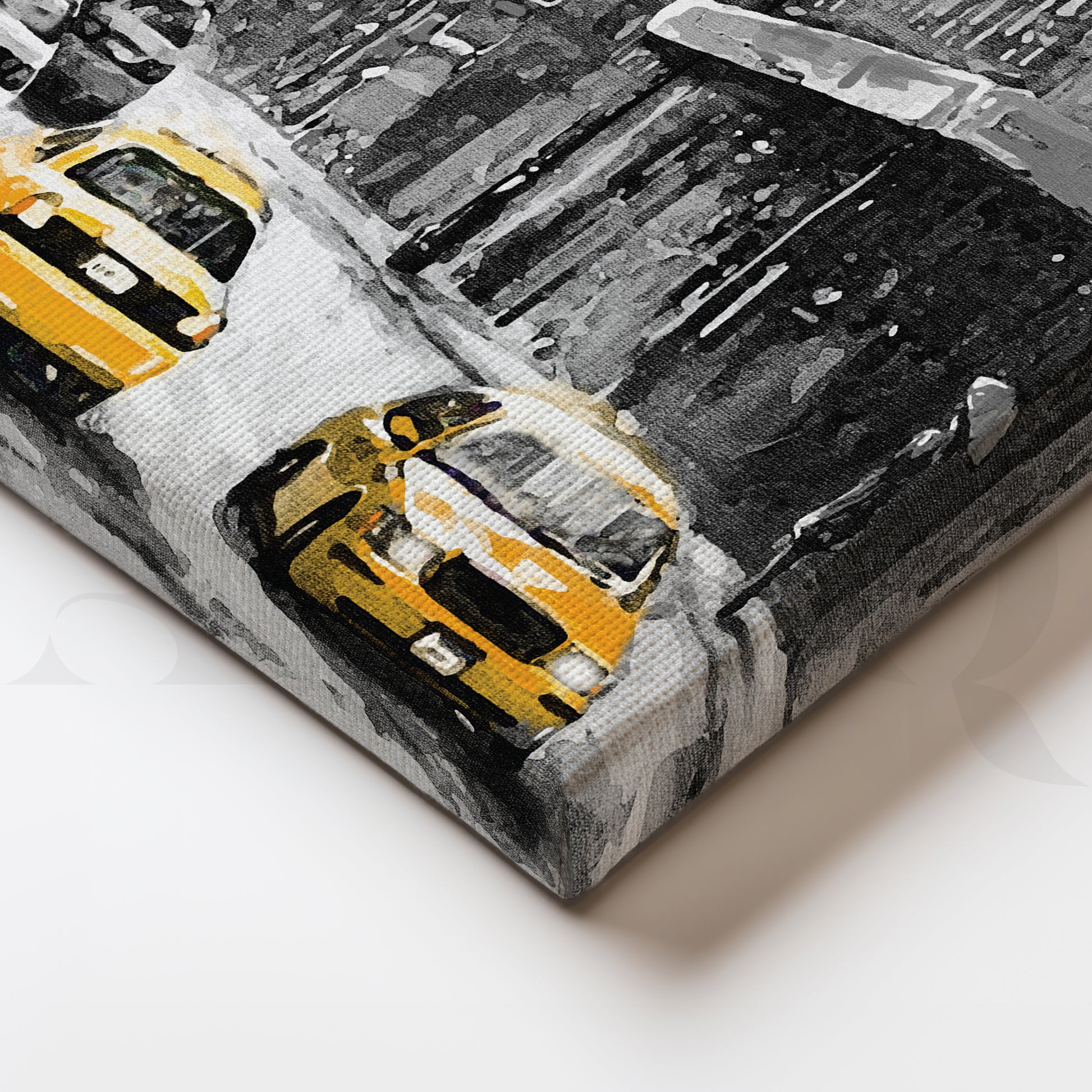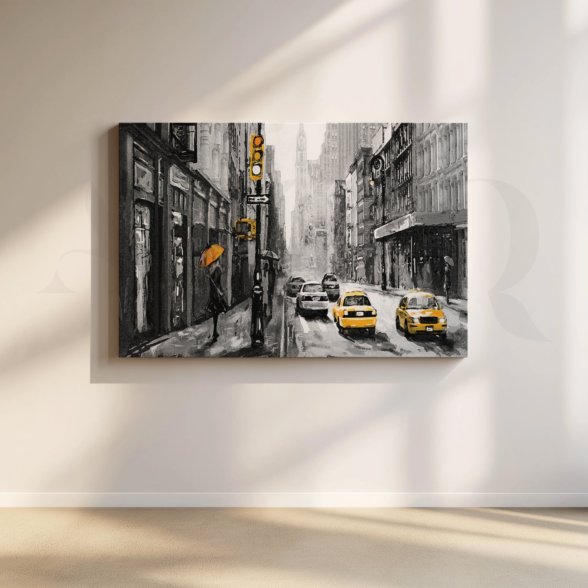 This black and white canvas photo captures the energy of the busy streets of New York City. A yellow taxi and a woman with an umbrella add pops of color to an otherwise monochromatic scene. This masterpiece would make a great addition to any home or office.