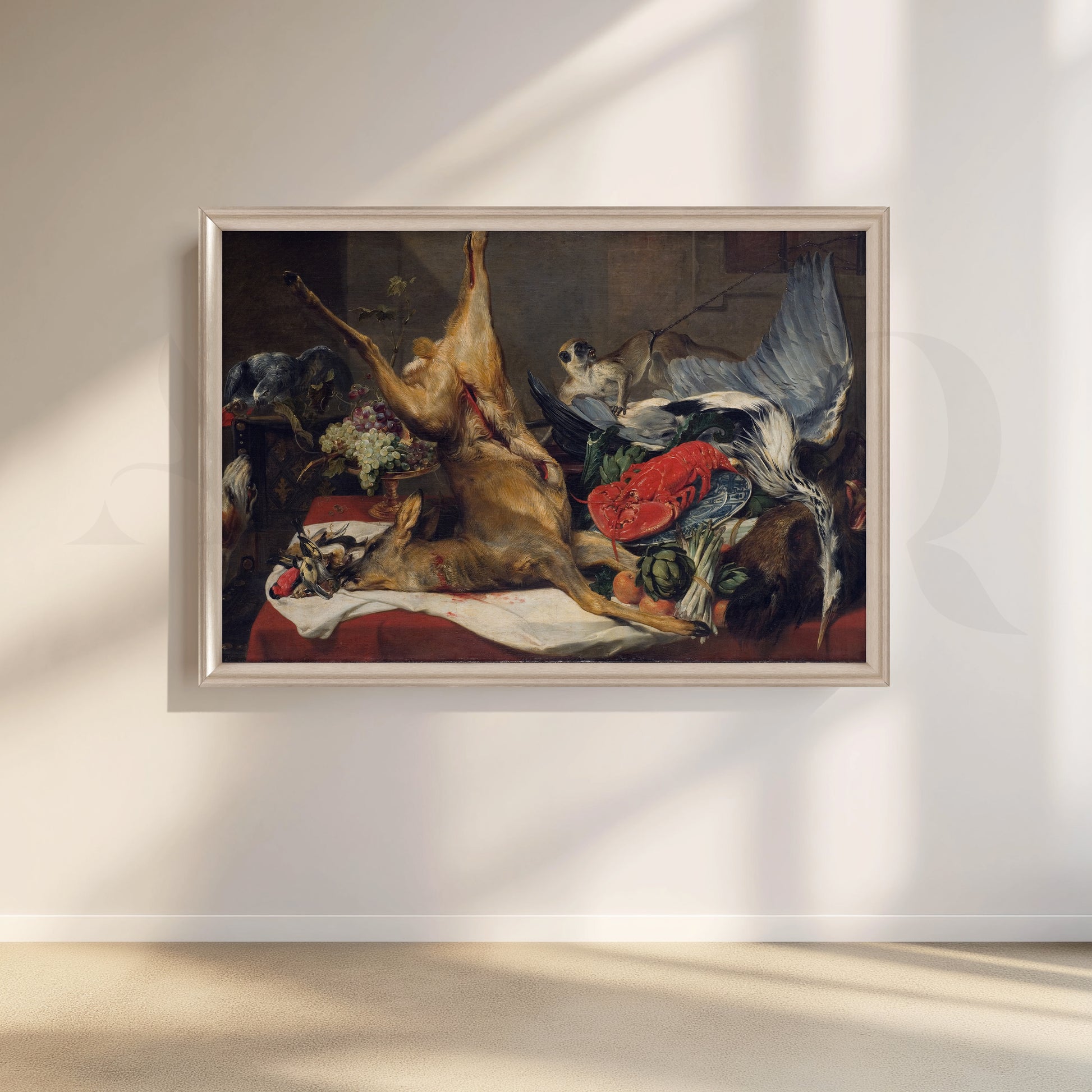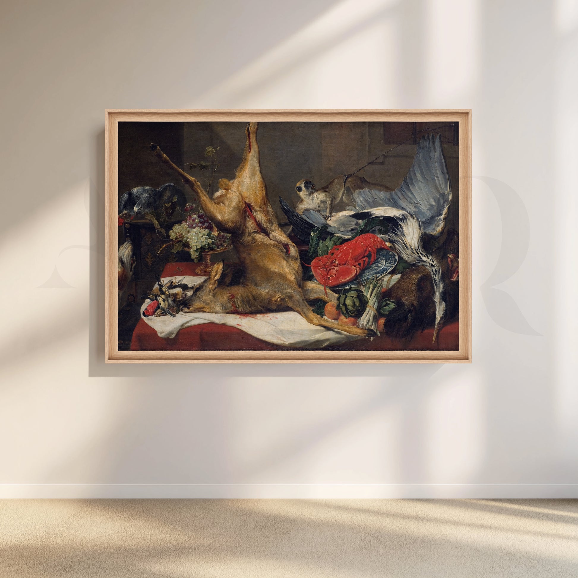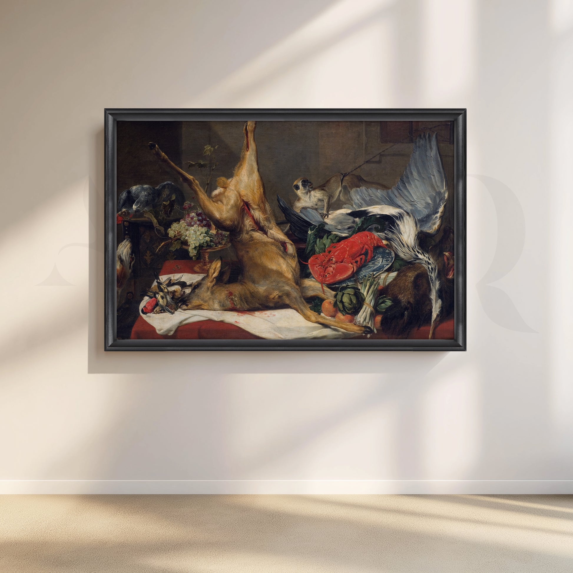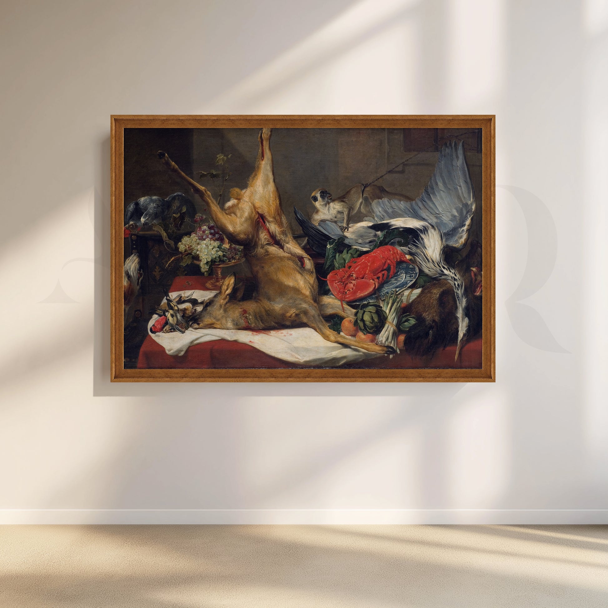 This dramatic Anciq artwork captures the grandeur of classic hunting still-life scenes with vivid details of game, fruits, and rich textures. Perfect for living rooms or heritage-inspired spaces. Keywords: baroque wall art, classic still-life painting, hunting decor canvas, vintage luxury wall art, European traditional artwork.