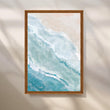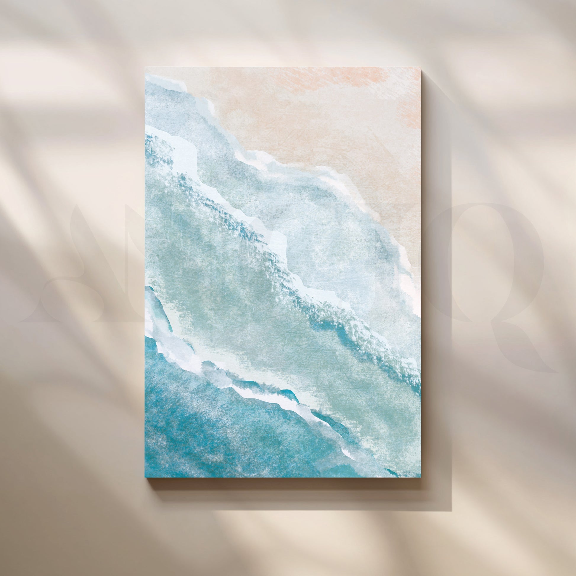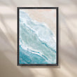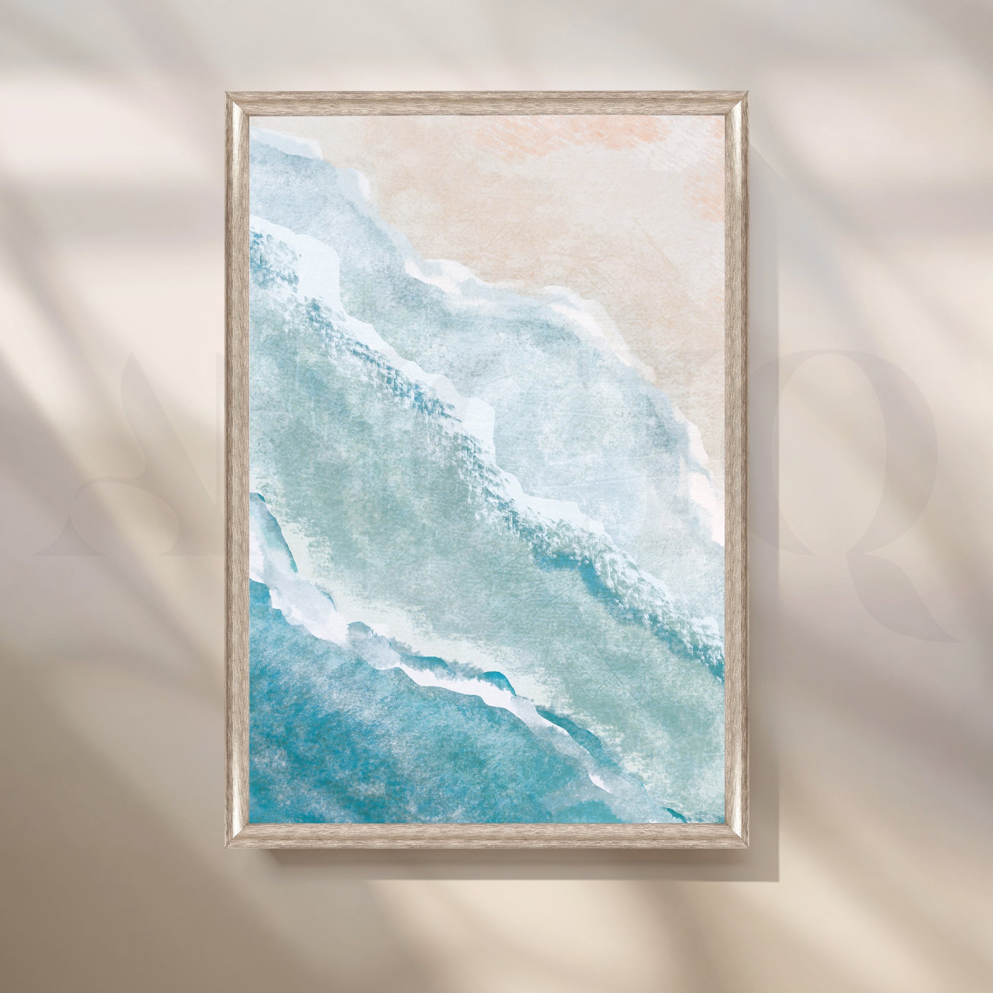 Capture the tranquility of the ocean with this mesmerizing painting. Lush blues and greens depict rolling waves crashing gently on the shore. This original artwork will bring a touch of serenity to any space. Available framed upon request.