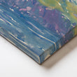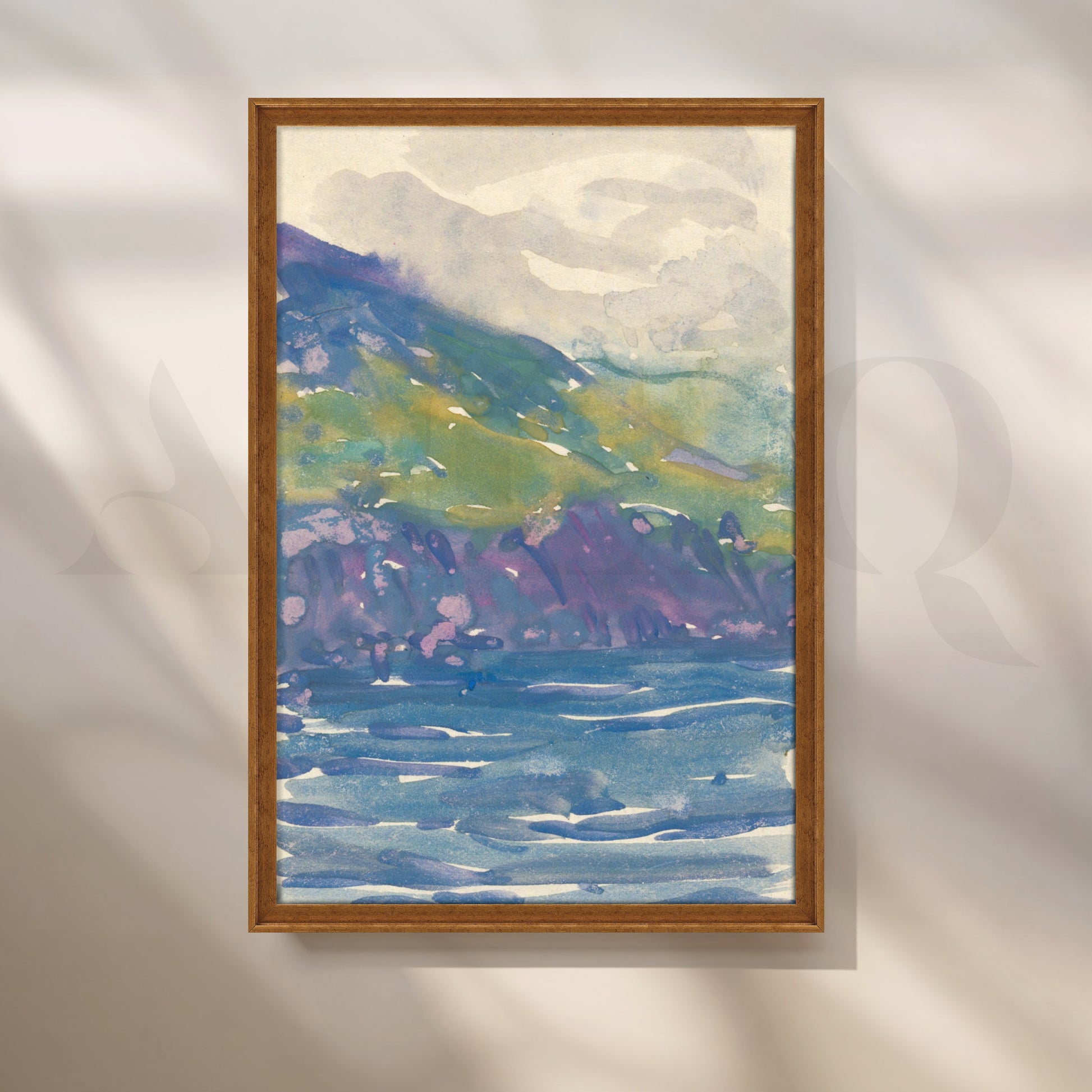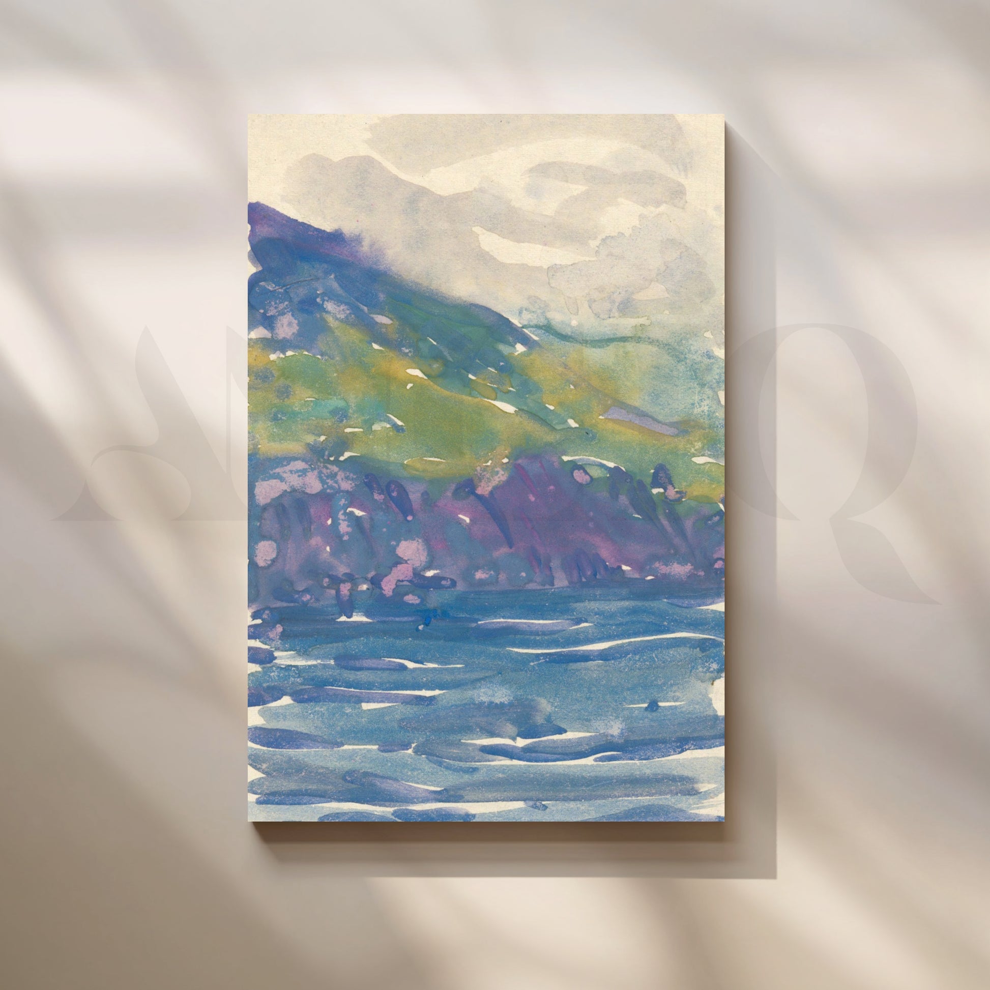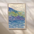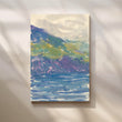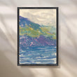 Fresh watercolor sweeps of violet cliffs and verdant hills fall into a cool blue sea. This bright, airy landscape enlivens hallways, stairwells and entryways without overwhelming the space. Keywords: coastal landscape print, watercolor mountain seascape, hallway wall décor, modern canvas art, blue green artwork, beach house style.
