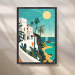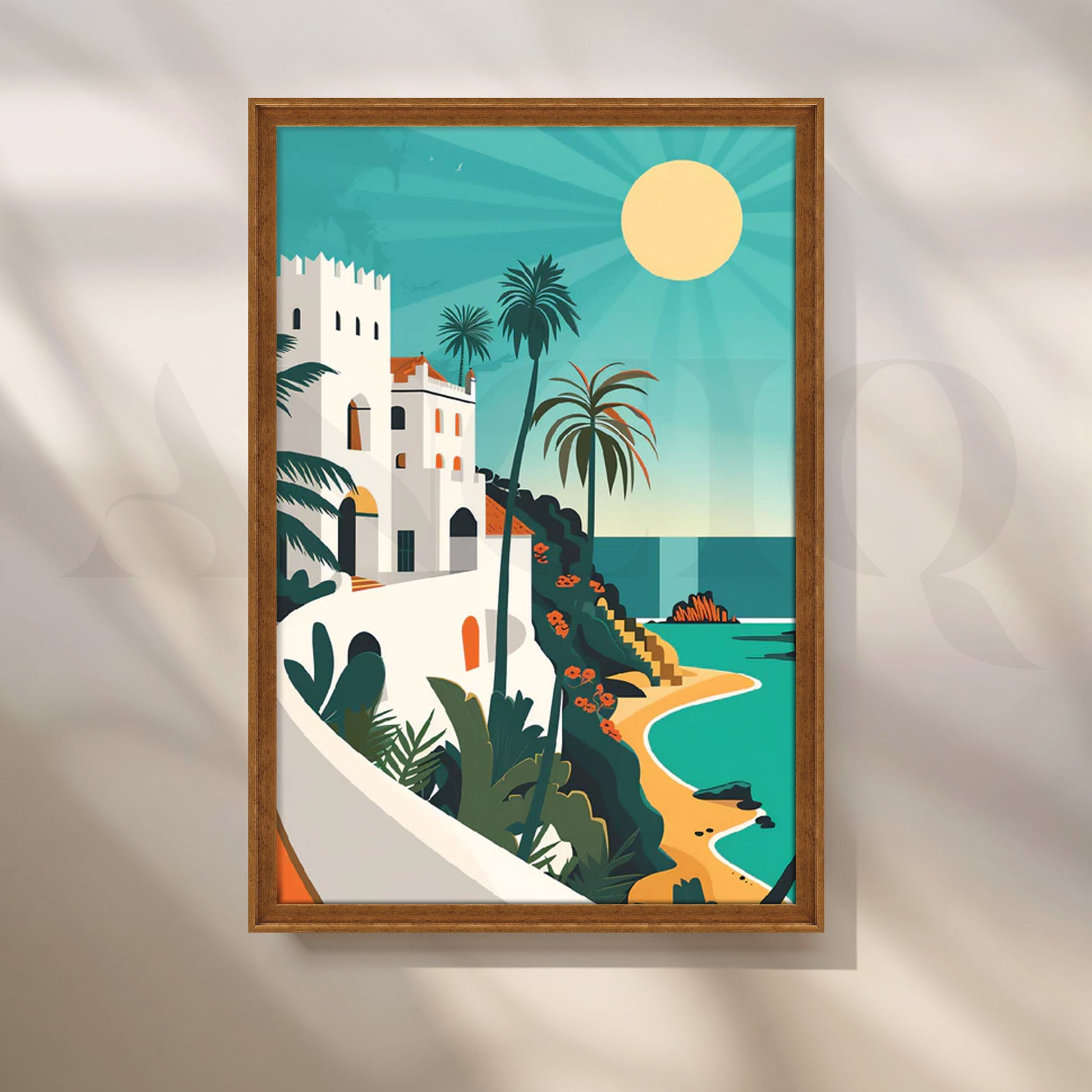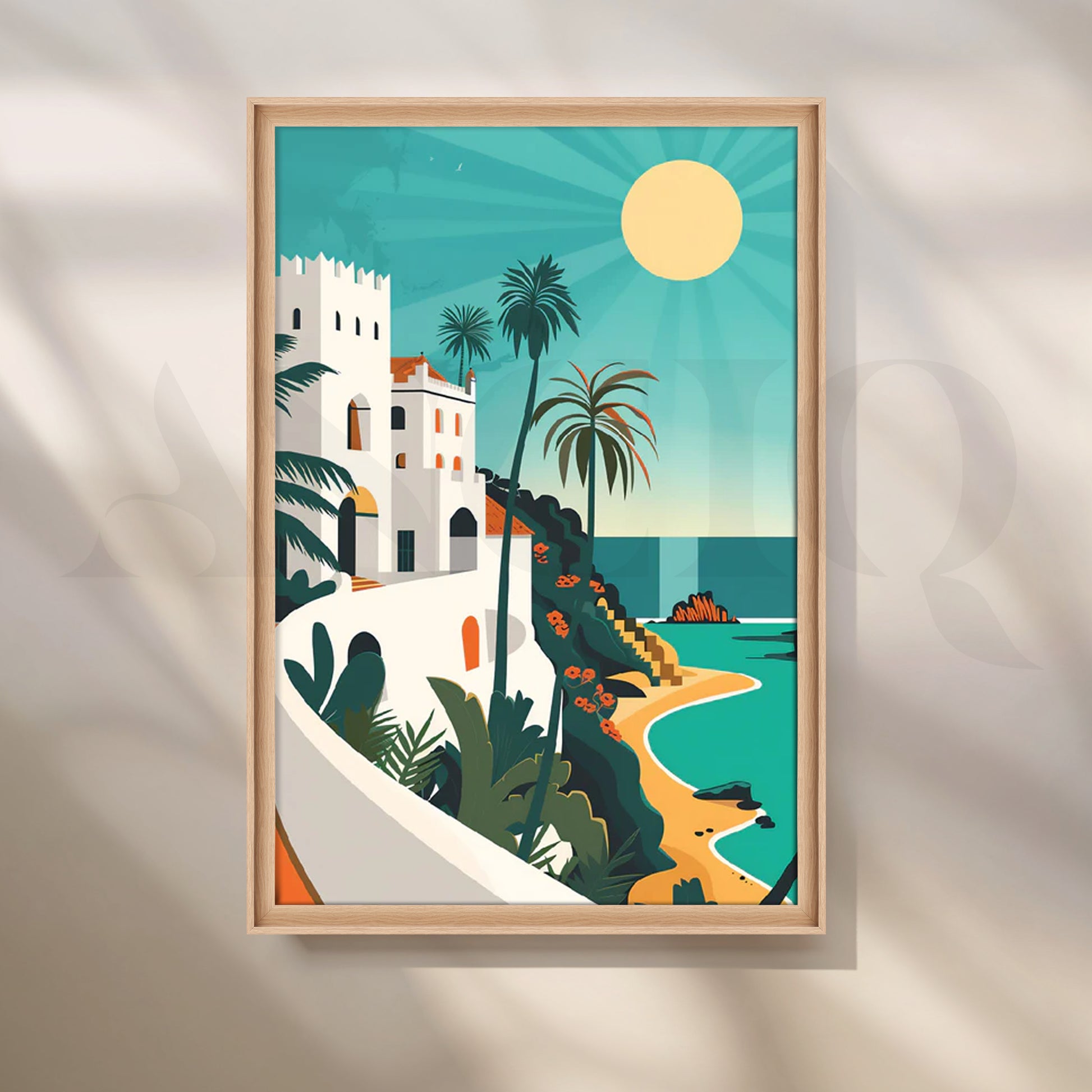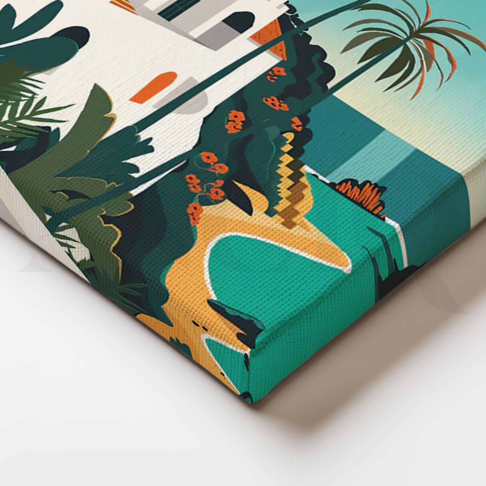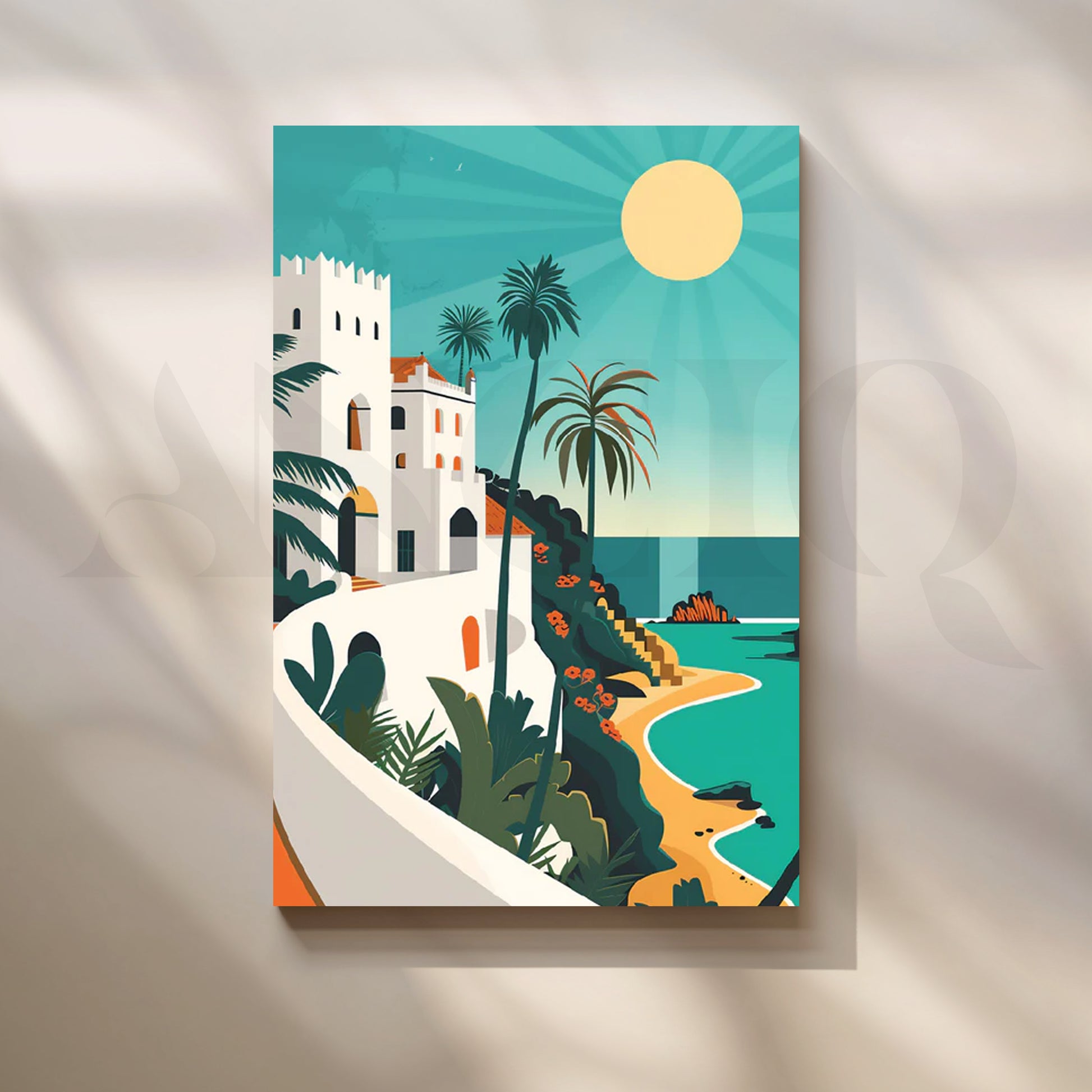 Escape to the Riviera with “Mediterranean Sun Coast,” a vibrant coastal canvas featuring a white hillside villa, swaying palms, golden sun, and turquoise sea rendered in chic, flat graphic shapes. The sun-washed palette (teal, sand, coral, and cream) and travel-poster style bring breezy vacation energy to any space—perfect as modern wall art above a sofa, coastal kitchen décor, or large dining room statement. This beach canvas painting layers beautifully with rattan, linen, and light woods, adding fresh summer color year-round. Ideal for coastal interiors, boho apartments, and airy entryways. Keywords: coastal wall art, beach canvas print, Mediterranean décor, retro travel poster art, modern canvas painting, large living room art, tropical wall décor.
