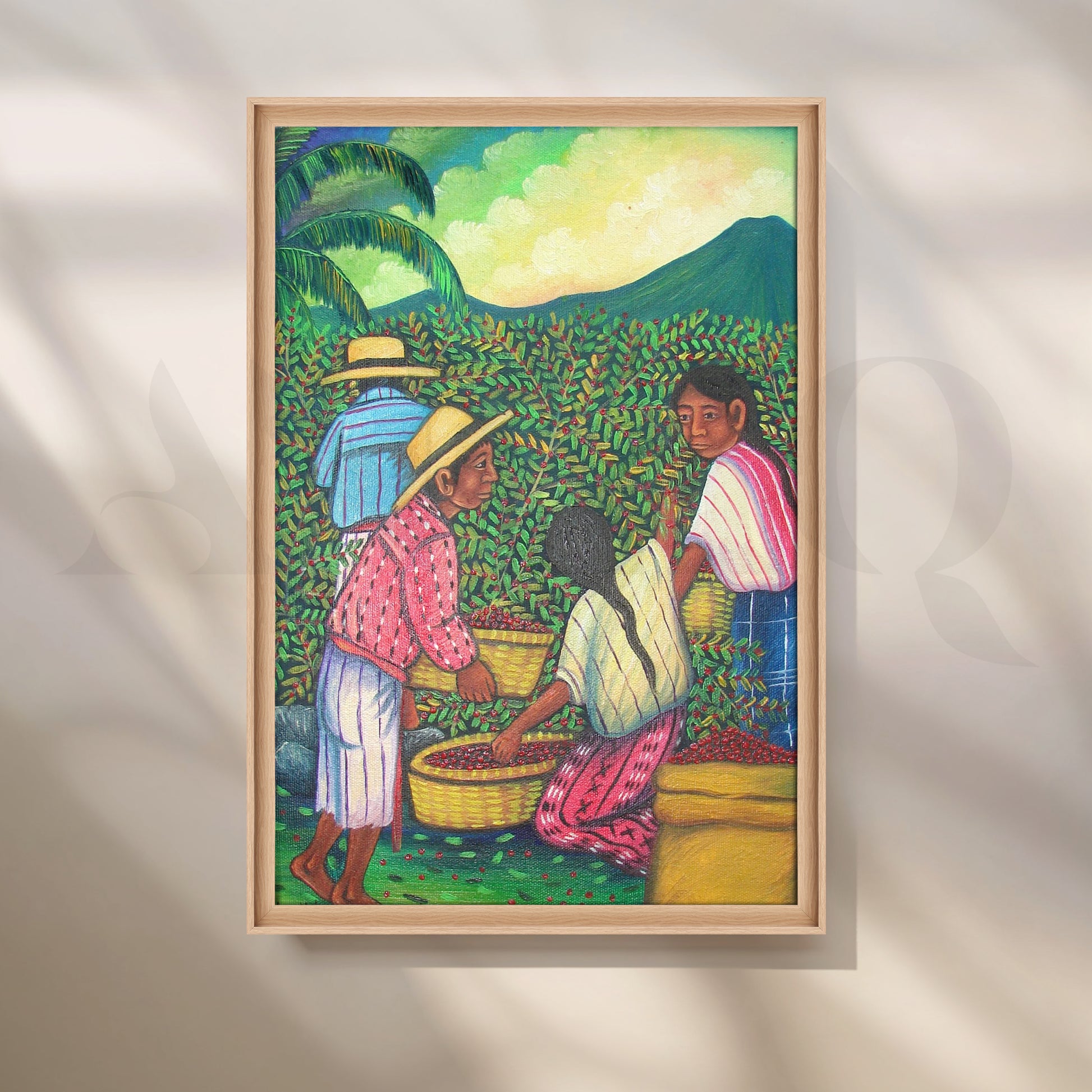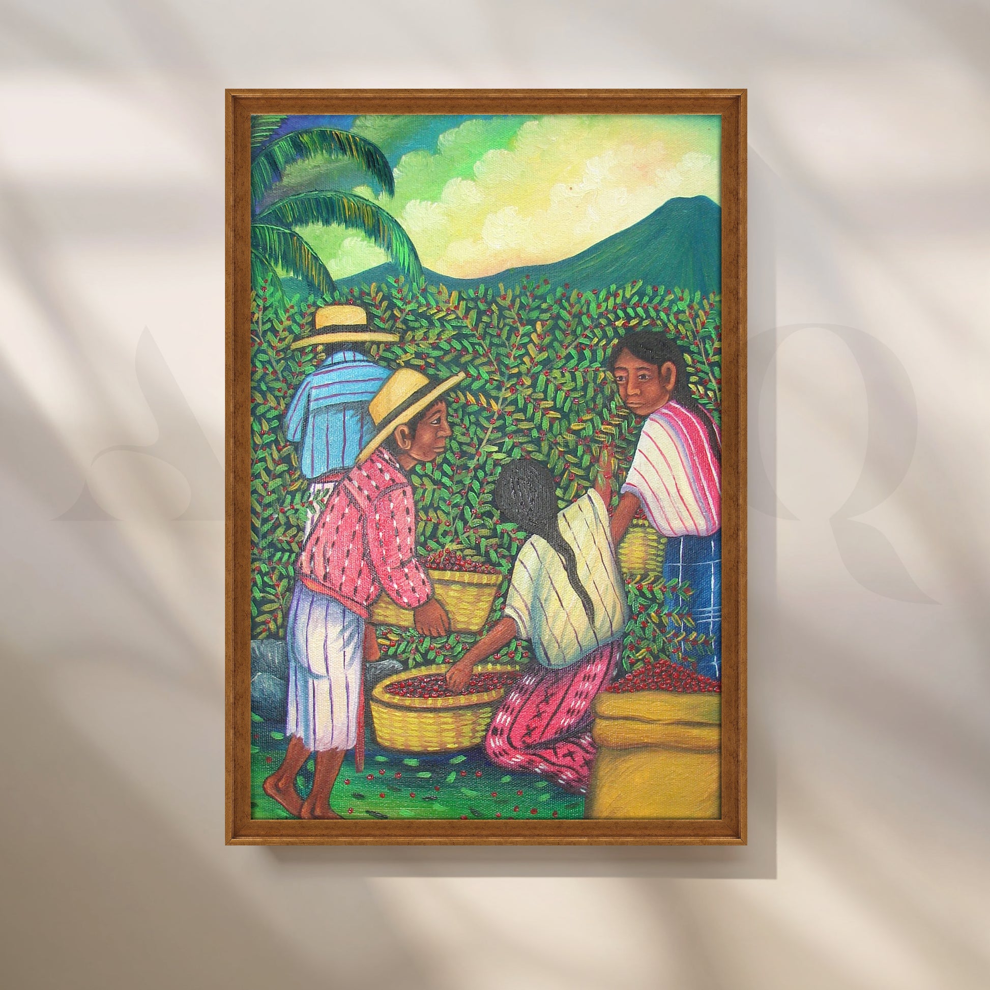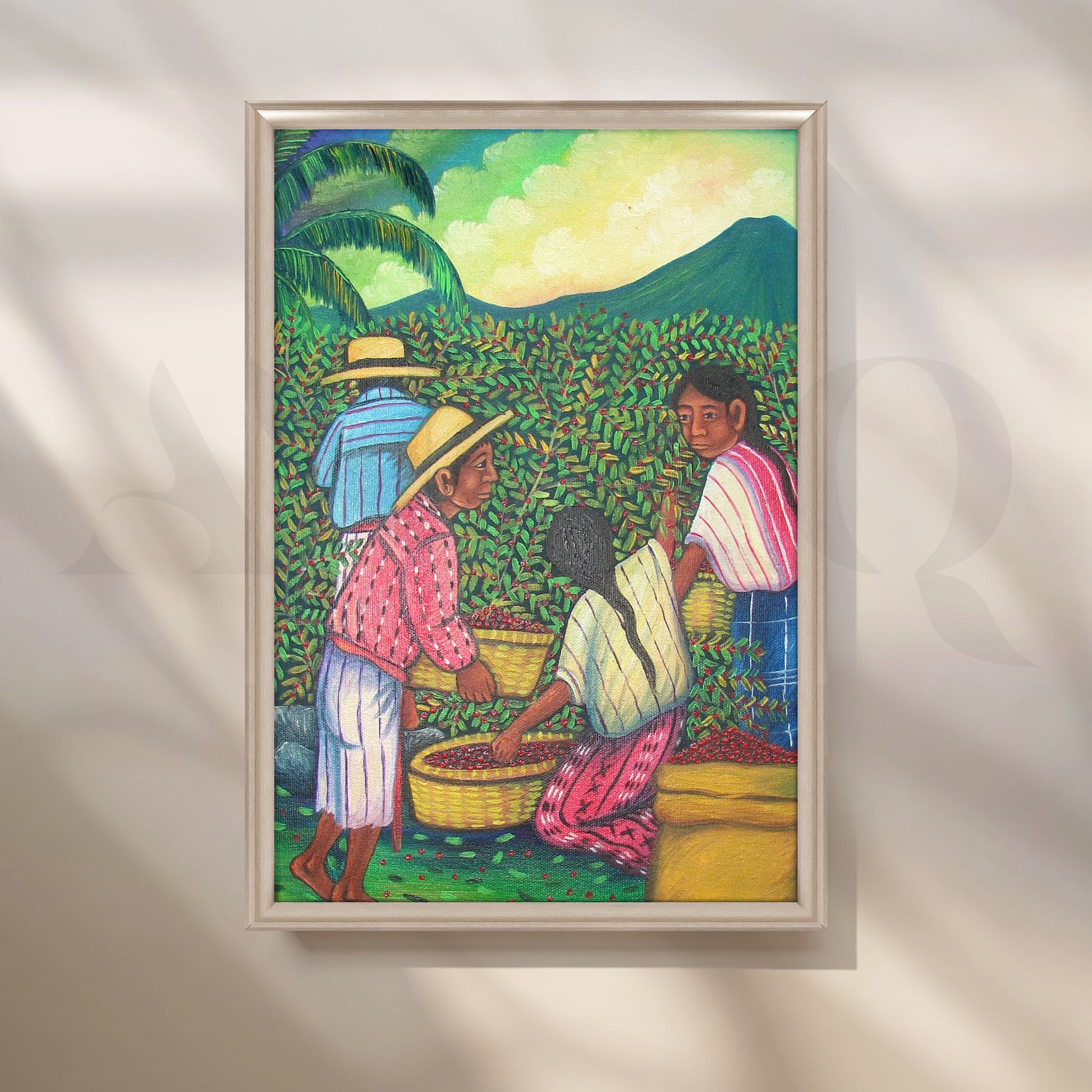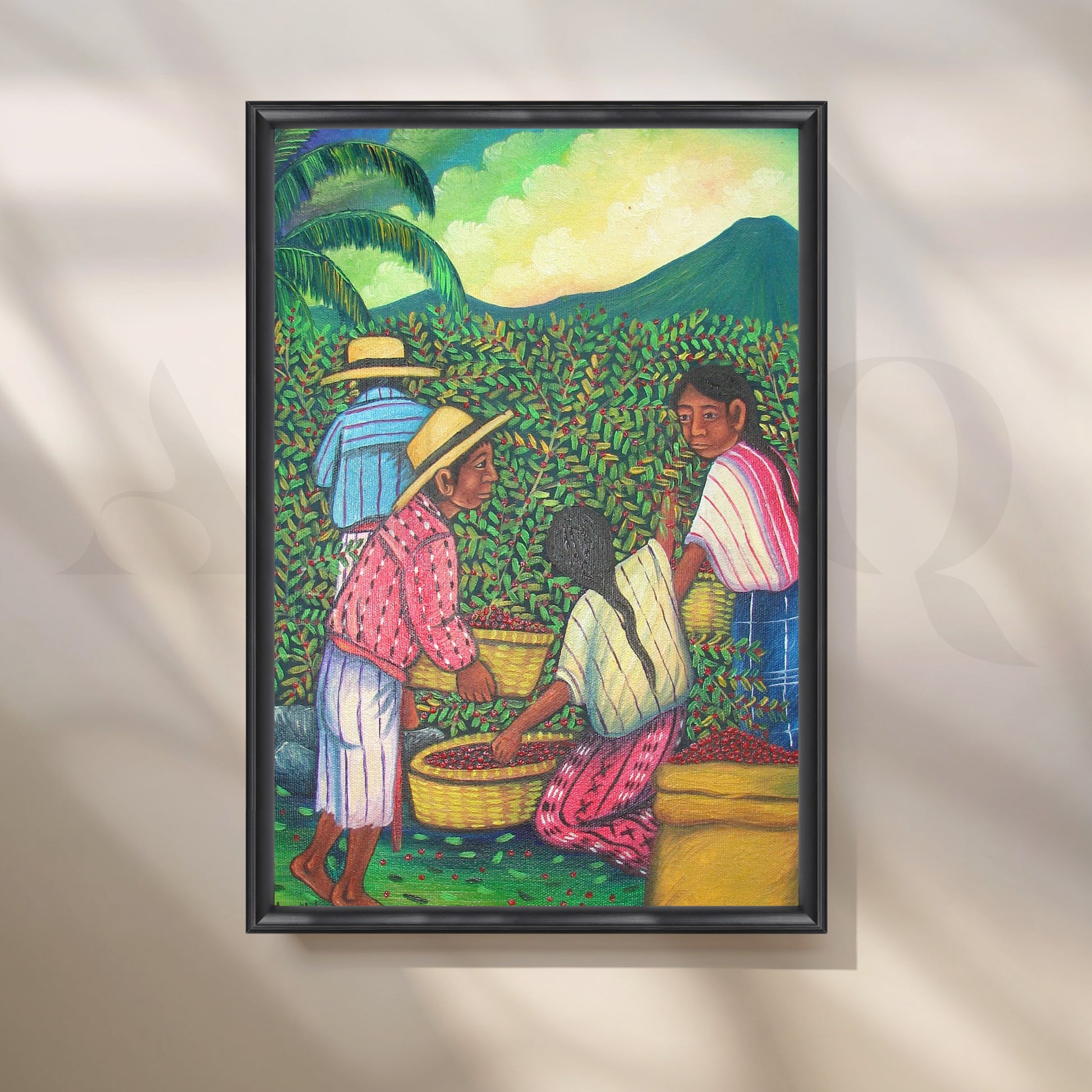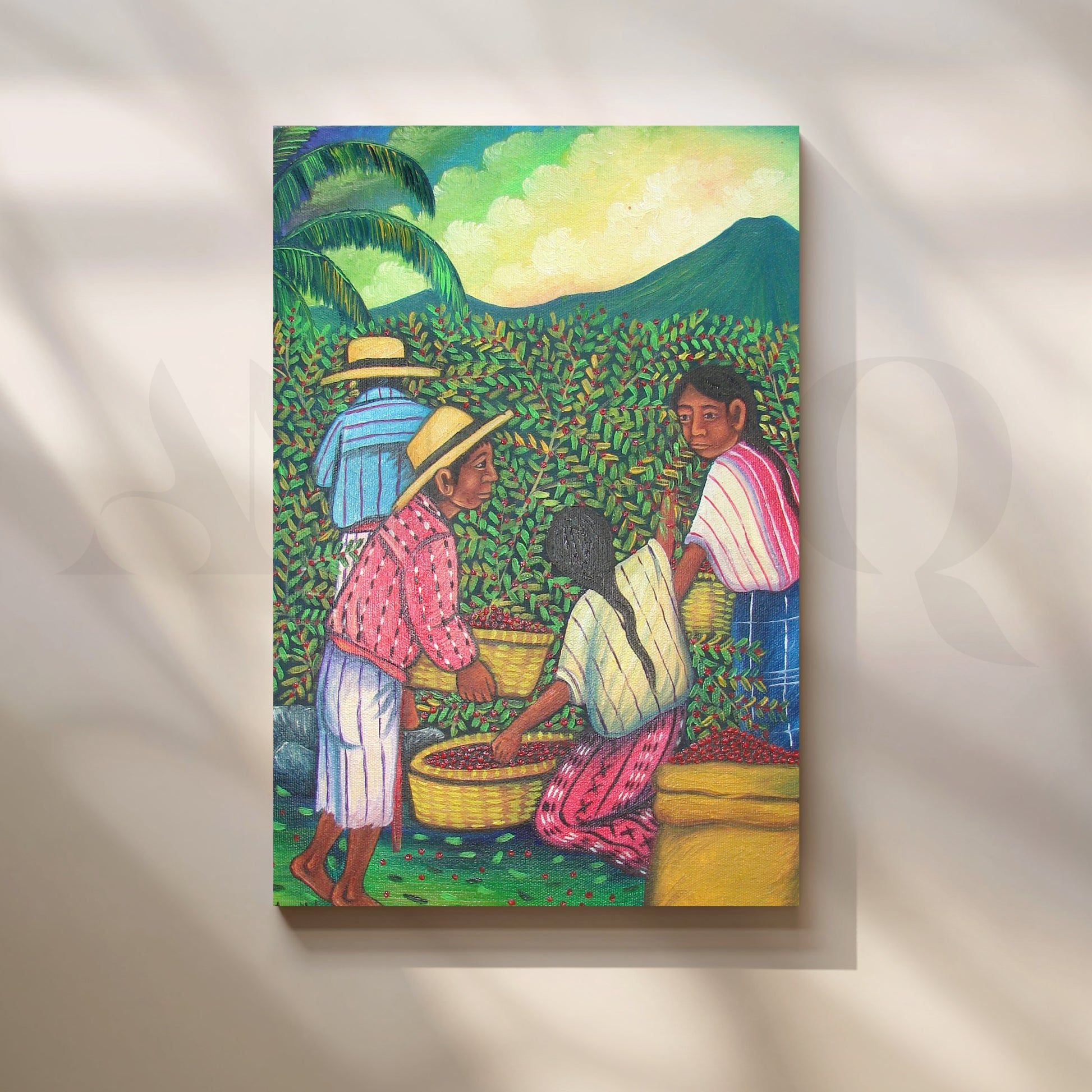 This canvas artwork captures villagers harvesting coffee berries against lush green fields and distant mountains. Bright colors and lively movements reflect rural life and community spirit. Ideal for kitchens, cafés, workspaces, and nature-themed interiors, this piece adds freshness, culture, and a heartfelt connection to everyday living.