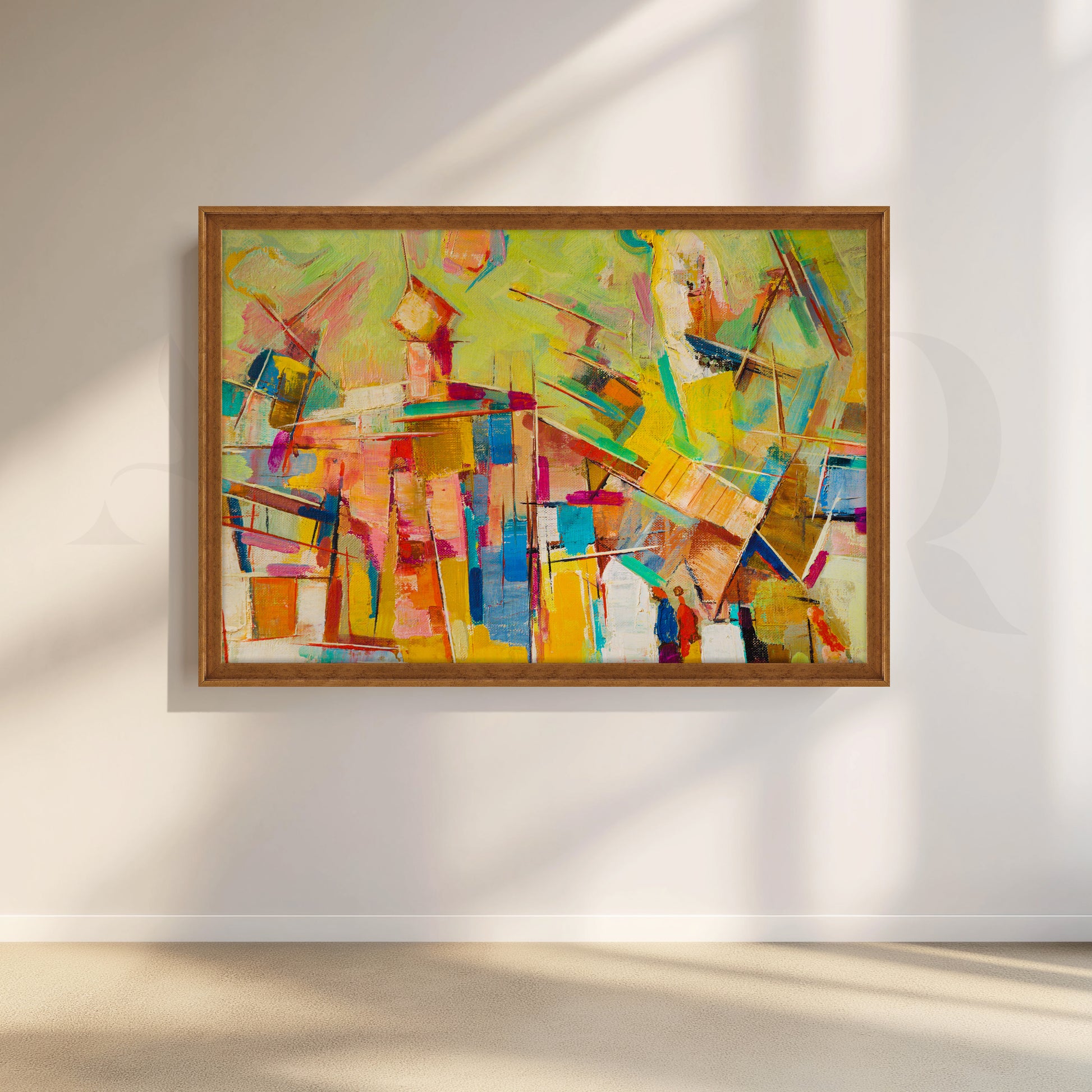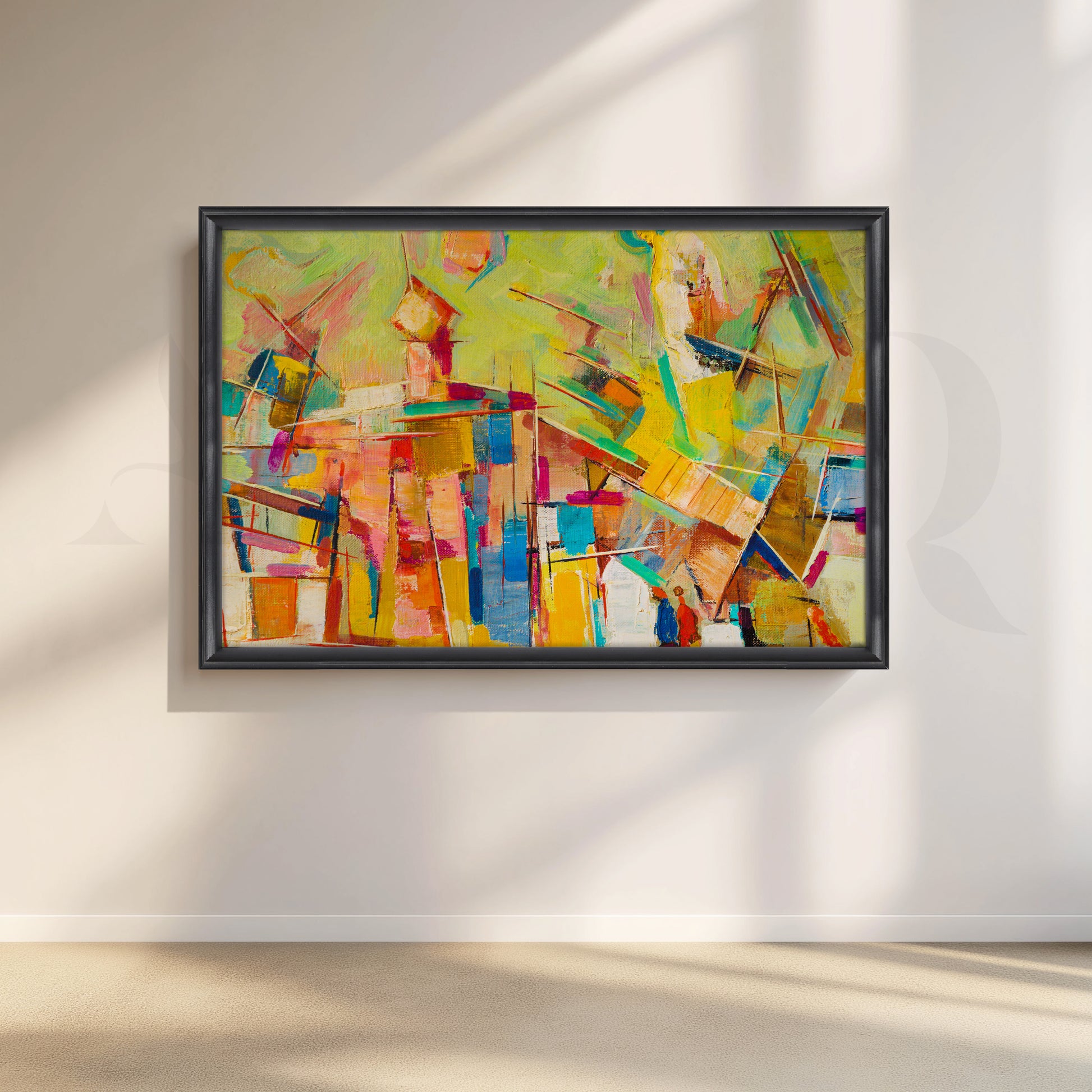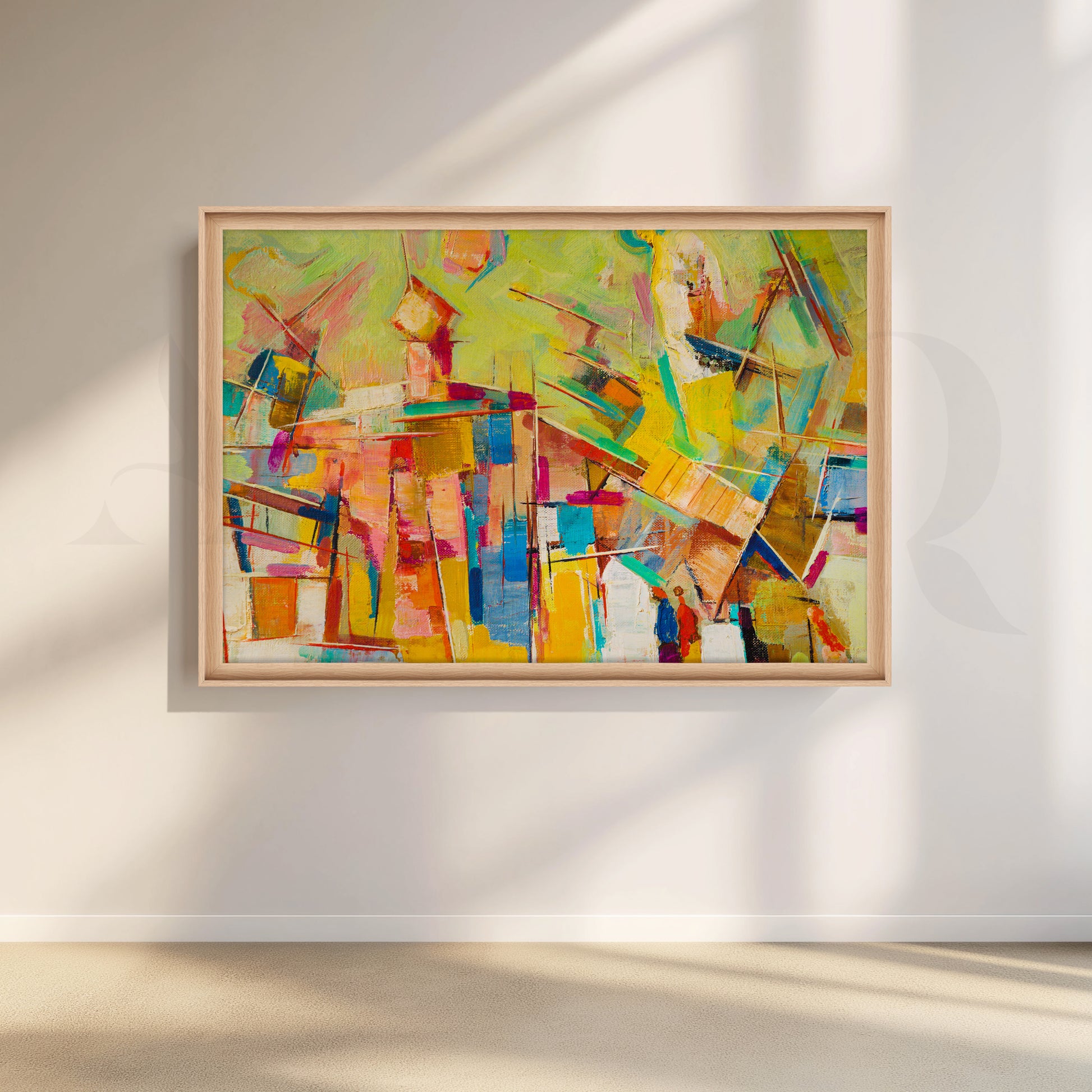 Brighten your space with this abstract colorful canvas painting. Featuring dynamic shapes and vibrant hues, this modern wall art adds a splash of creativity and energy to any room. Perfect for contemporary homes, offices, or artistic spaces.