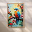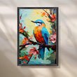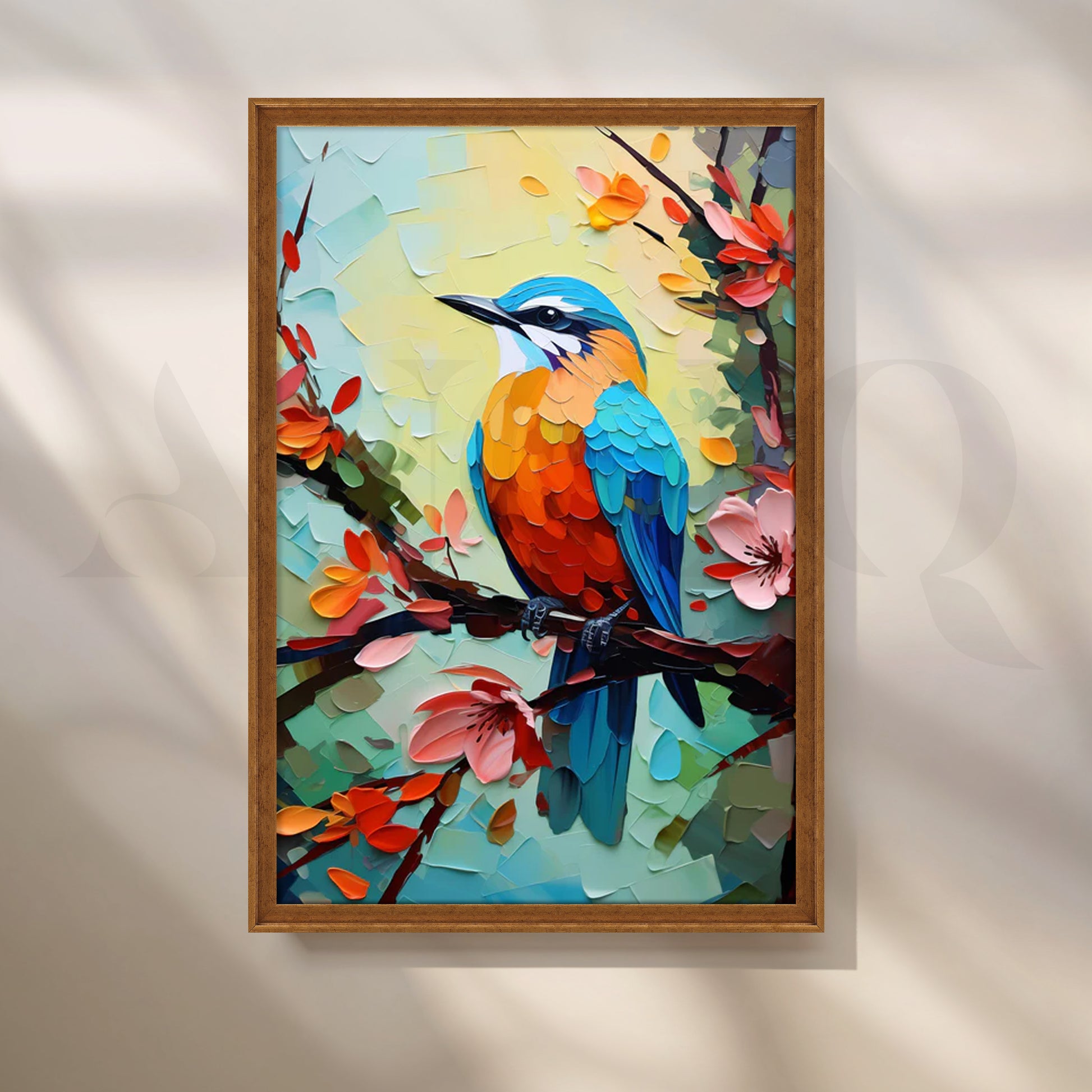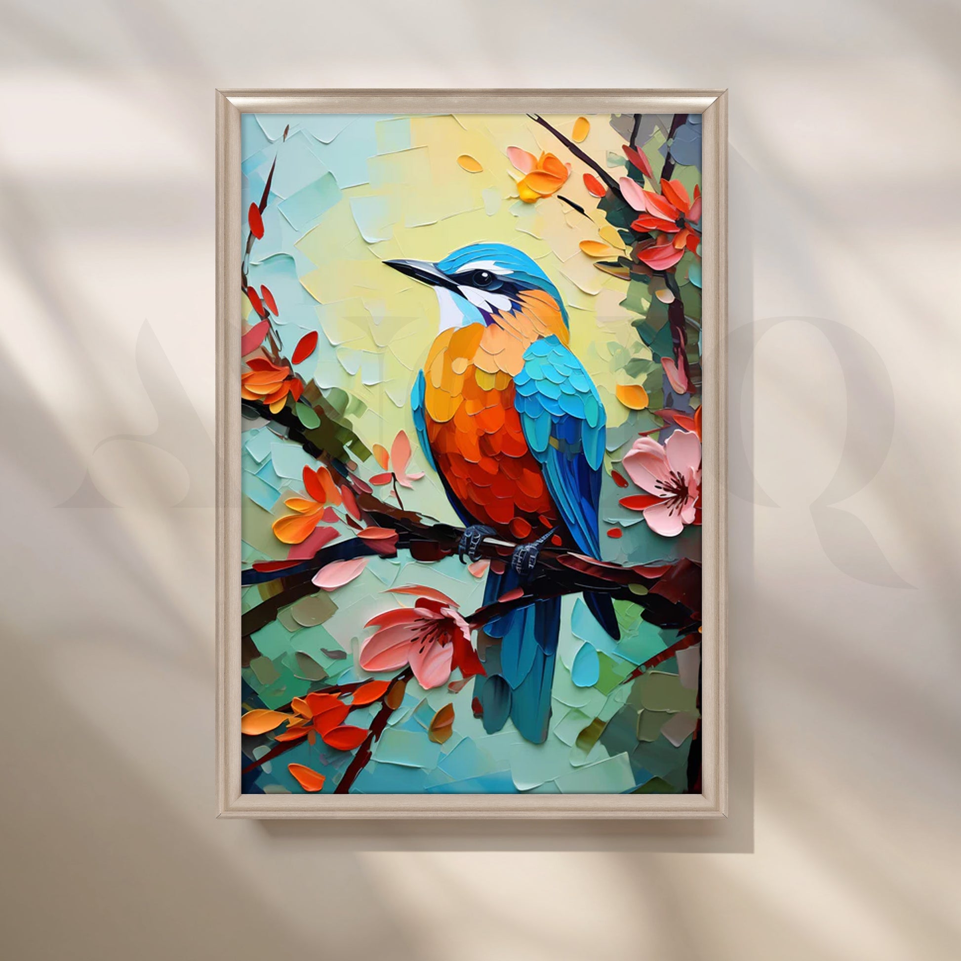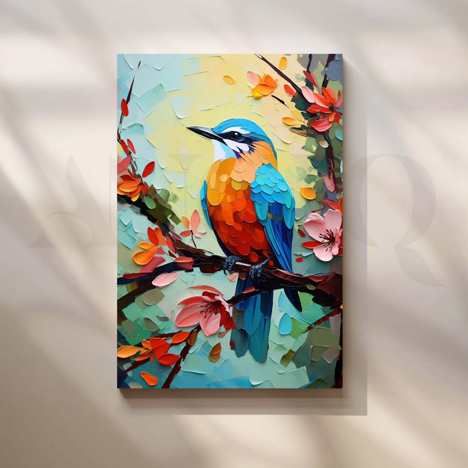 A jewel-toned songbird rests among peach blossoms—teal, aqua, coral, and sunny yellow creating a fresh, springtime mood. This boho bedroom décor doubles as uplifting modern wall art for nurseries, sunrooms, or hallways; a vibrant “abstract canvas painting” feel with crisp details that brightens any space.
