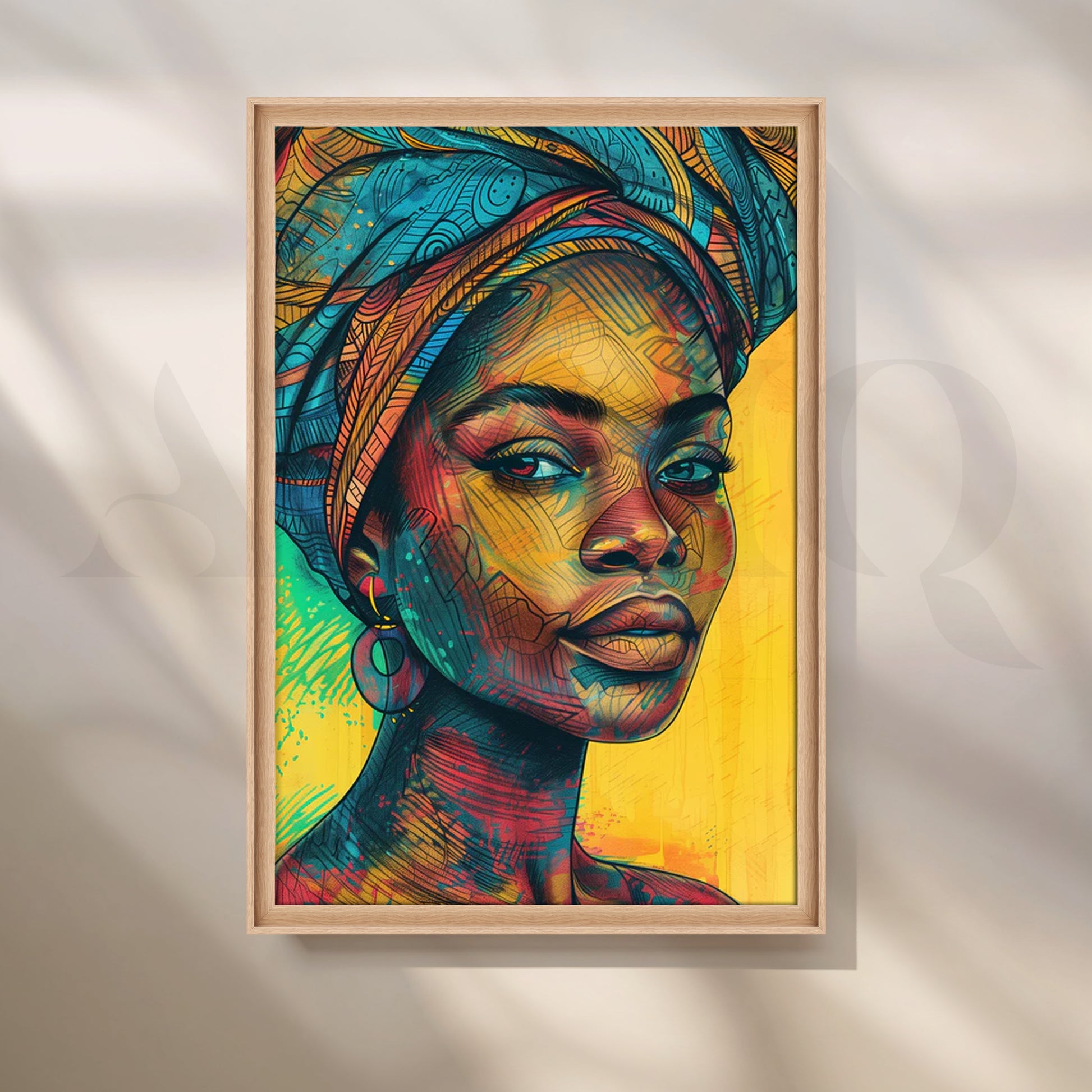 “Serene Heritage” blends intricate linework and warm teal, amber, and coral hues to honor timeless beauty with a contemporary edge. The soft yet detailed portrait creates a calm, uplifting mood—ideal as bedroom wall art, modern portrait canvas, or boho bedroom décor. Style it as a single statement piece or part of a gallery wall to introduce color, culture, and texture to minimalist spaces, guest rooms, and cozy reading nooks.