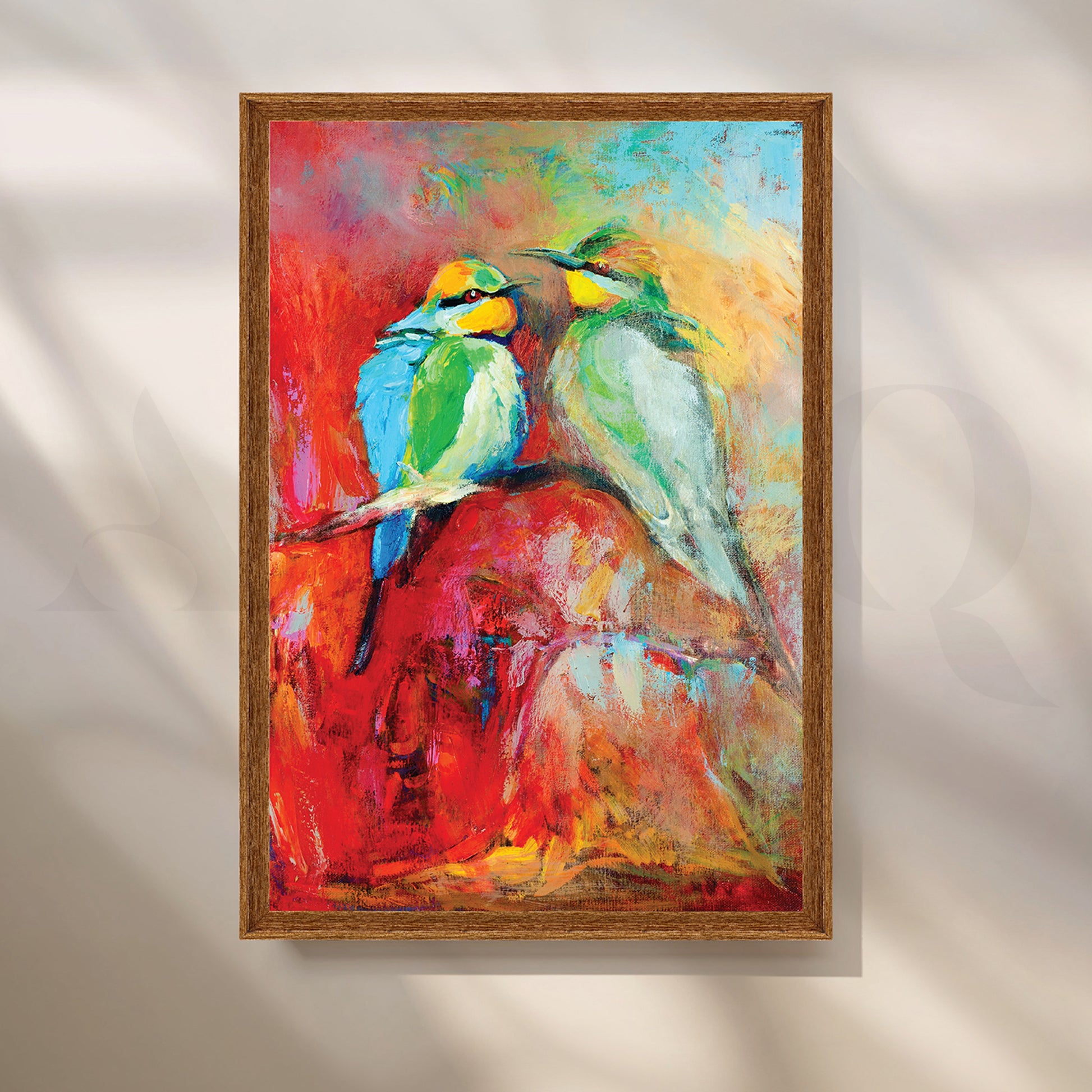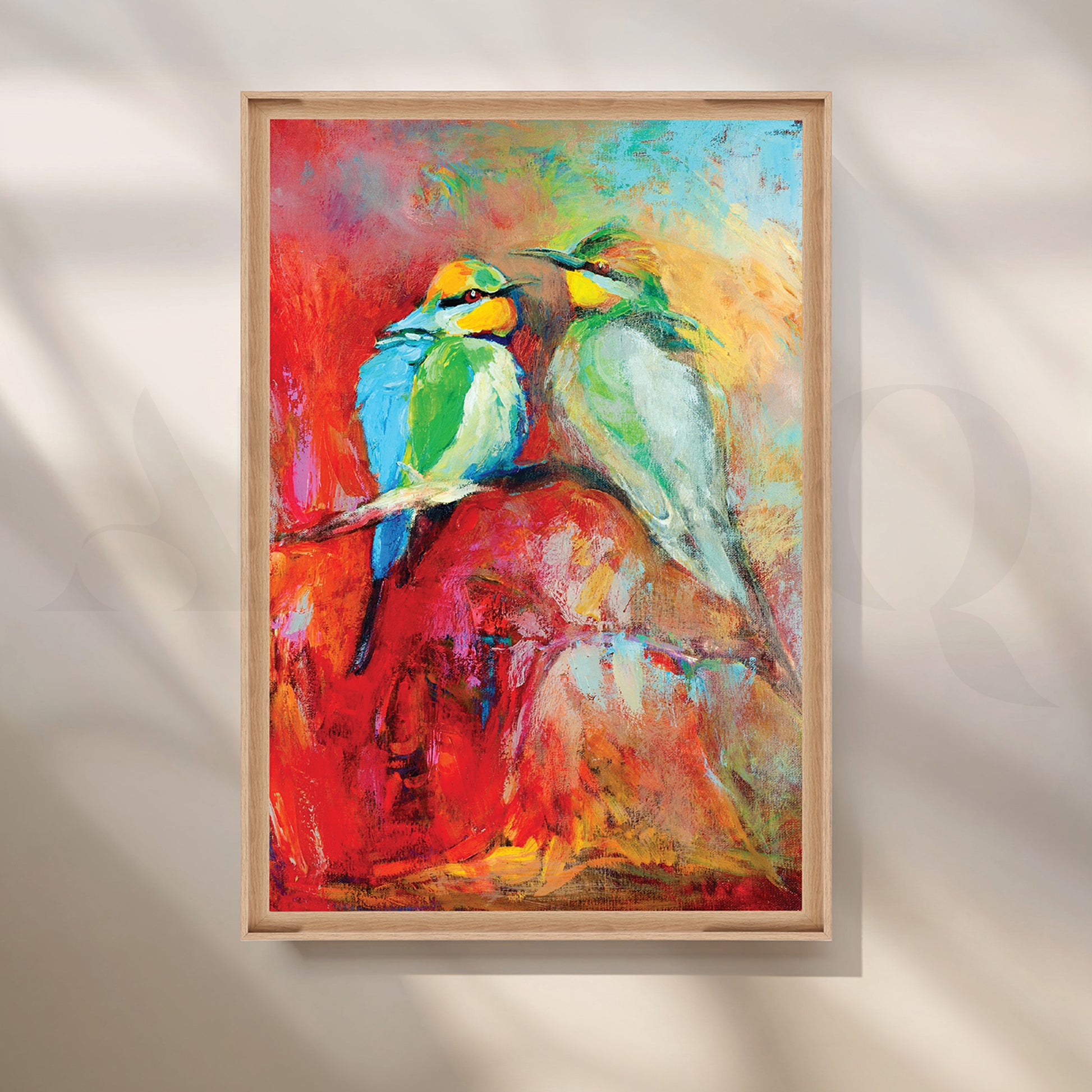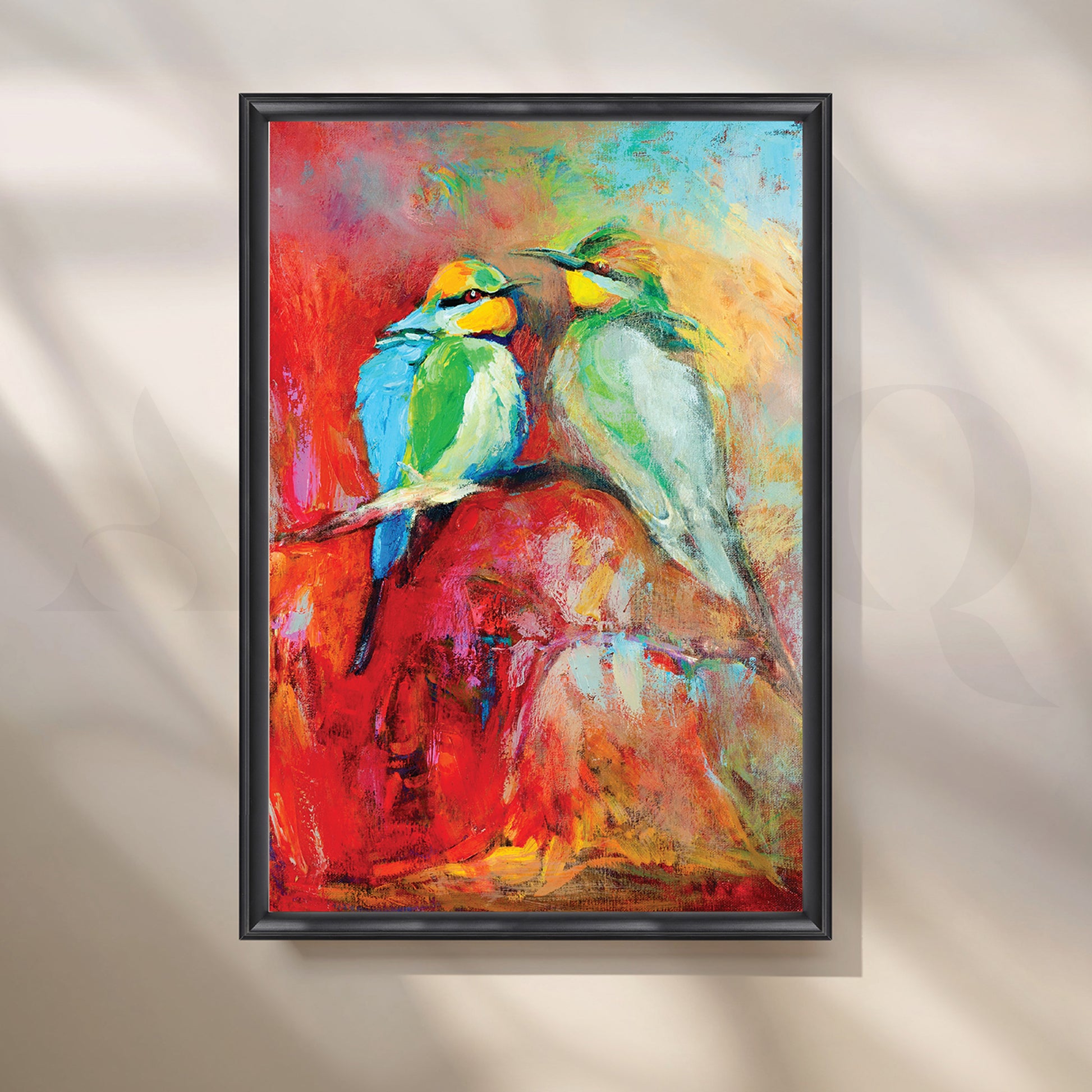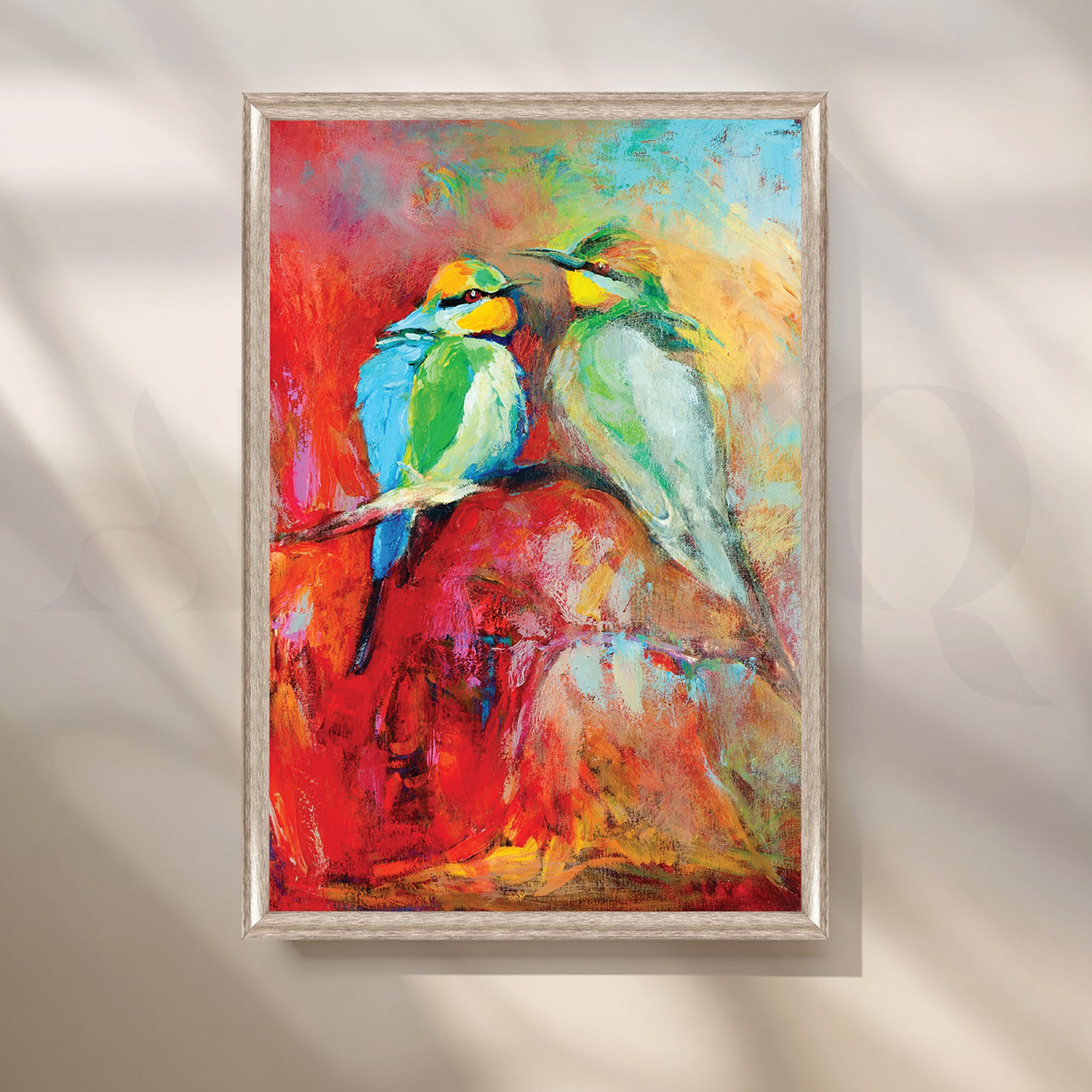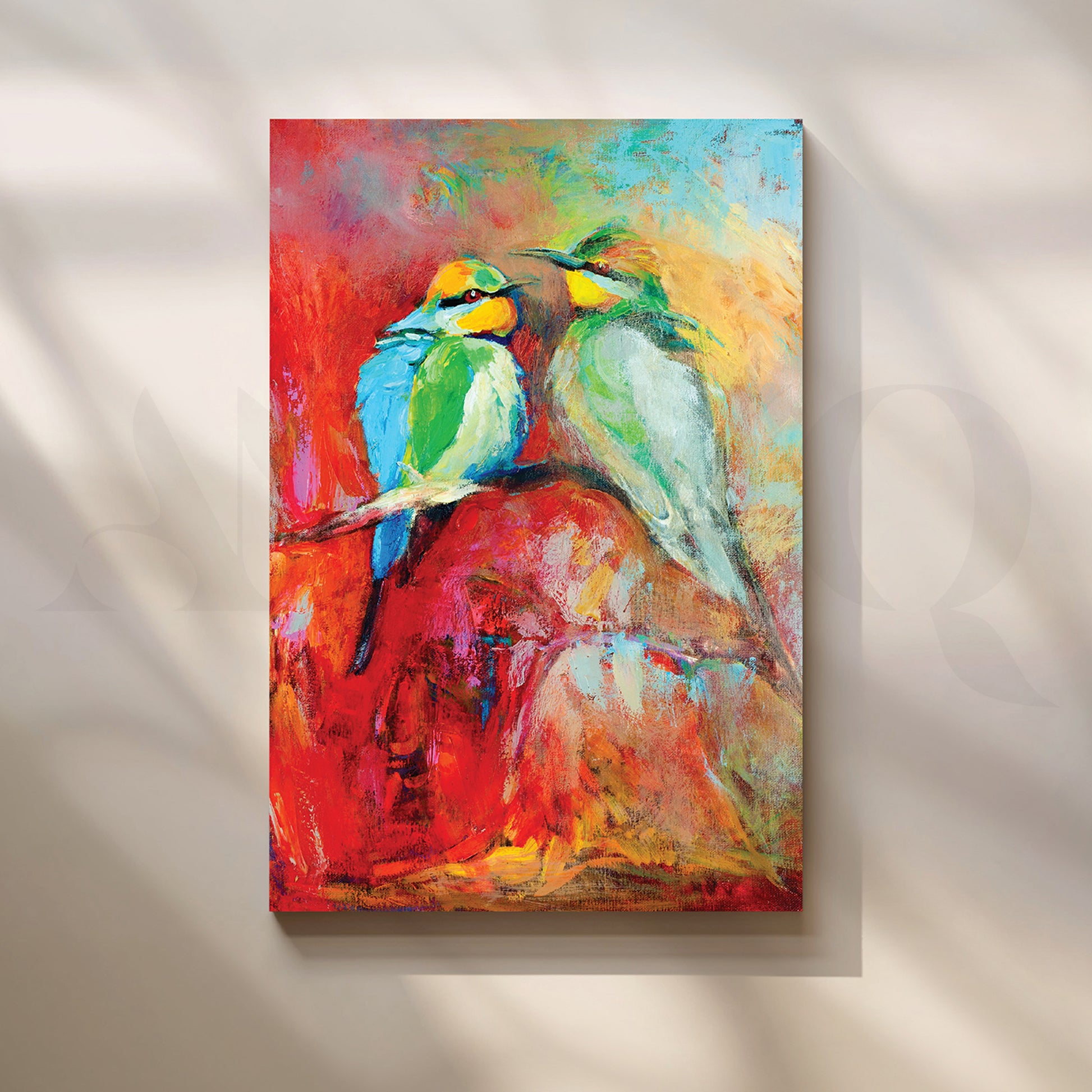 Capture the vibrant elegance of nature with this captivating canvas painting. Two brilliant blue-tailed bee-eaters perch on a branch, their feathers a striking contrast against the textured bark. This piece is a perfect addition for any nature lover, bringing a touch of the outdoors and the beauty of birds into your home.
