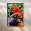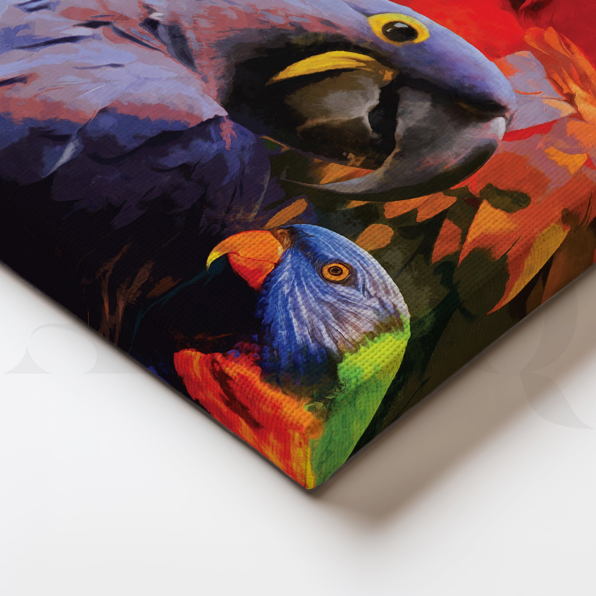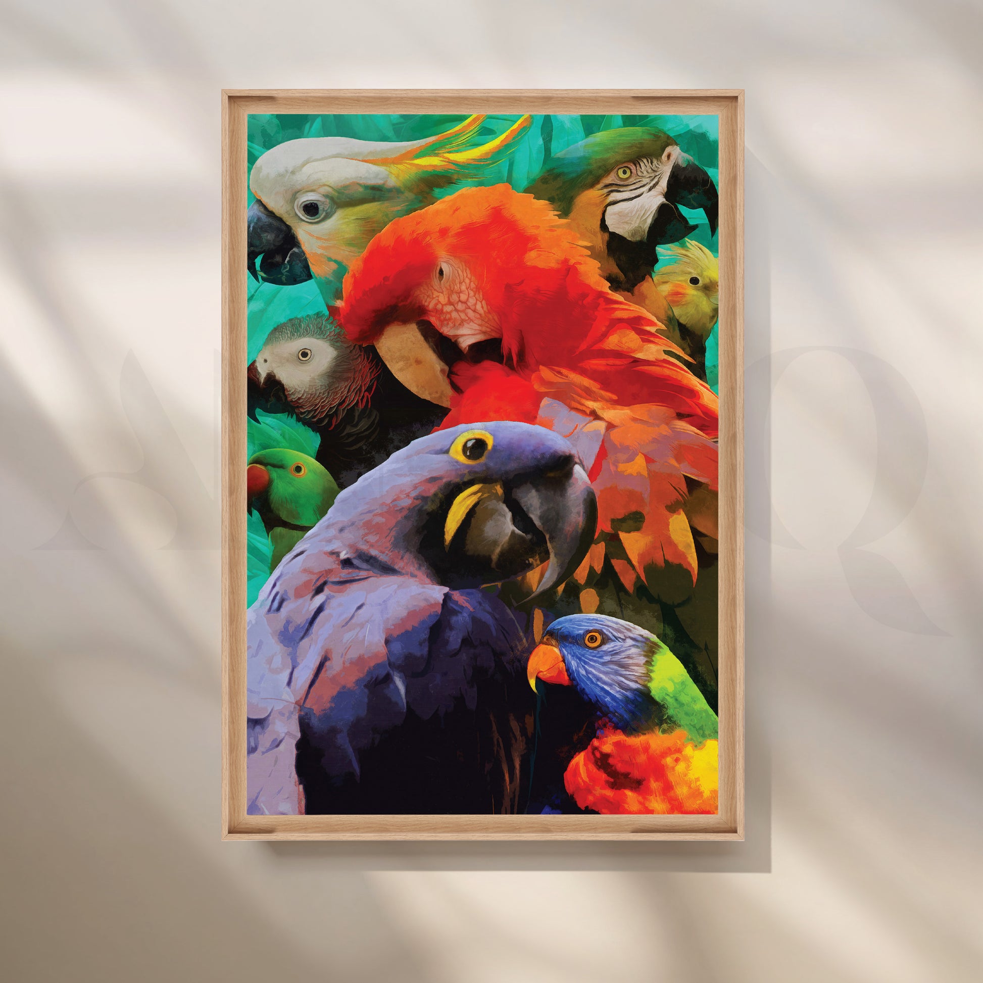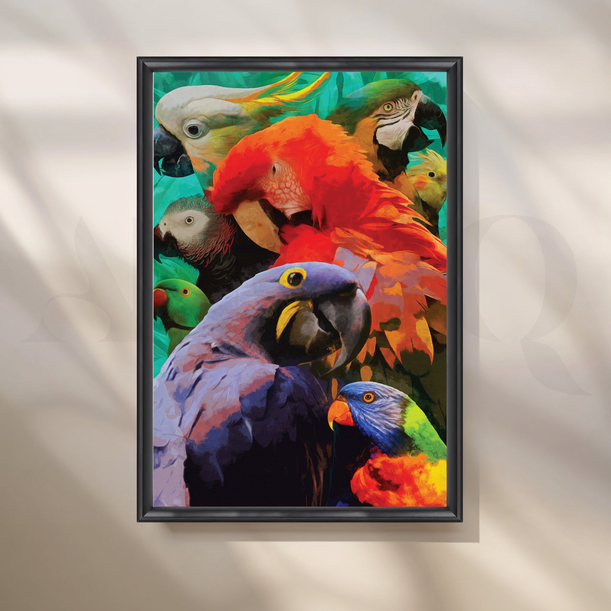 Bring a vibrant flock of joy to your walls! This captivating painting bursts with colorful parrots, their feathers a symphony of red, green, and blue. Each bird playfully perches, a testament to the beauty and companionship found in nature. An eye-catching addition to any room.