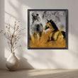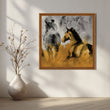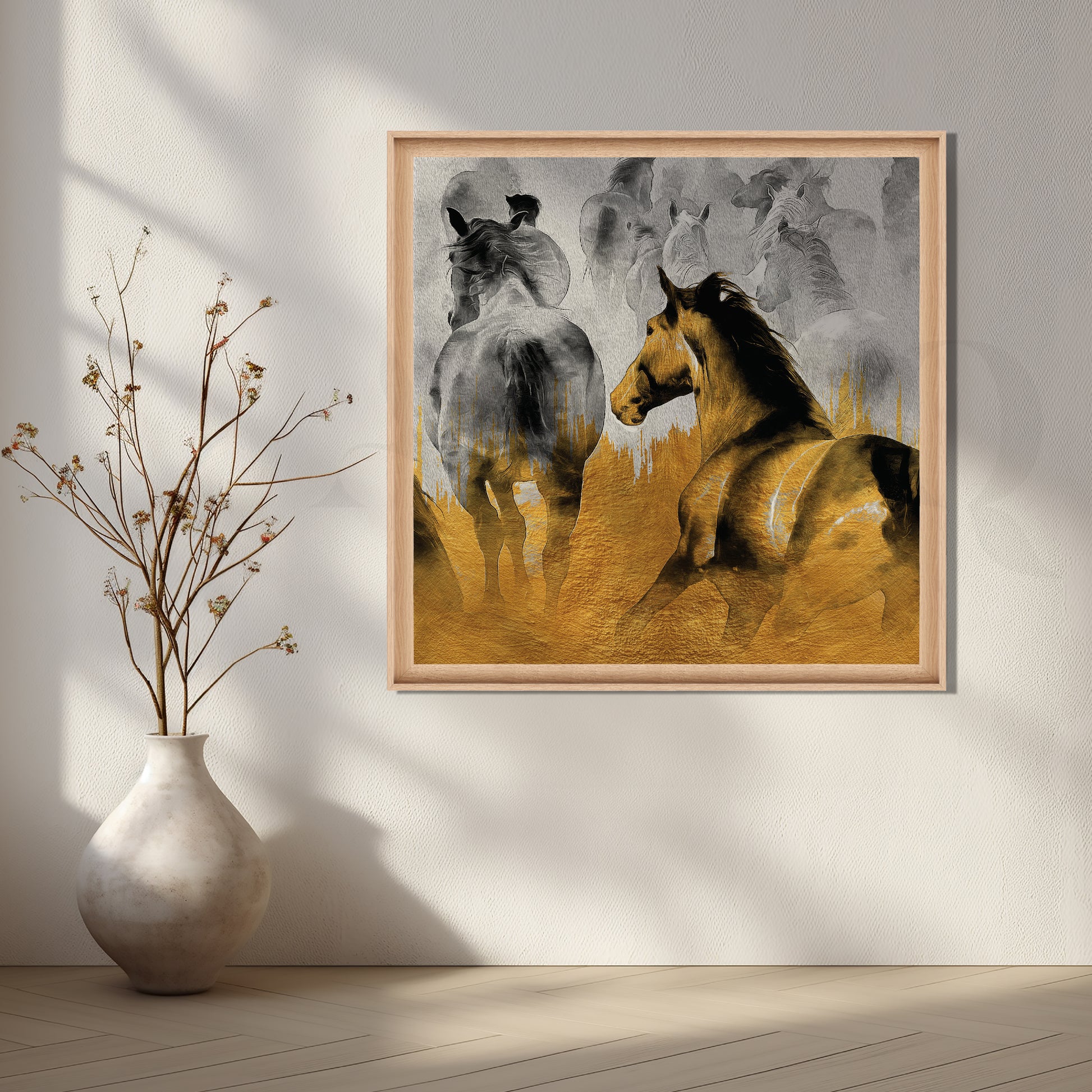 This vibrant canvas painting captures the energy of a herd of horses galloping across a field. The horses, a variety of brown, black, and white, kick up dust as they race forward. This beautiful piece is sure to add a touch of nature and movement to any room.