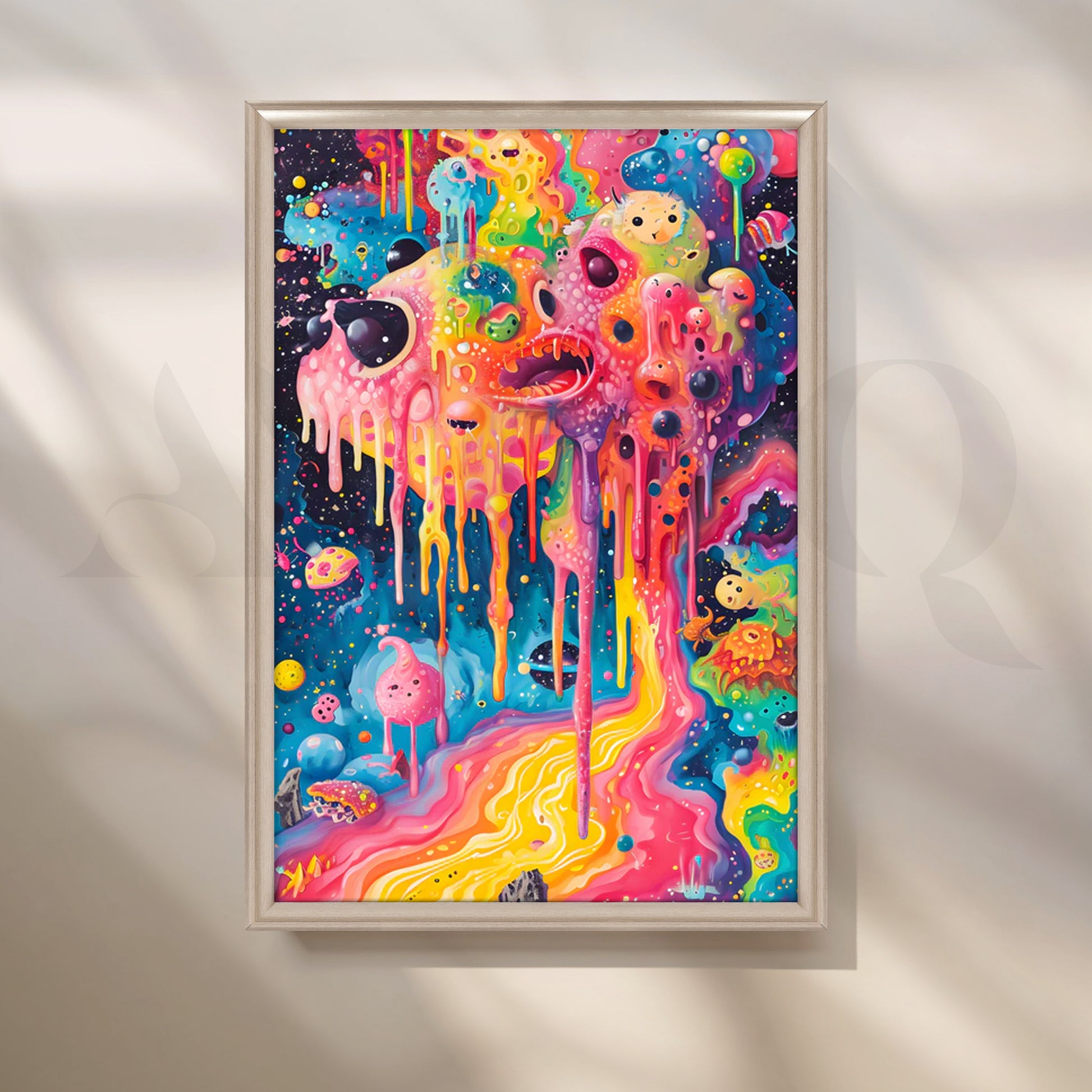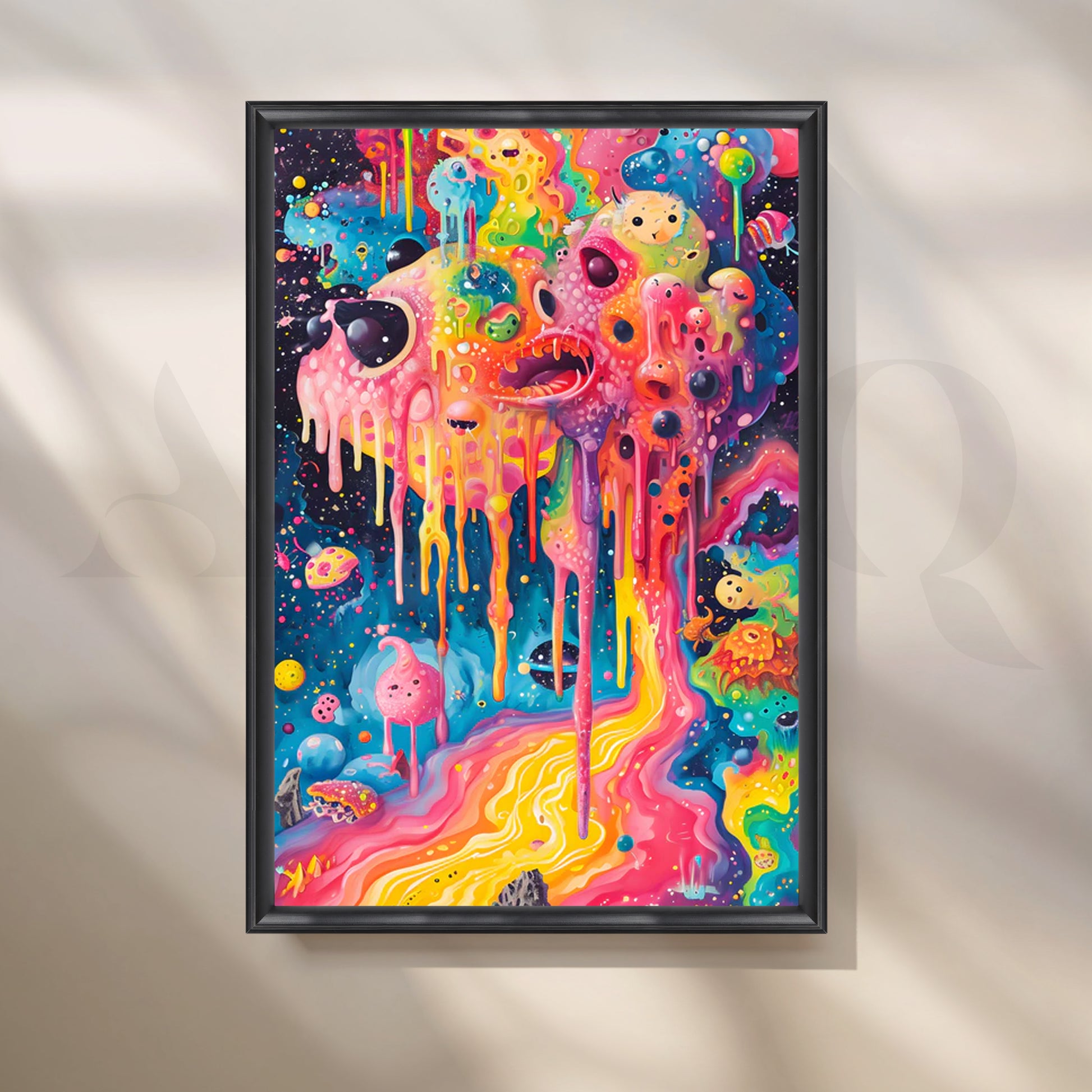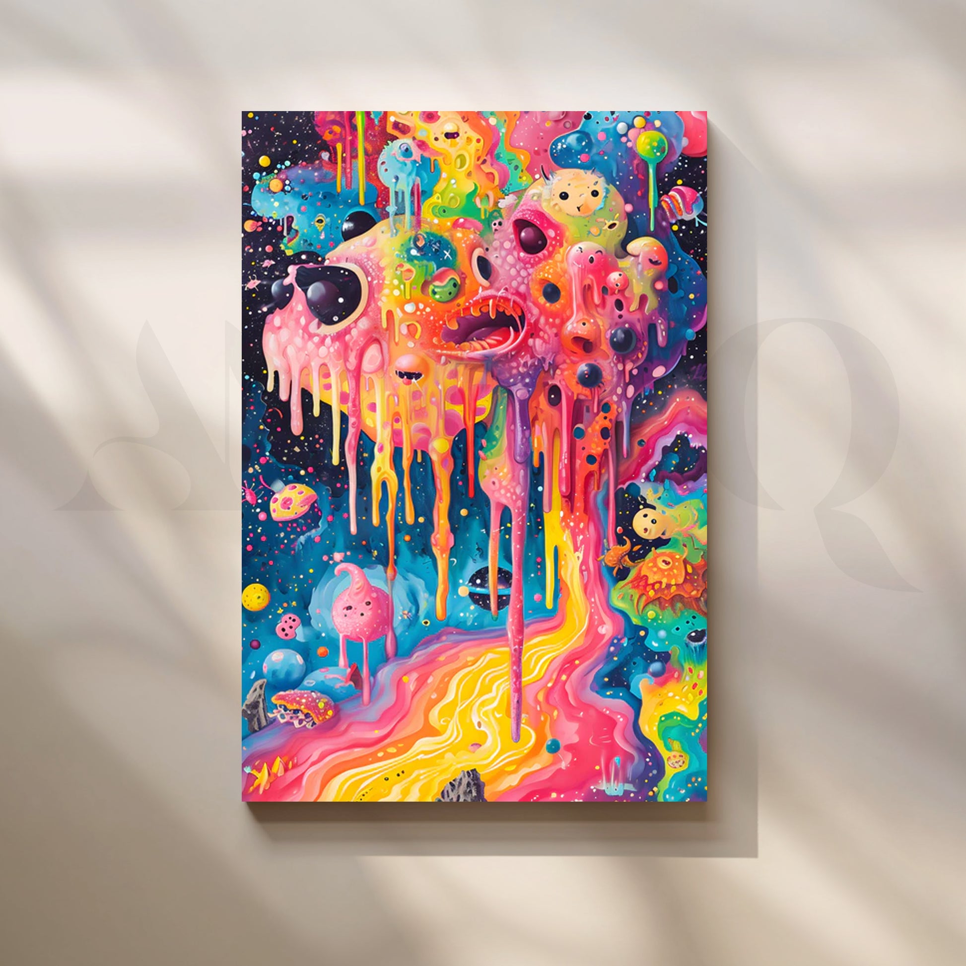 Turn your space electric with “Galactic Candy Melt,” a pop-surreal, psychedelic canvas bursting with neon pinks, electric blues, lemon yellow, and mango orange. Melting planets, drippy comets, and cosmic bubbles flow across a starry background, creating high-energy modern wall art that’s a true statement piece. Perfect as large game room art, creative studio décor, or fun living room accent, this colorful abstract canvas painting hits top searches like “trippy wall art,” “vibrant canvas,” “pop surrealism,” “psychedelic décor,” and “boho bedroom art,” instantly energizing gallery walls and neutral interiors alike.