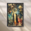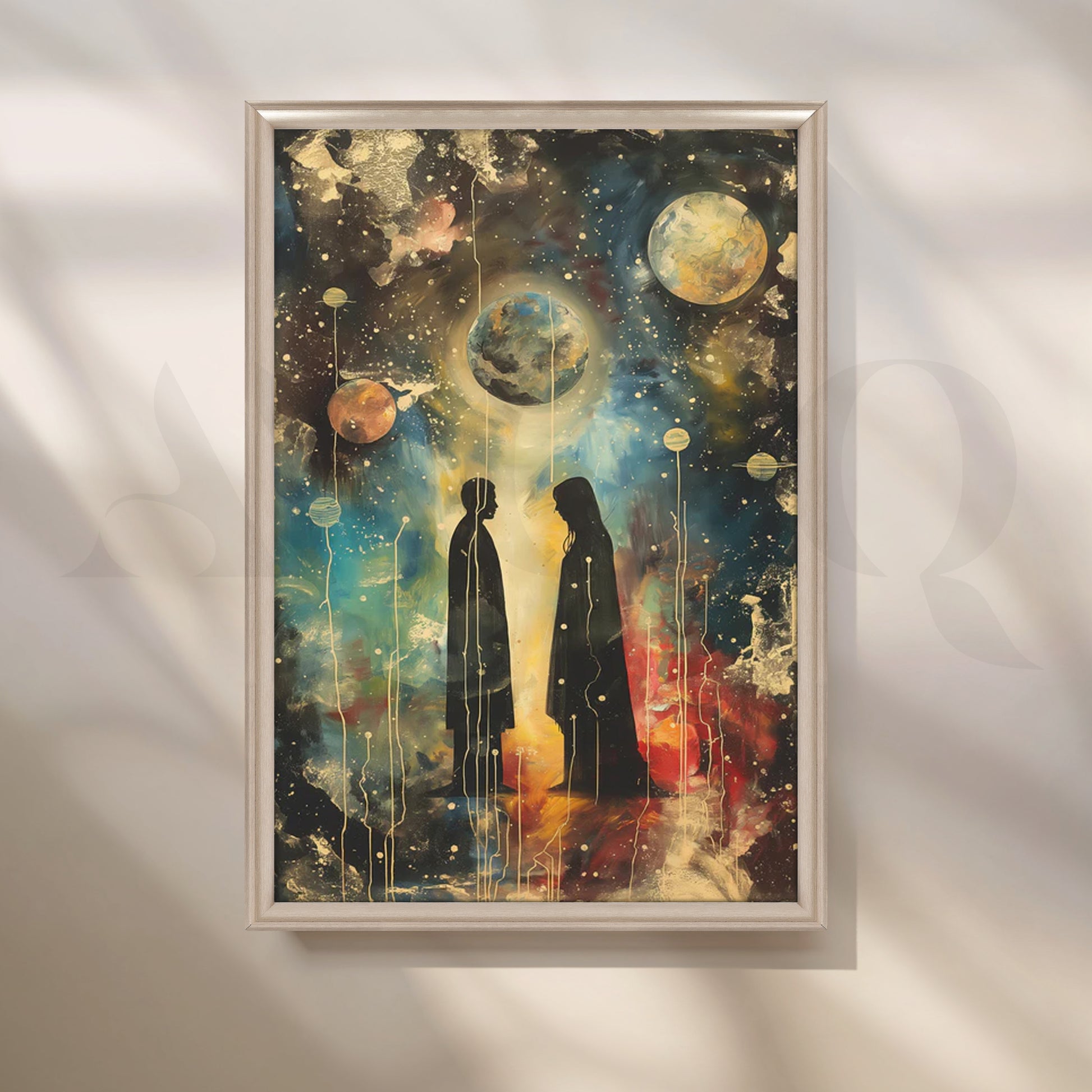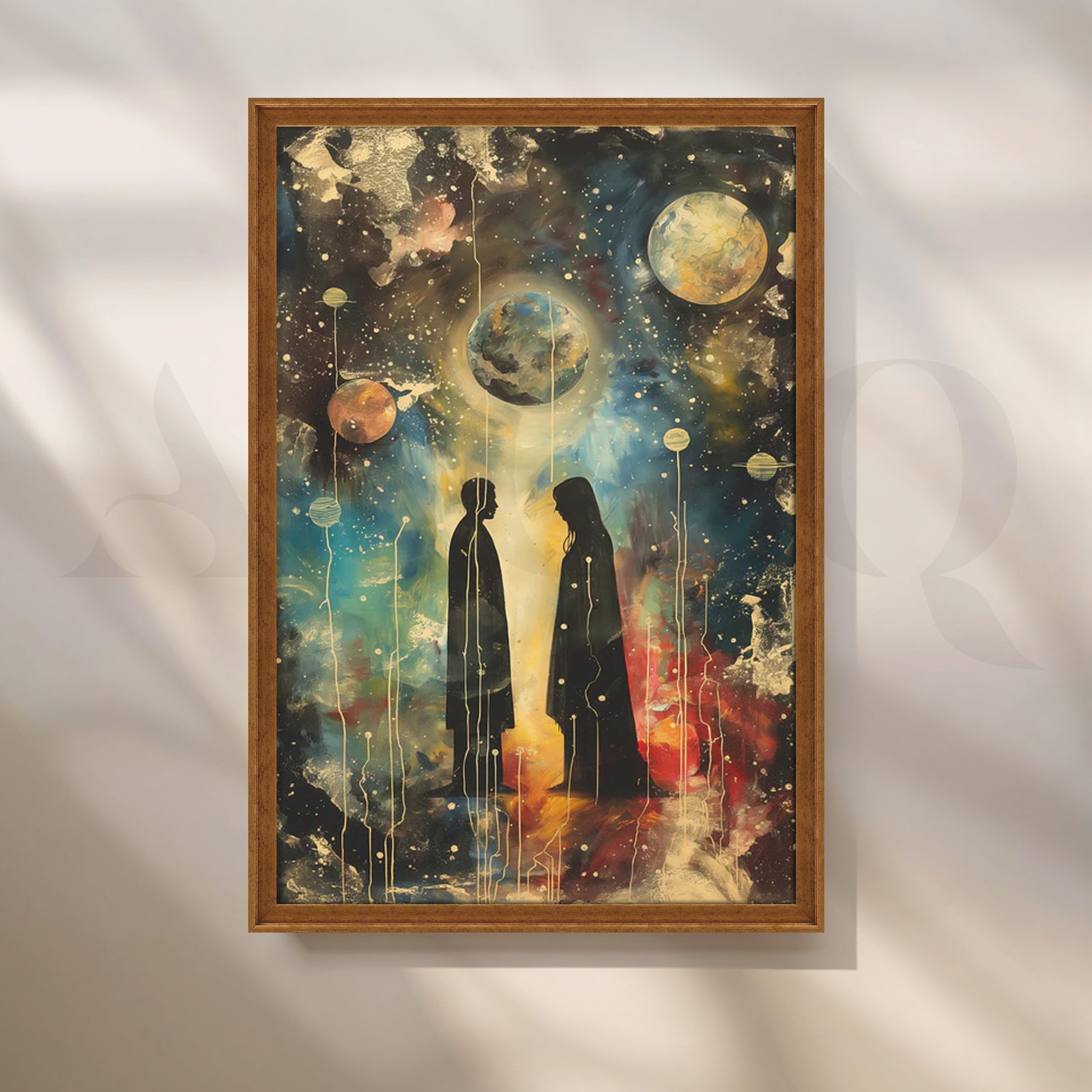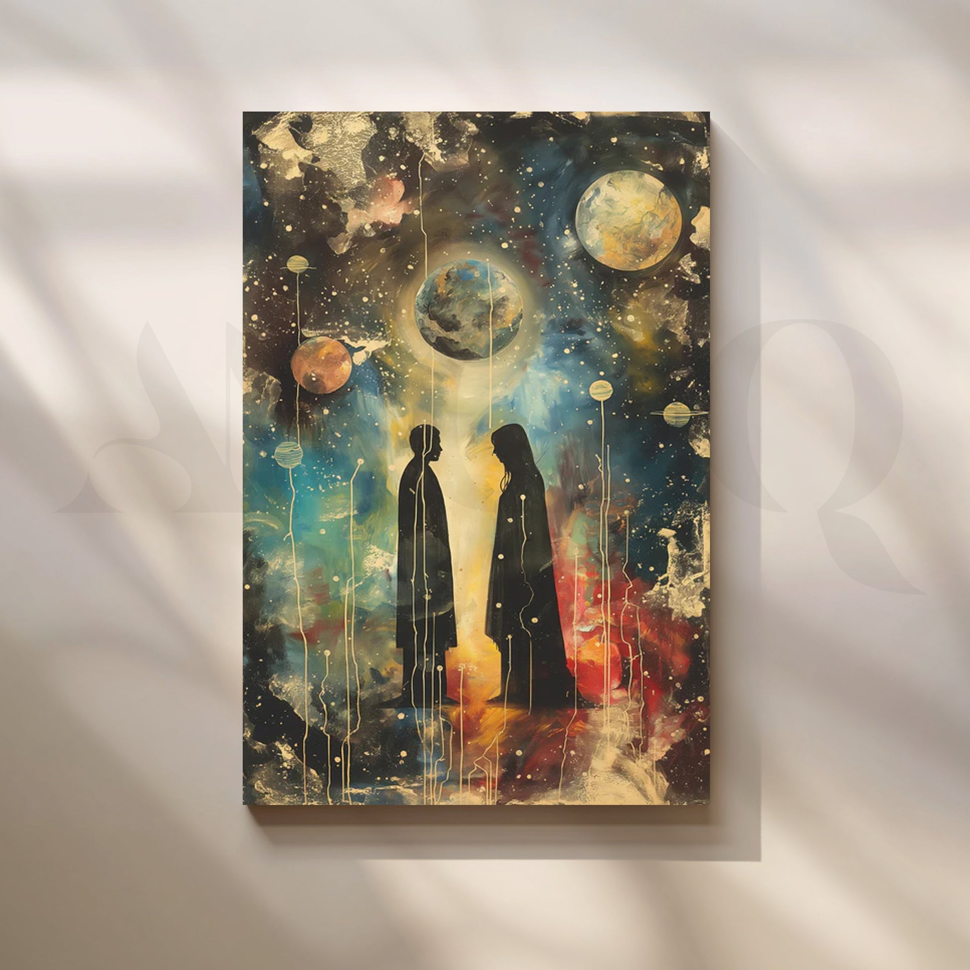 Ethereal planets and shimmering constellations surround two silhouetted figures in a dreamy galaxy of blue, gold, and ember hues. This celestial artwork adds a reflective, spiritual mood—perfect for a meditation room, yoga studio, or serene modern living room. A statement abstract canvas painting and cosmic wall art piece, it layers beautifully with moody décor, bringing depth, wonder, and conversation-starting energy to any space.