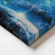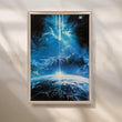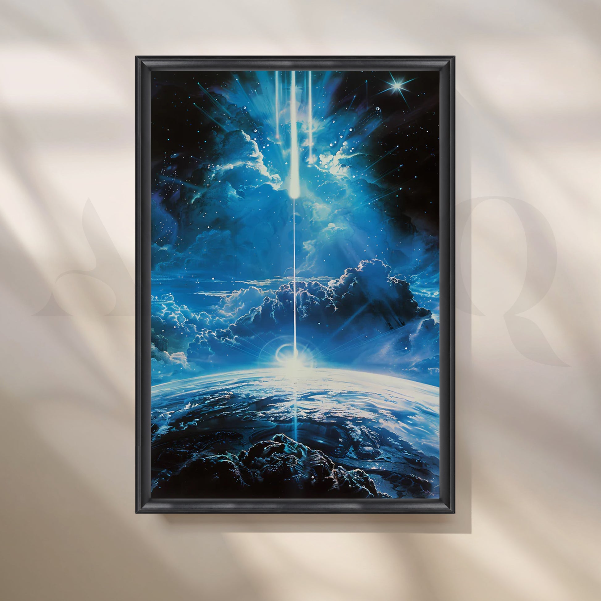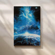 A radiant column of light pierces a star-flecked sky as dawn breaks over Earth’s curve. Billowing cobalt clouds glow with electric blues and icy whites, while the horizon blooms with a brilliant halo—epic, cinematic, and awe-inducing. This space wall art energizes living rooms, offices, and studios, pairing perfectly with modern, minimalist, and sci-fi interiors.