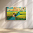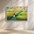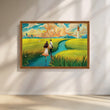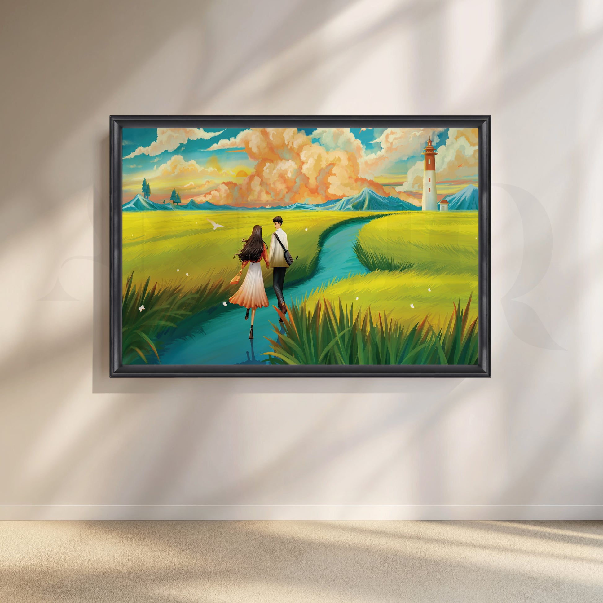 This captivating landscape captures a couple, hand-in-hand, enjoying a riverside stroll. Lush greenery stretches along the bank, while a calm river reflects the clear blue sky. Perfect for nature lovers and romantics alike, this artwork brings a touch of tranquility and togetherness to any space.