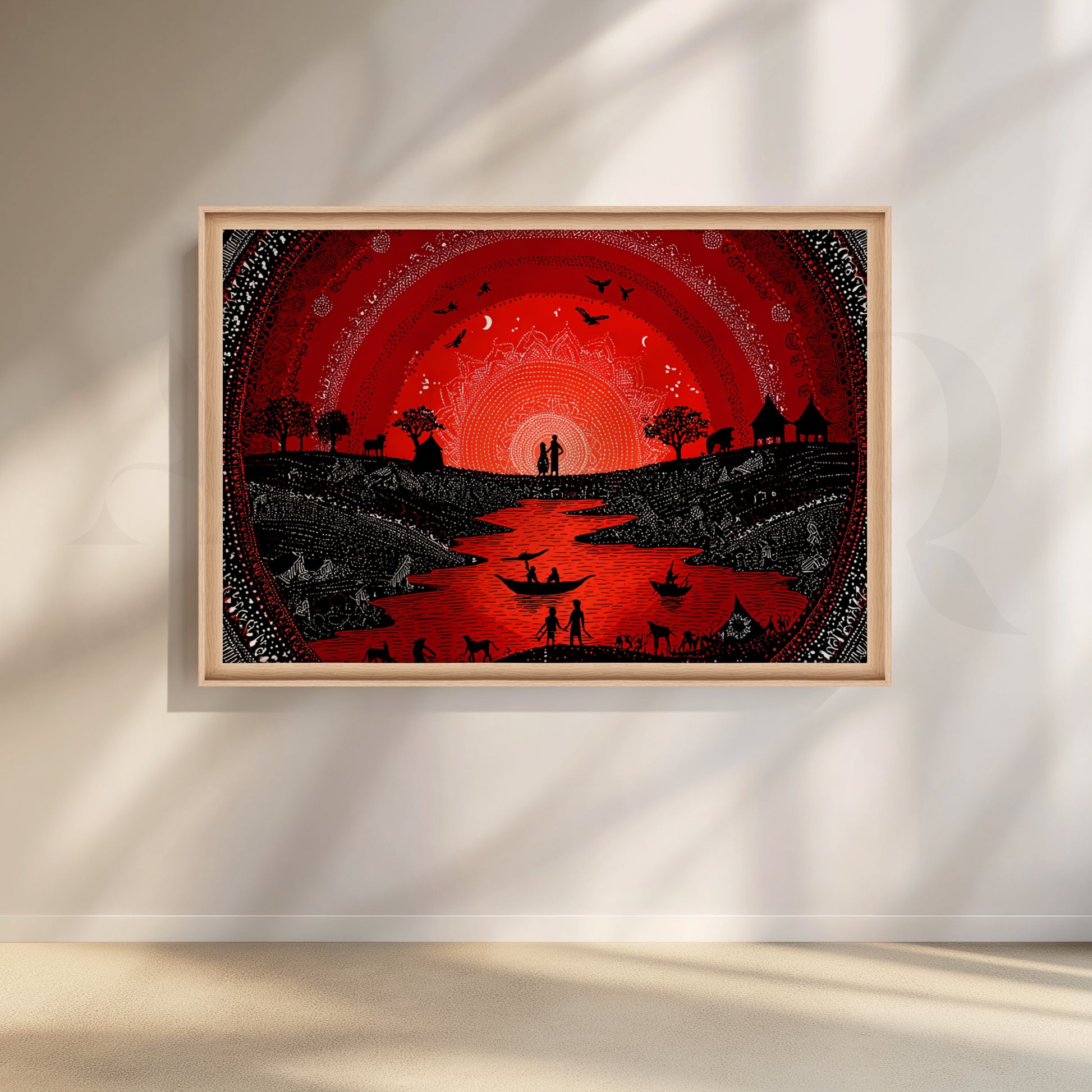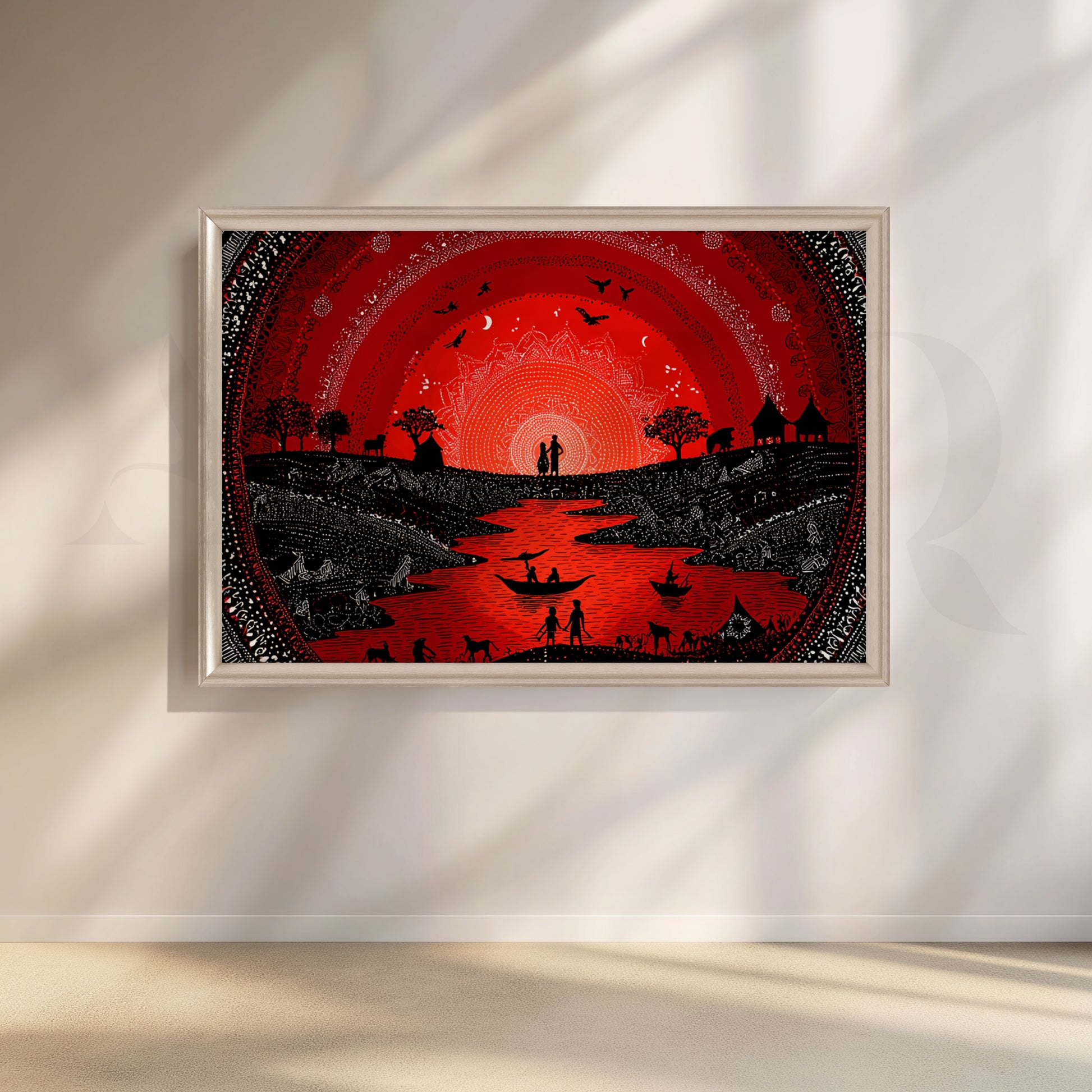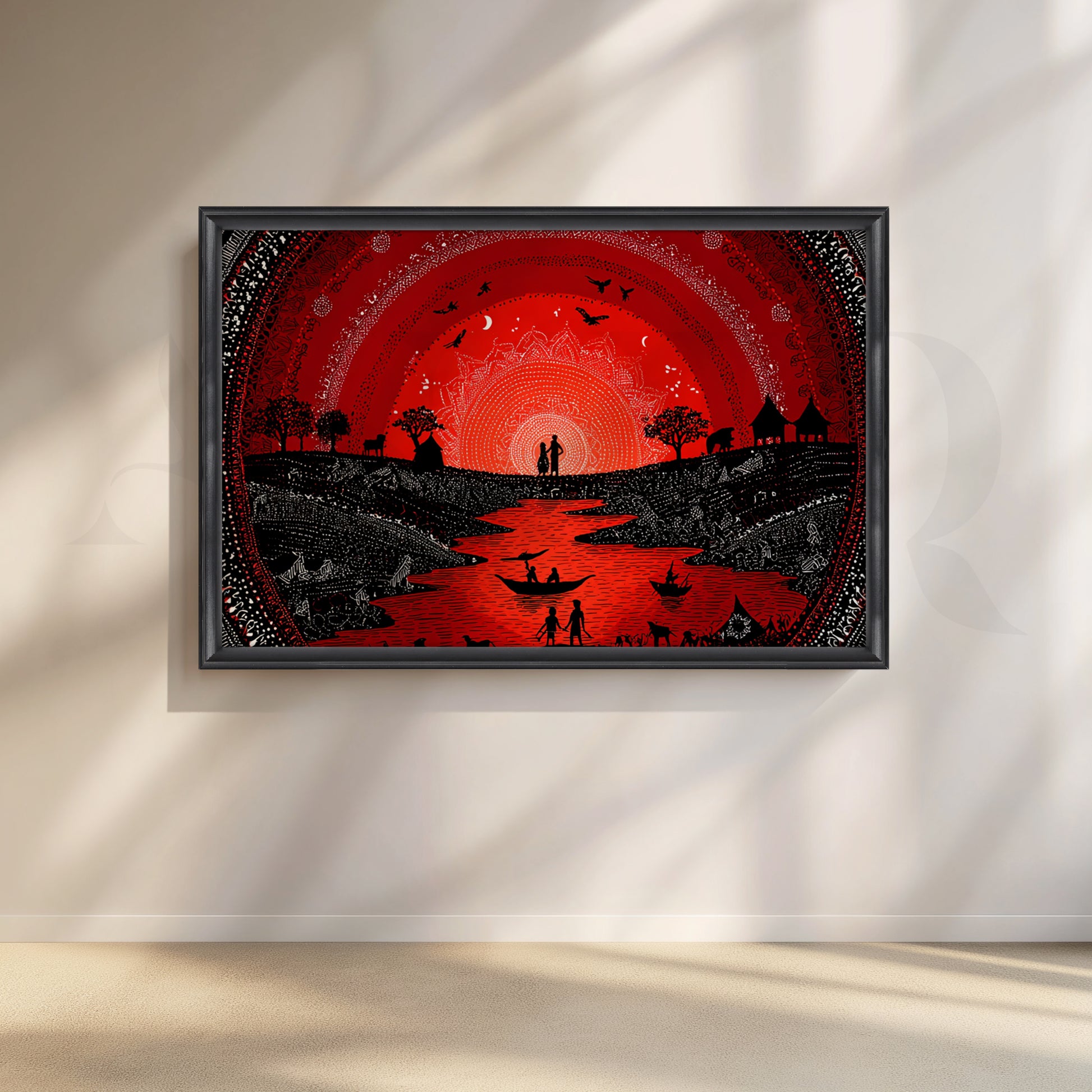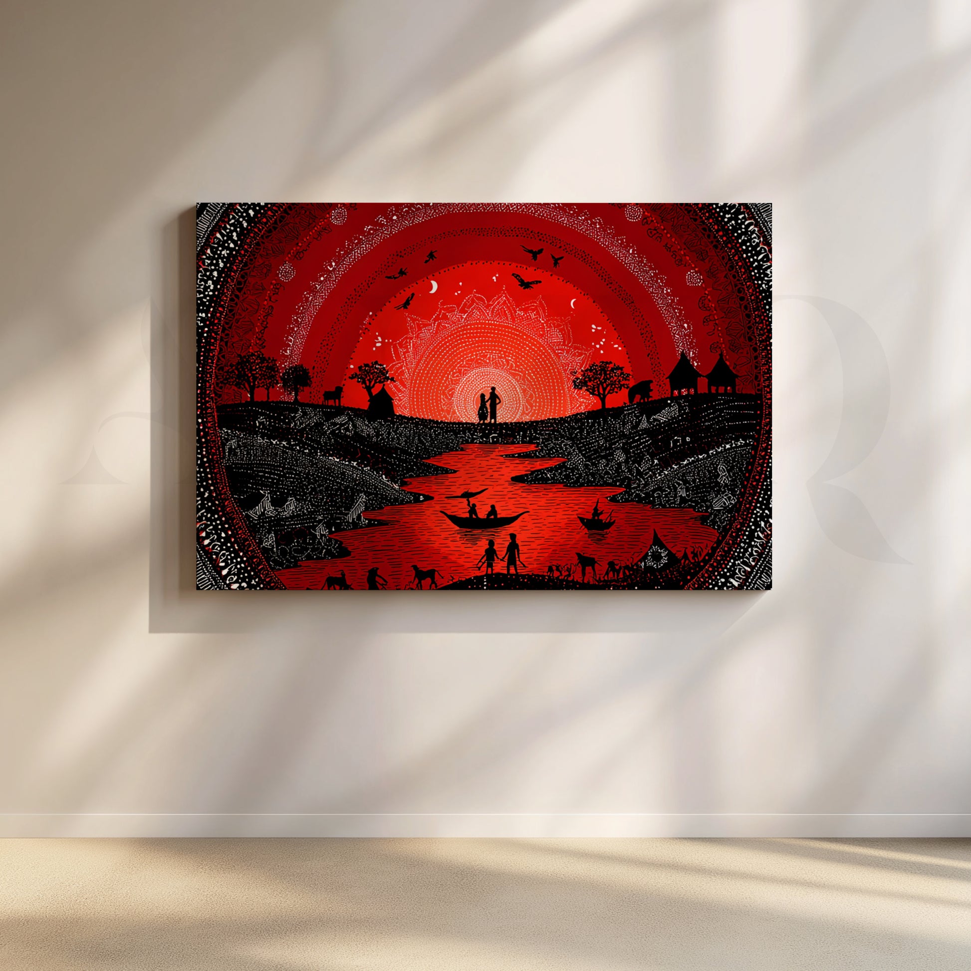 A dramatic red sun radiates over a winding river as boats, villagers, and animals celebrate in classic Warli motifs. Dense dot-work, circular mandalas, and black silhouettes create a festive focal point that warms dining rooms, lounges, and entertainment spaces. Works with boho, rustic, and contemporary interiors. Keywords: red wall art, Warli festival painting, Indian tribal canvas, dining room artwork, mandala river scene, bohemian décor.