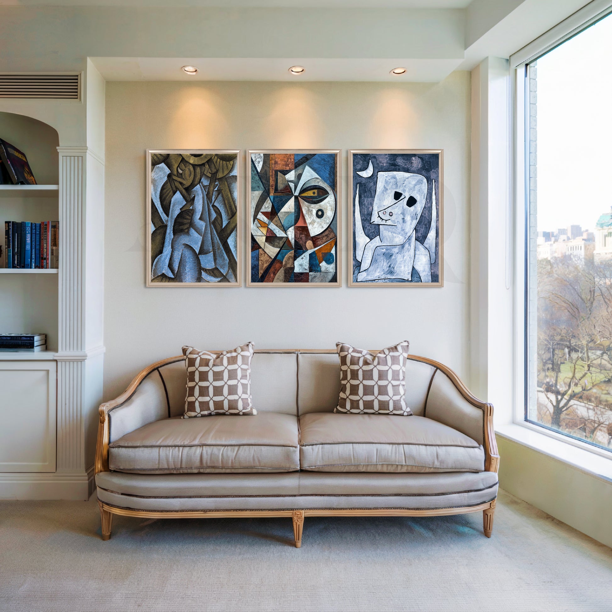 Anciq ‘Cubist Midnight Faces’ Gallery Wall features striking abstract portraits inspired by modern cubism, adding depth and character to any room. Perfect for living rooms, study areas, corridors, or creative offices, this 3-piece set suits contemporary, industrial, and art-focused interiors. Ideal for abstract face wall art and modern gallery wall décor.