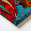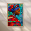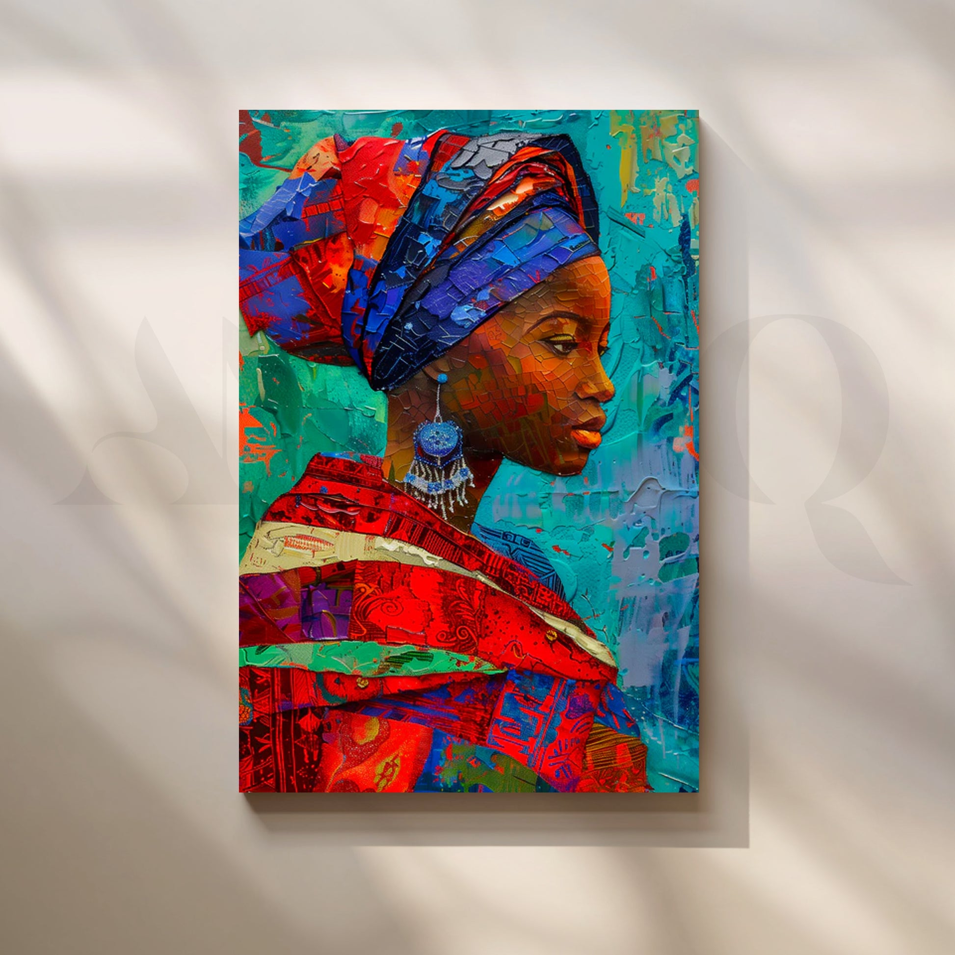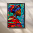 Vibrant portrait canvas of an African woman in a richly textured headwrap, rendered in mosaic-style brushwork of turquoise, cobalt, and red. This colorful, modern wall art brings global boho energy and gallery flair to a large living room or statement hallway. Perfect as abstract portrait décor, it pairs beautifully with teal accents and mid-century furniture for a bold, contemporary look.