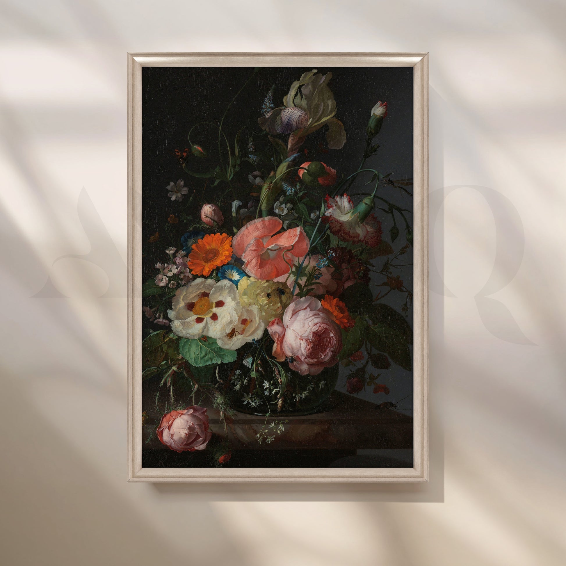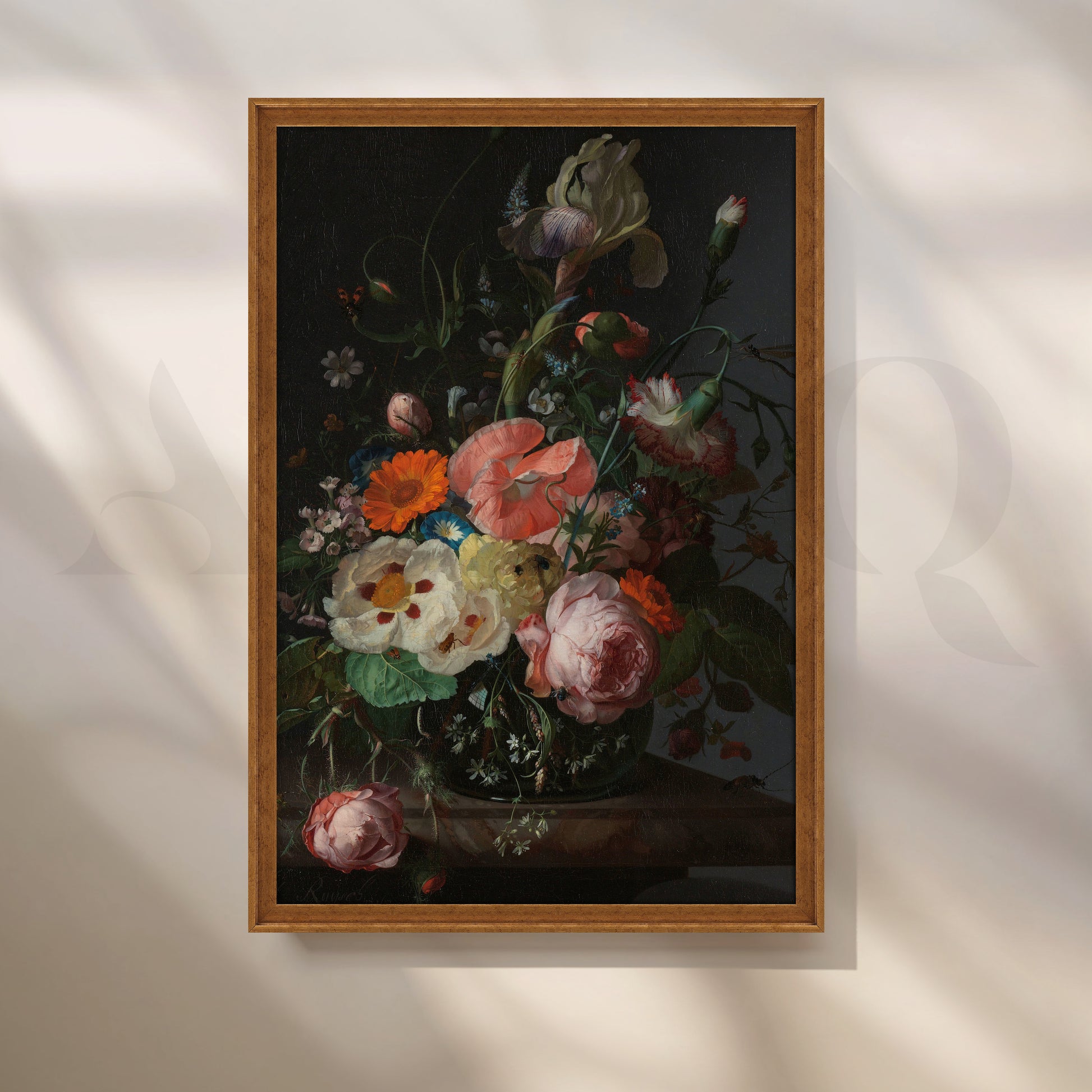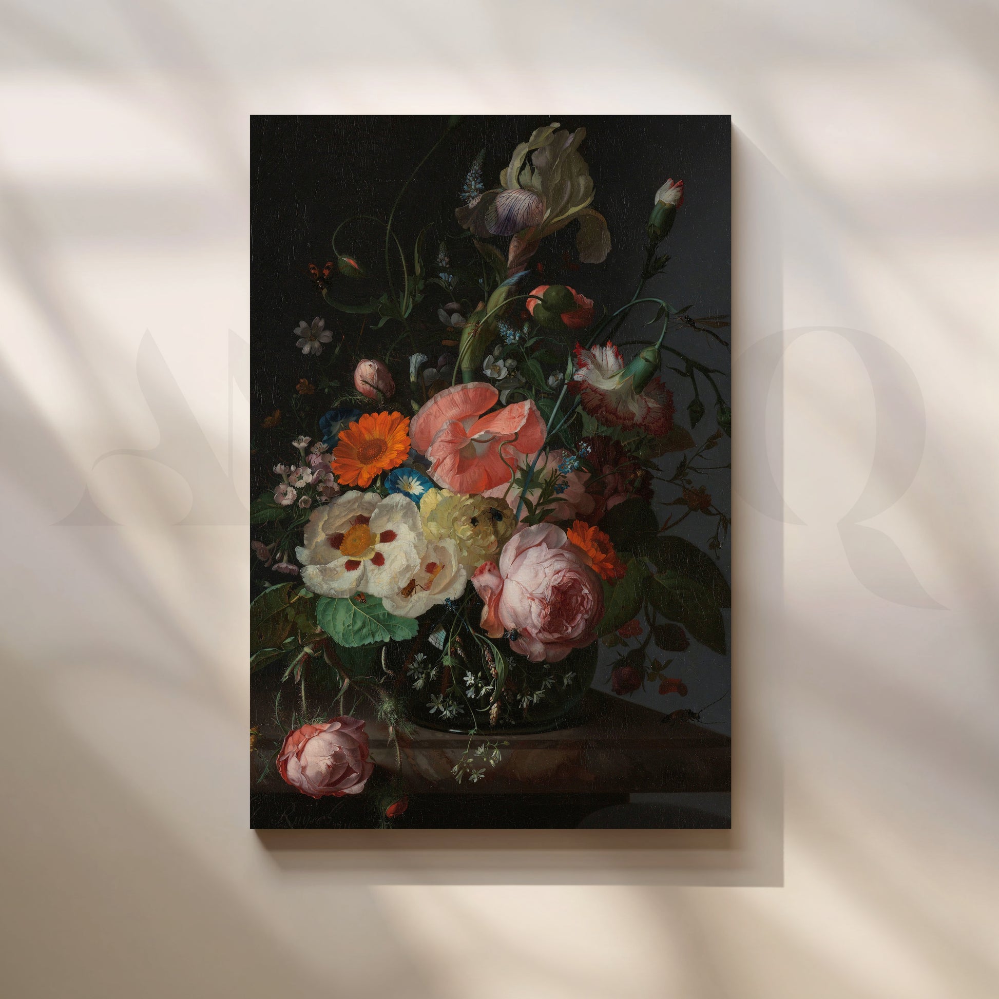 A moody and romantic Anciq artwork showcasing roses, irises, and wildflowers against a deep background—evoking timeless charm and sophistication. Ideal for bedrooms or artistic corners. Keywords: floral still-life art, moody flower painting, vintage bedroom decor, classic floral wall art, elegant home artwork.