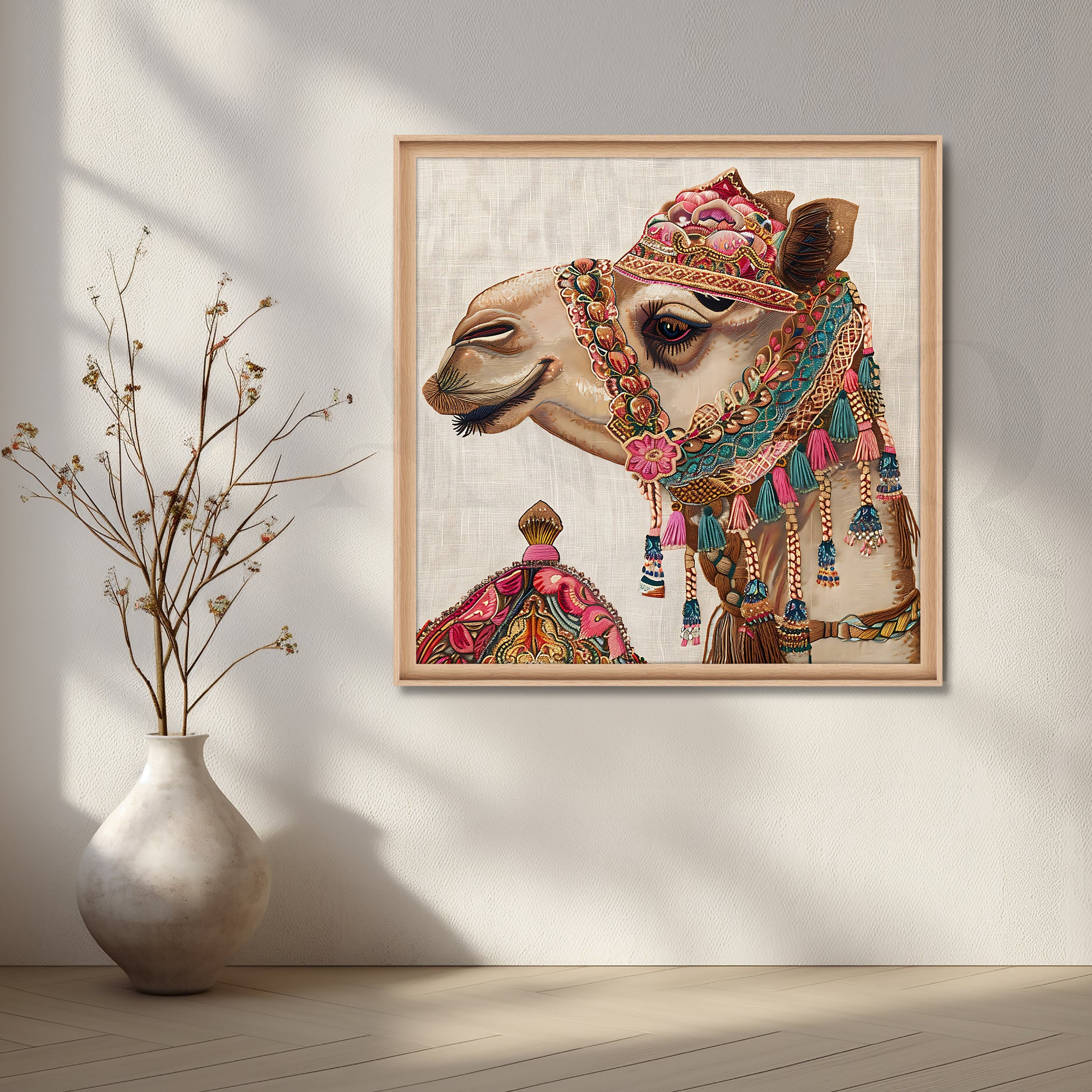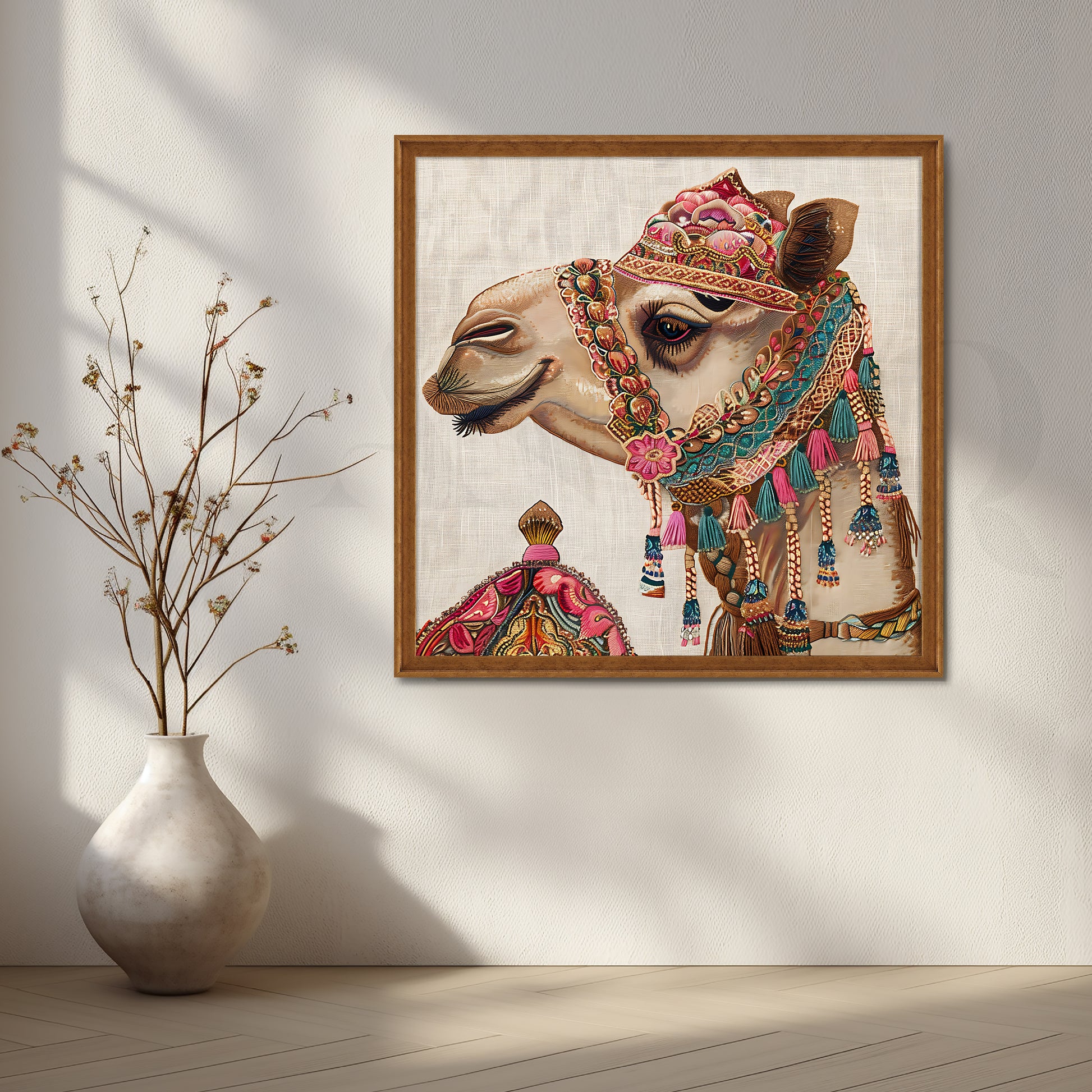 Anciq ‘Desert Royalty’ Canvas Artwork features a majestic camel clad in vibrant Rajasthani finery, evoking festive elegance and cultural richness. A perfect fit for boho-modern living rooms, entryways, or ethnic-style cafés, it appeals to lovers of Indian animal art, colorful canvas paintings, and folk-inspired home decor.