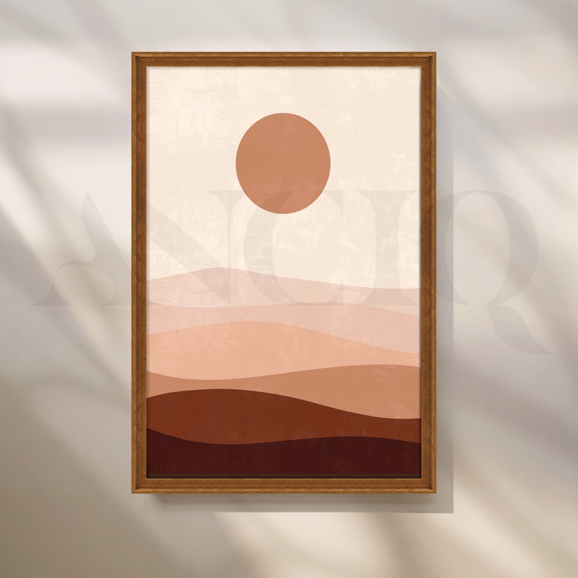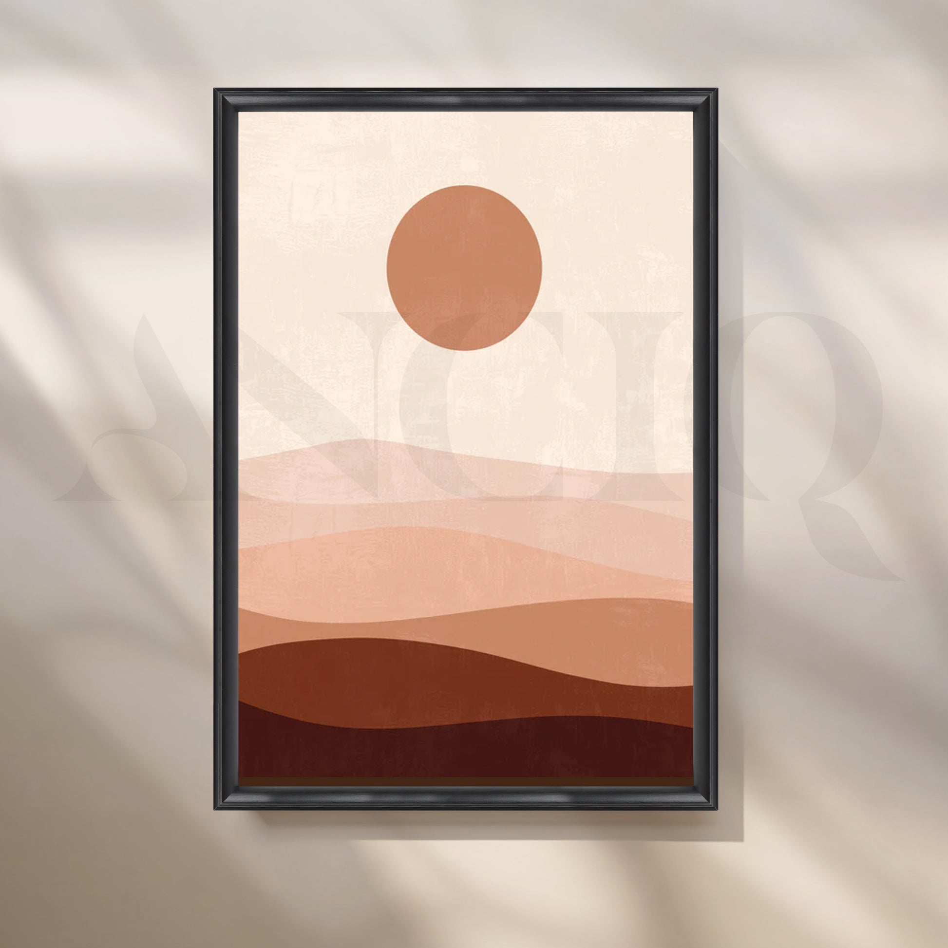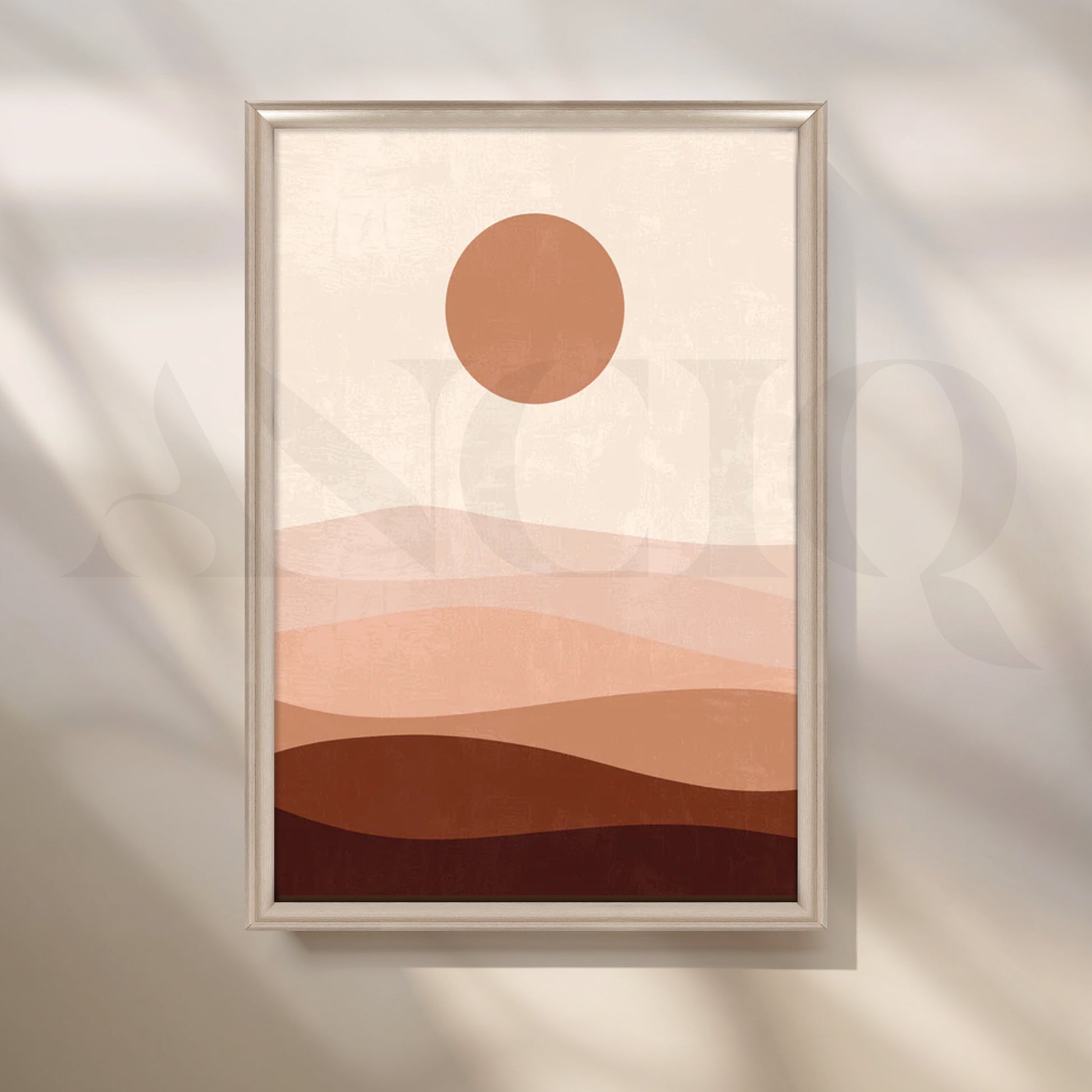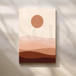 Layered blush and sand waves with a terracotta sun create soothing abstract landscape art that instantly relaxes a space. This neutral desert canvas is perfect minimalist wall art for bedrooms, nurseries, and Scandinavian living rooms—easy to style with linen bedding, light woods, and boucle accents. A chic choice for large living room art or a calm office backdrop.