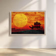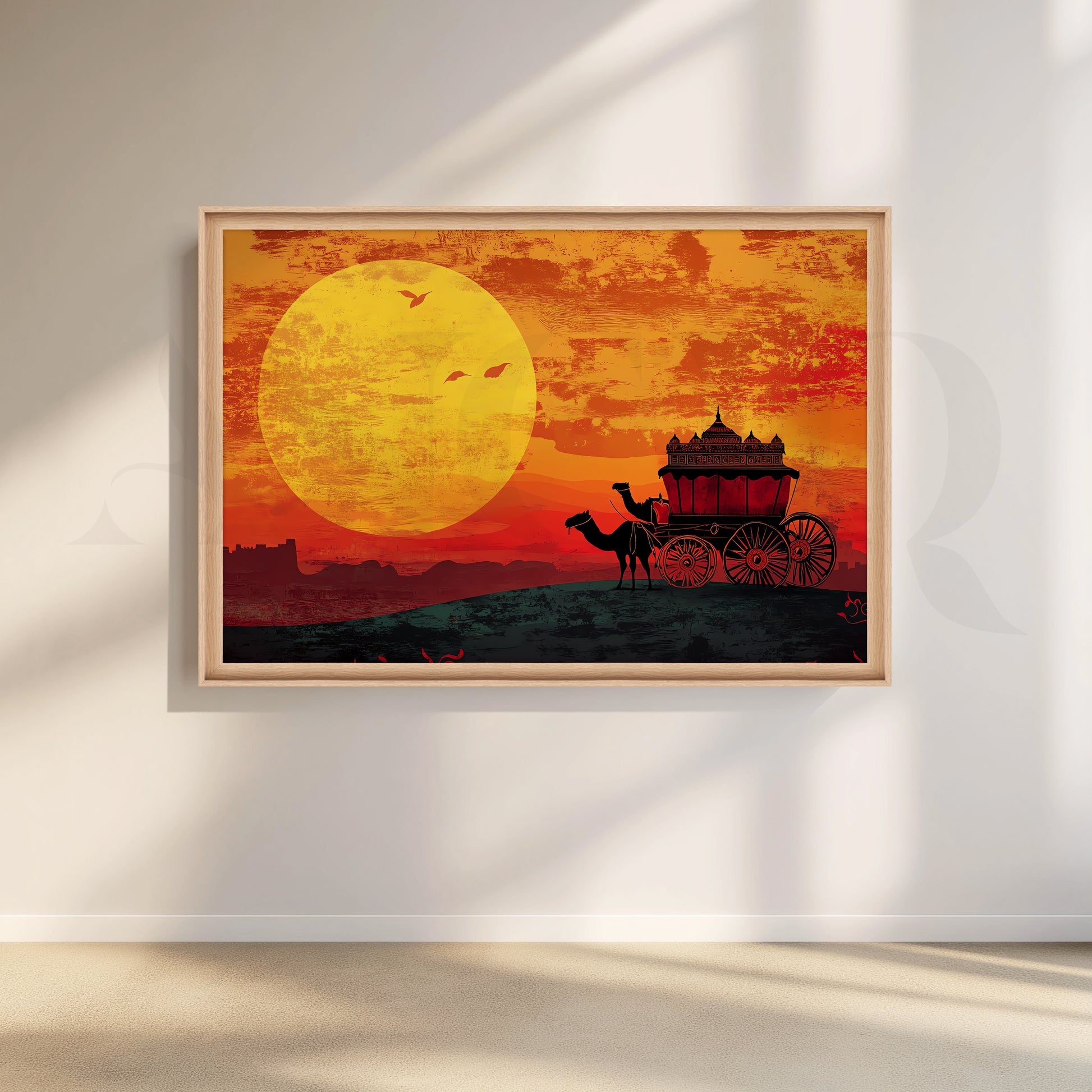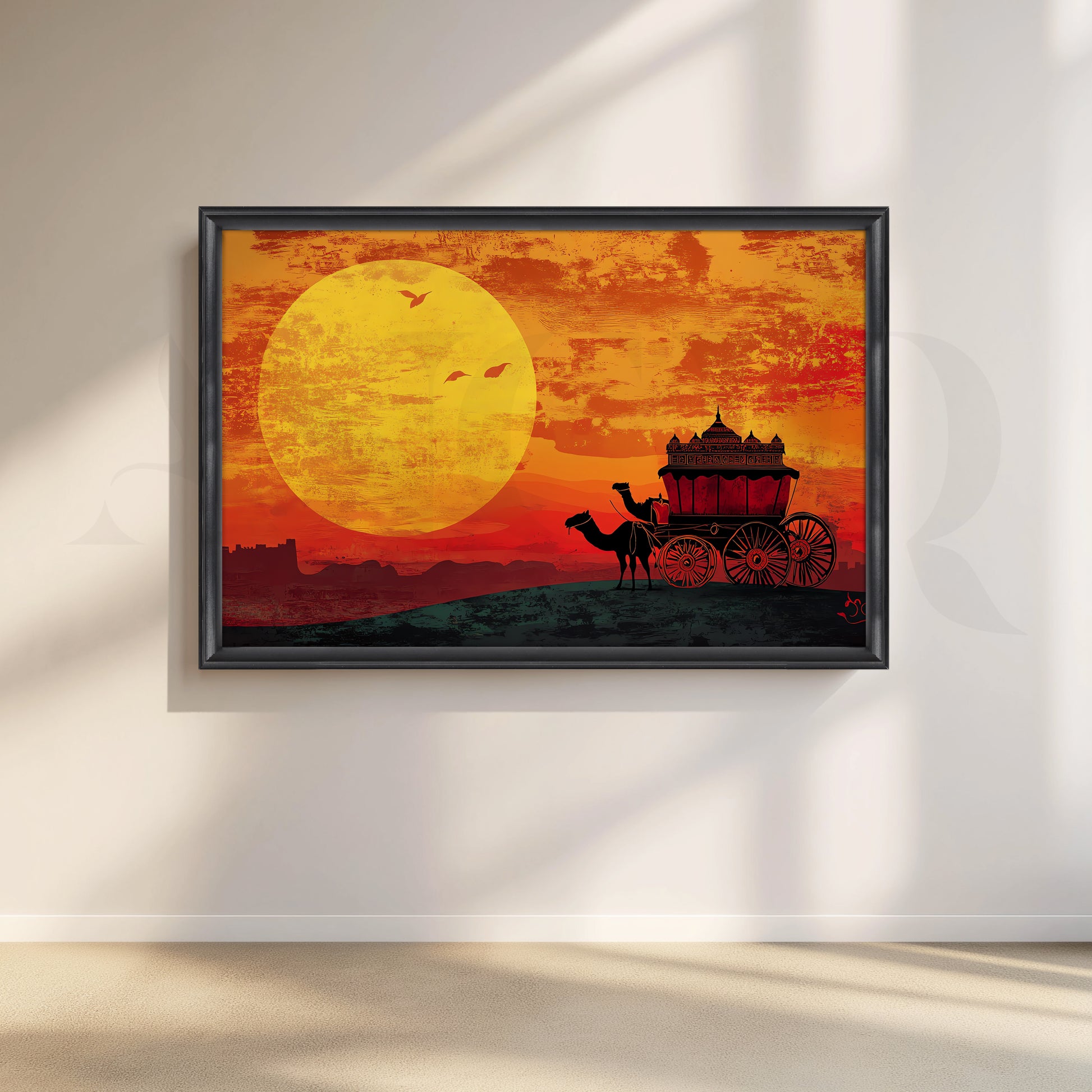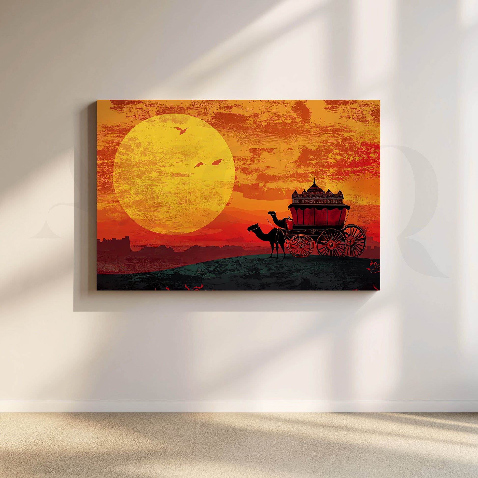 This vibrant Rajasthani desert canvas artwork captures a camel-drawn royal cart against a glowing orange sunset. Rich silhouettes, warm colours and a giant sun make it perfect Rajasthani wall art for living rooms, corridors and offices, adding ethnic Indian décor and a dramatic focal point to any space.