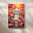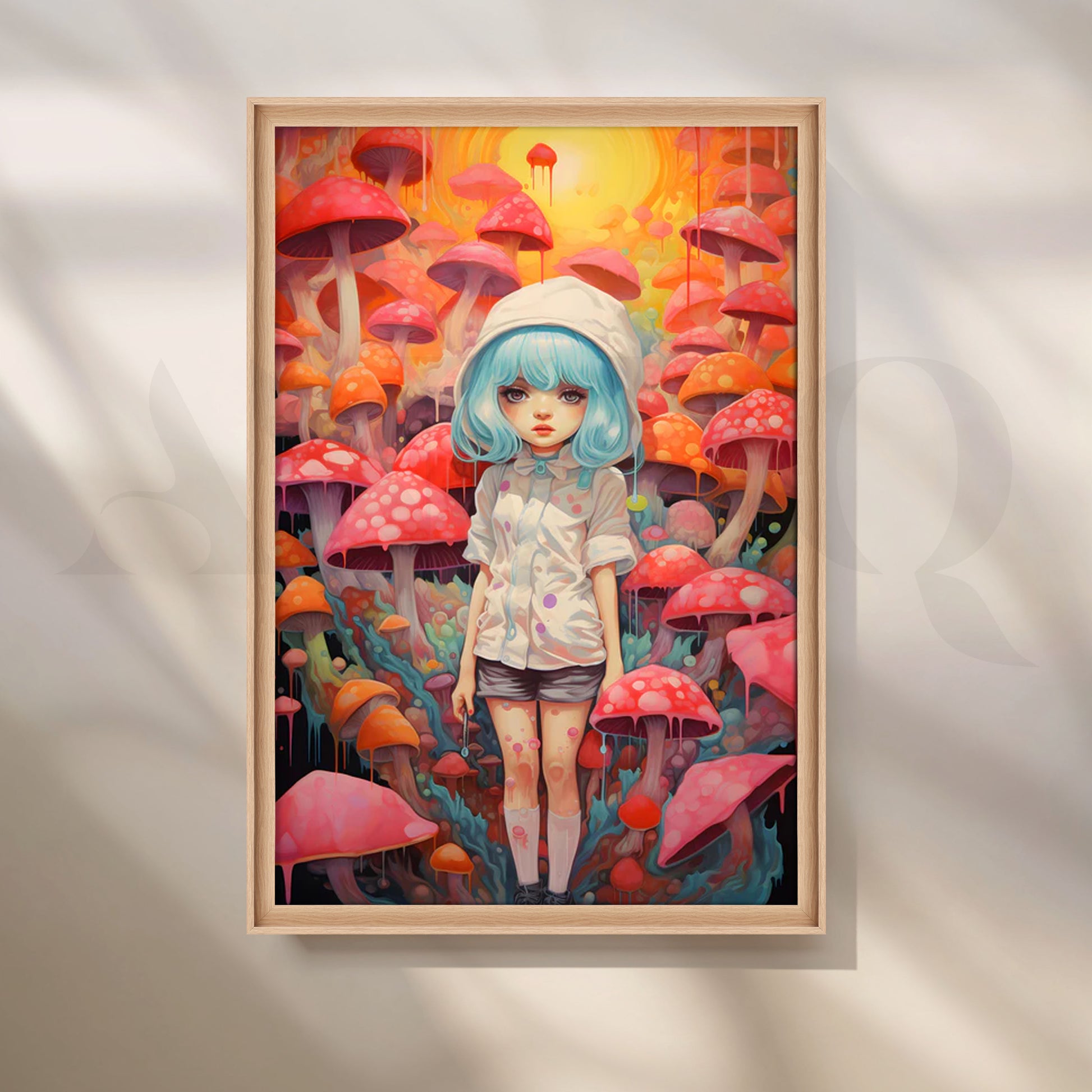 Pop-surreal fantasy of a blue-haired girl in an orange mushroom hat and dress, standing in a magical forest of spotted toadstools and neon drips on a deep midnight backdrop. Vivid purples, corals and teals create a dreamy, kawaii vibe—perfect for bedrooms, kids’ rooms, nurseries and art studios. Keywords: mushroom wall art, kawaii girl canvas, pop surrealism painting, anime-inspired poster, whimsical fantasy décor, big-eyes art print, pastel nursery artwork, colorful kids room decor, modern illustration canvas.