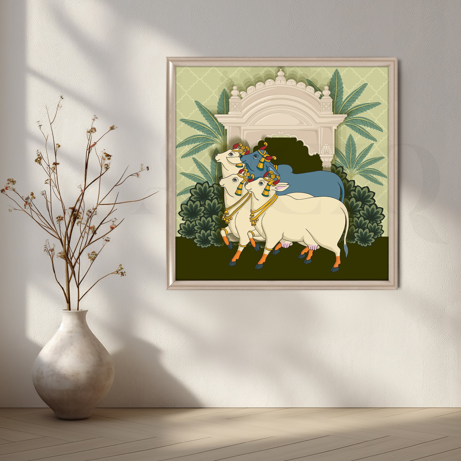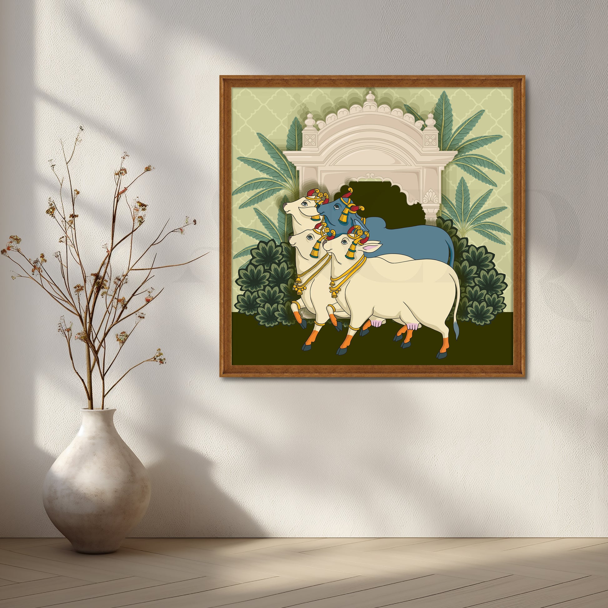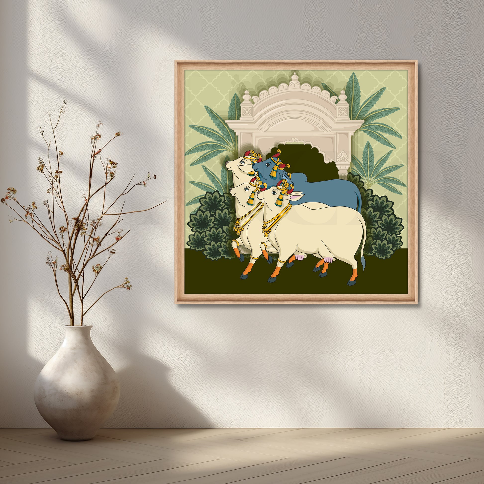Anciq ‘Divine Companions’ Canvas Artwork portrays Lord Krishna lovingly surrounded by cows in a Mughal arch backdrop. Perfect for pooja rooms or calm corners, this piece radiates devotion and serenity. Keywords: Krishna wall art, Indian devotional painting, sacred cow artwork, traditional pooja decor, divine Indian canvas.