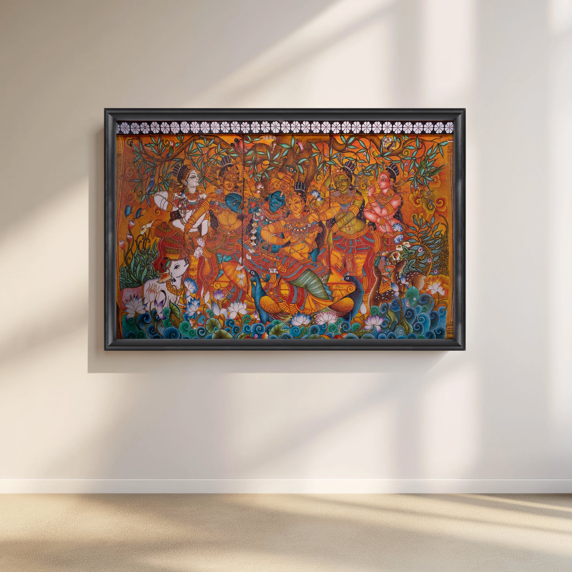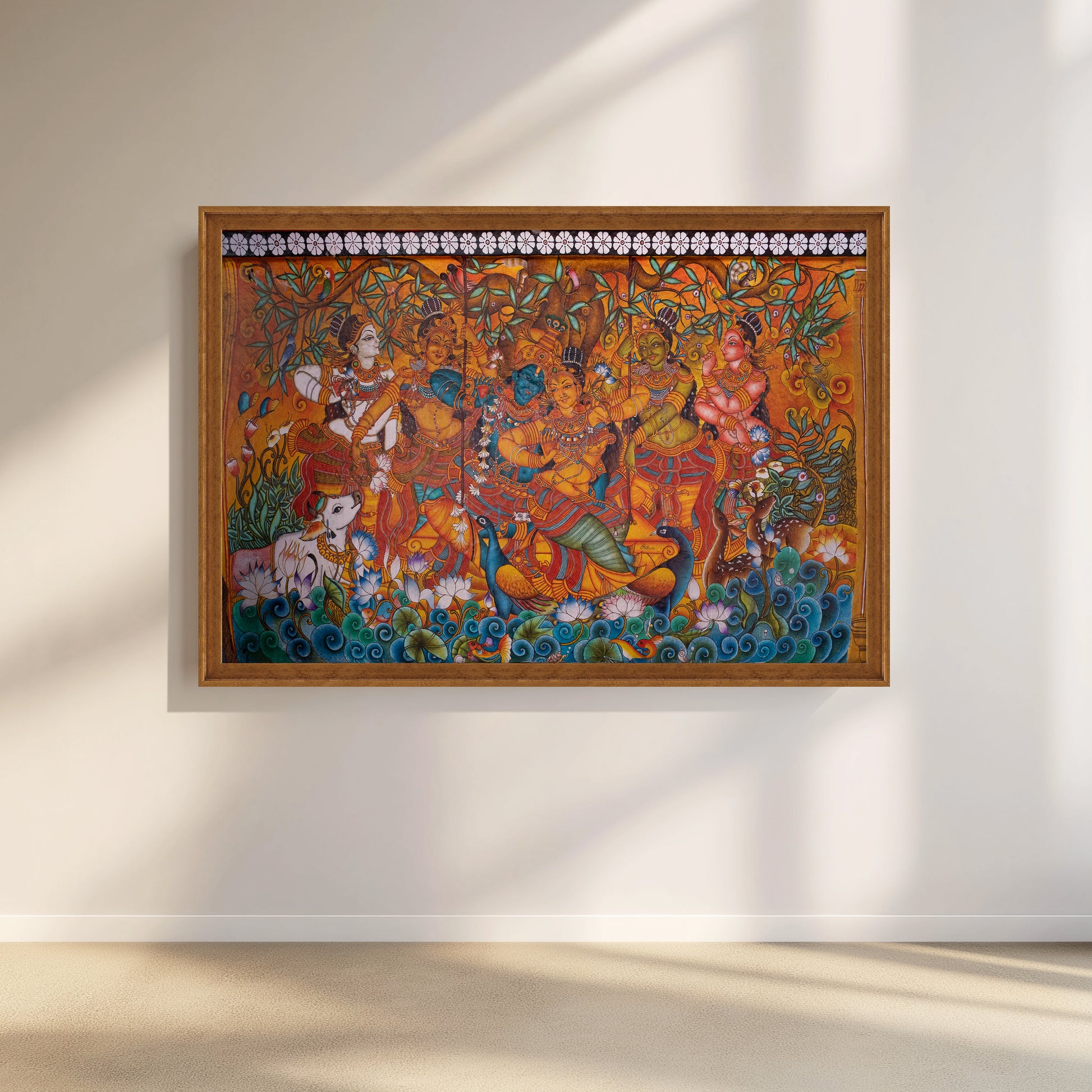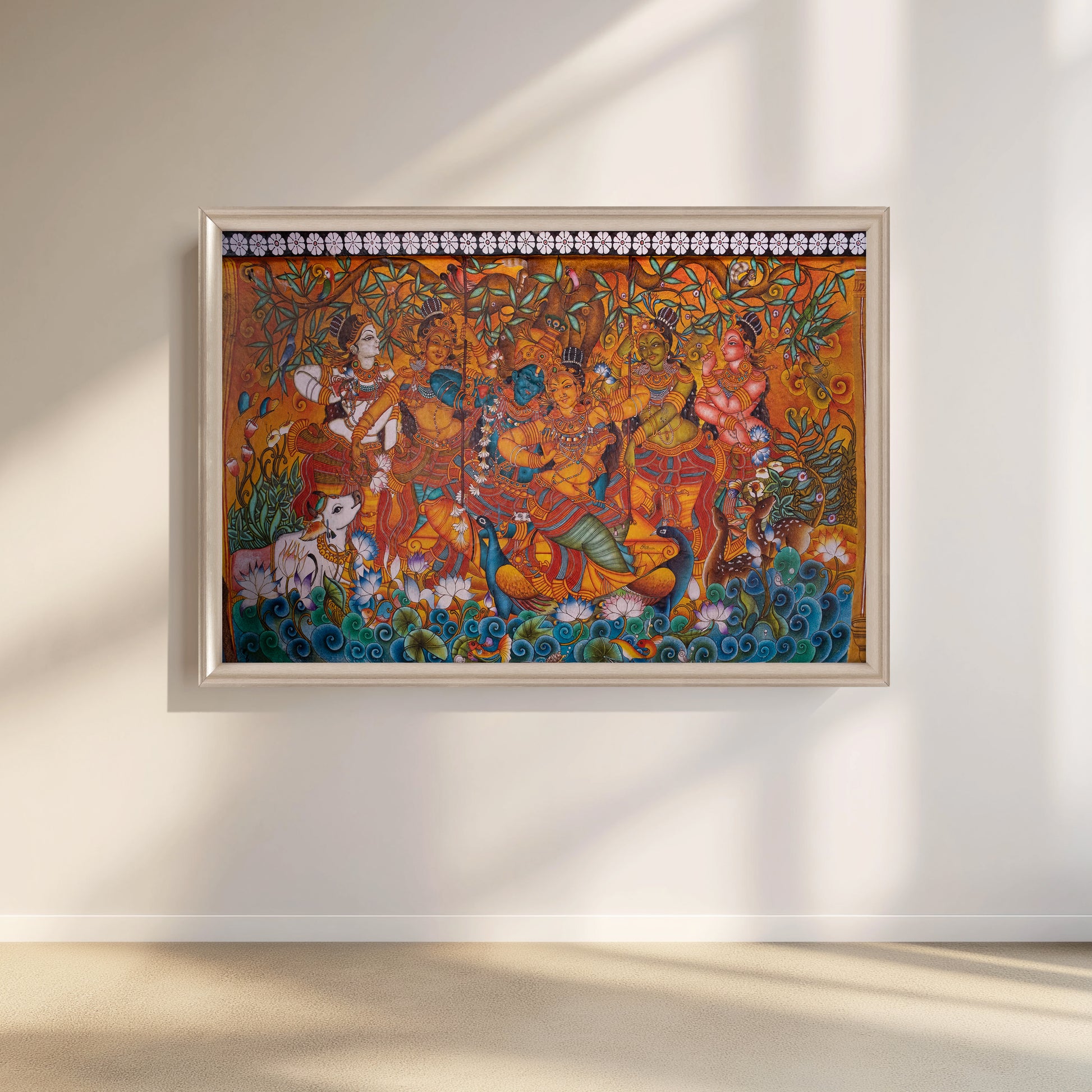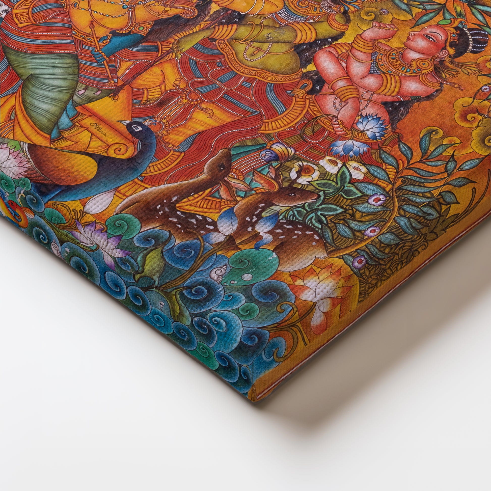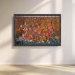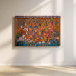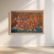 Divulge in the rich cultural heritage and complex artistry of this mythological canvas artwork depicting a vibrant celebration. The showcasing of women rejoicing and celebrating gracefully amidst lush surroundings. This artwork brings a touch of divine elegance and storytelling to your decor.