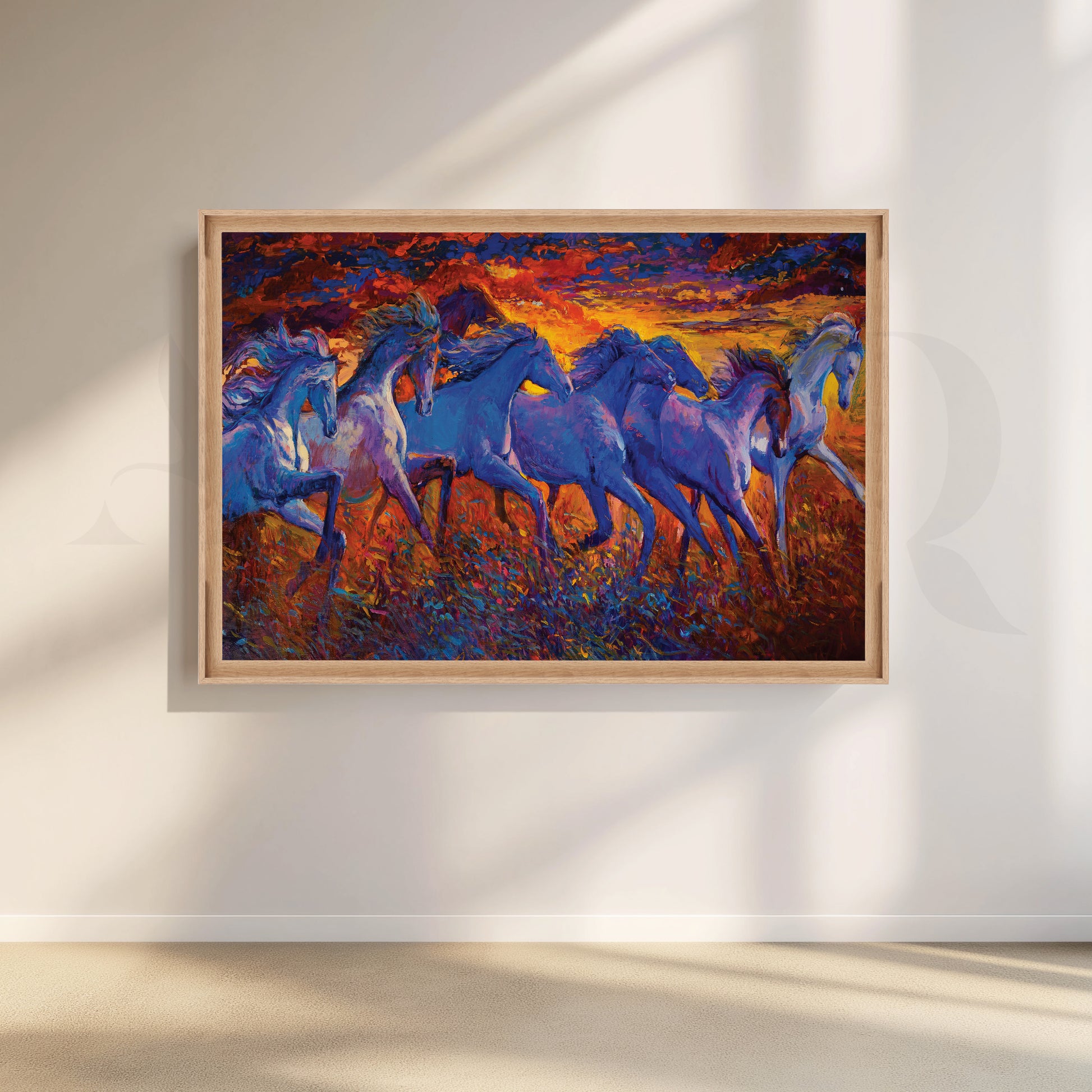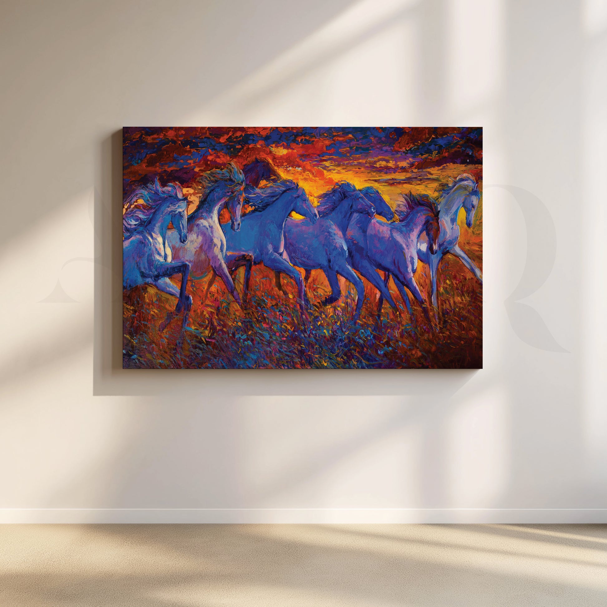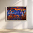 Bring home the glory of wild horses with this stunning printed canvas artwork. A herd of horses in blue, black and white gallop across the field, bathed in the warm glow of the setting sun. This beautiful piece is sure to add a touch of drama and charm to any room.