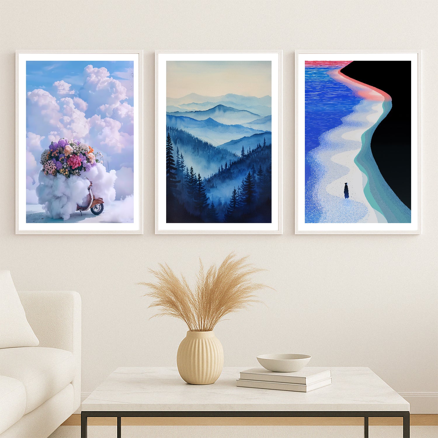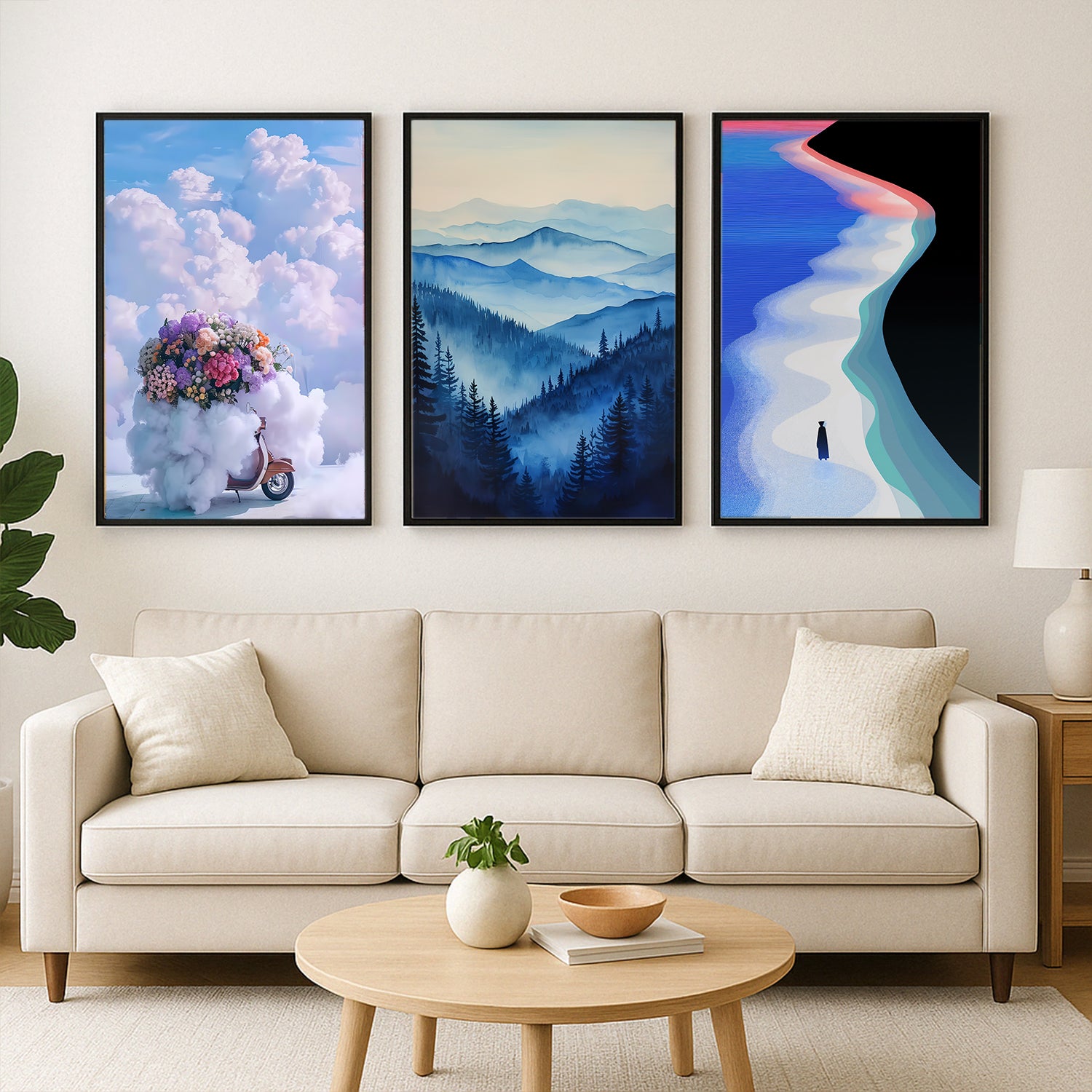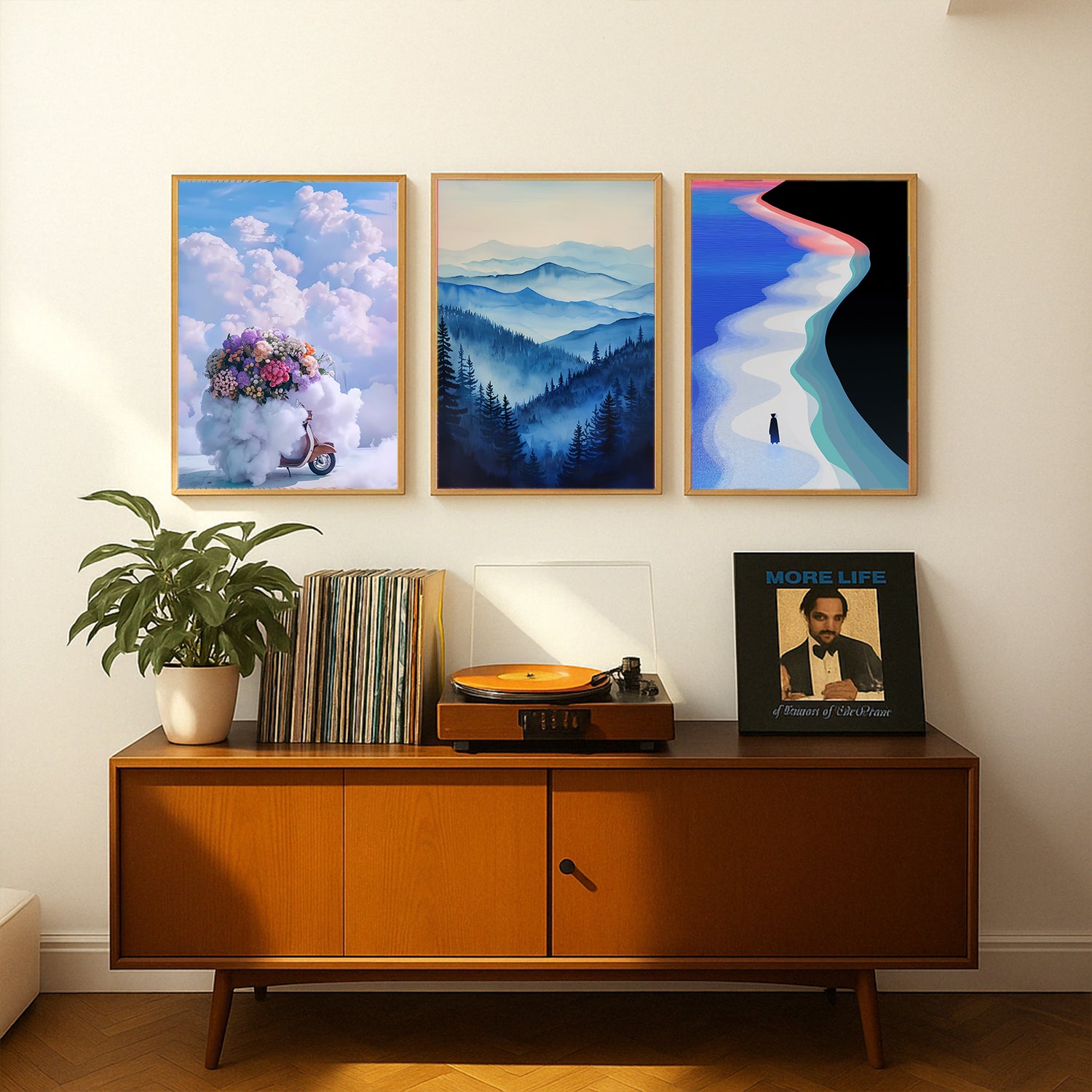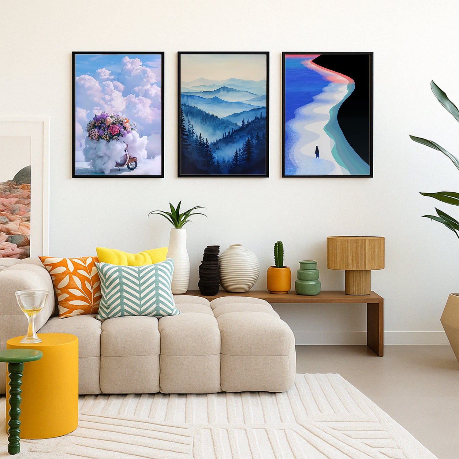 Dreamscape Journey Gallery Walls weave surreal clouds, misty mountains, and abstract coastlines into a whimsical trio. These Gallery walls inspire wonder and creativity—perfect for music corners, lounges, or personal retreats.