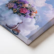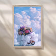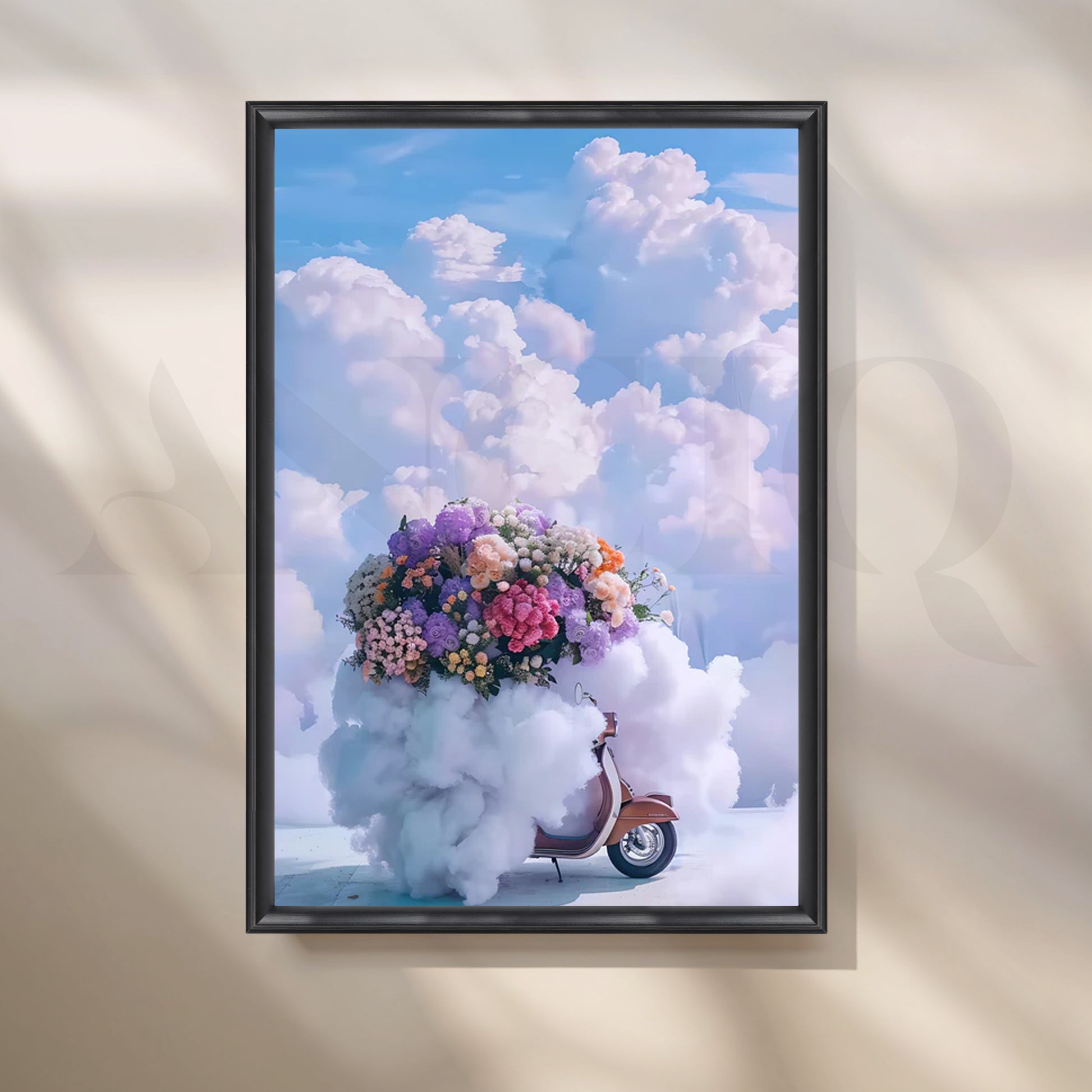 A whimsical scene of a vintage scooter bursting through soft clouds with a lush bouquet of pastel flowers—lavender, blush, peach and cream—set against a dreamy blue sky. This playful, surreal wall art brings light, airy charm to modern living rooms, bedrooms and creative studios. Perfect for shoppers searching pastel wall art, floral scooter canvas, dreamy cloud painting, whimsical home décor, Vespa art print, aesthetic bedroom wall art, cottagecore décor, and modern gallery wall pieces.