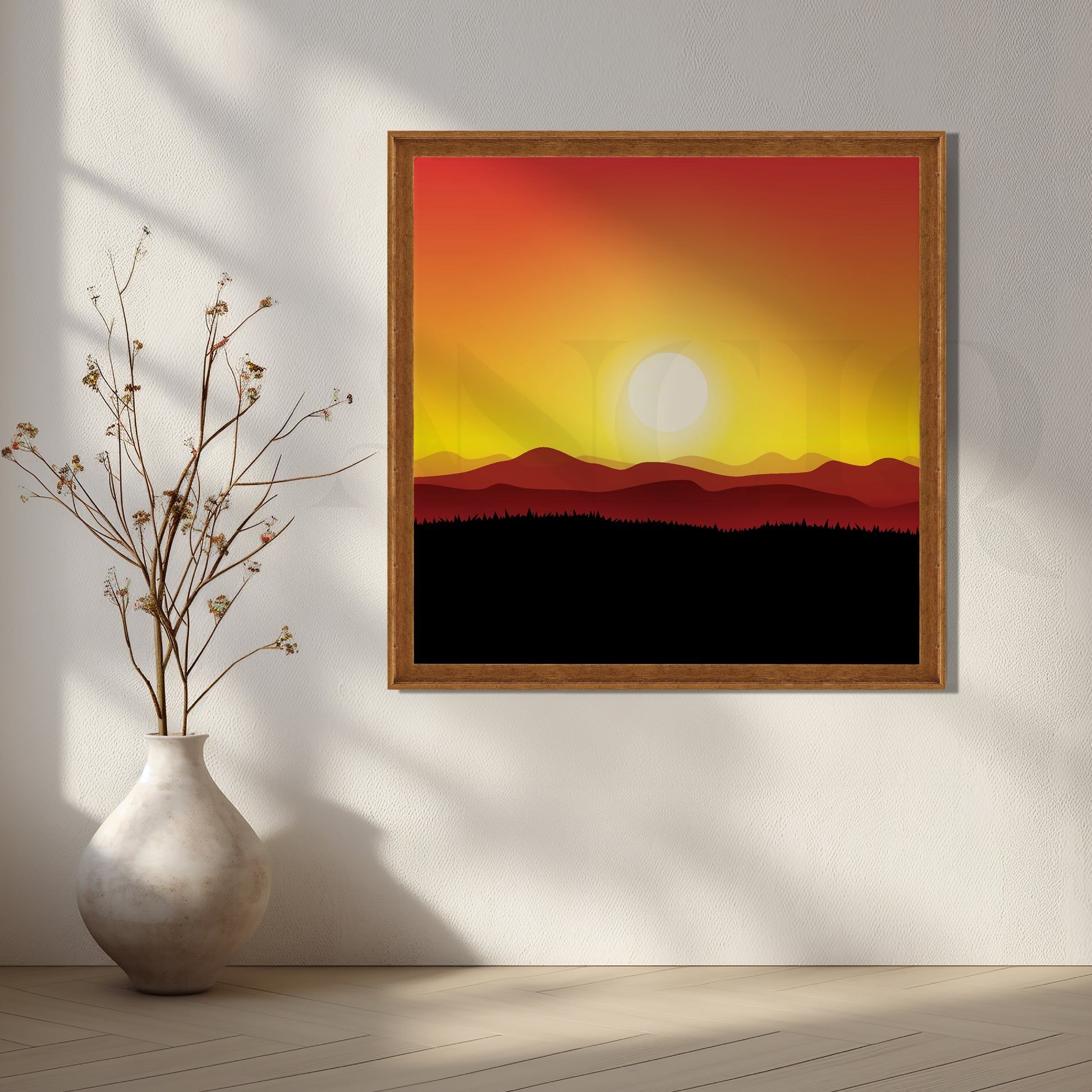 Bring the splendor of nature into your home with this stunning canvas painting of a sunset in the mountains. The bright colors of the sky and the silhouette of the mountains create a sense of peace and tranquility.