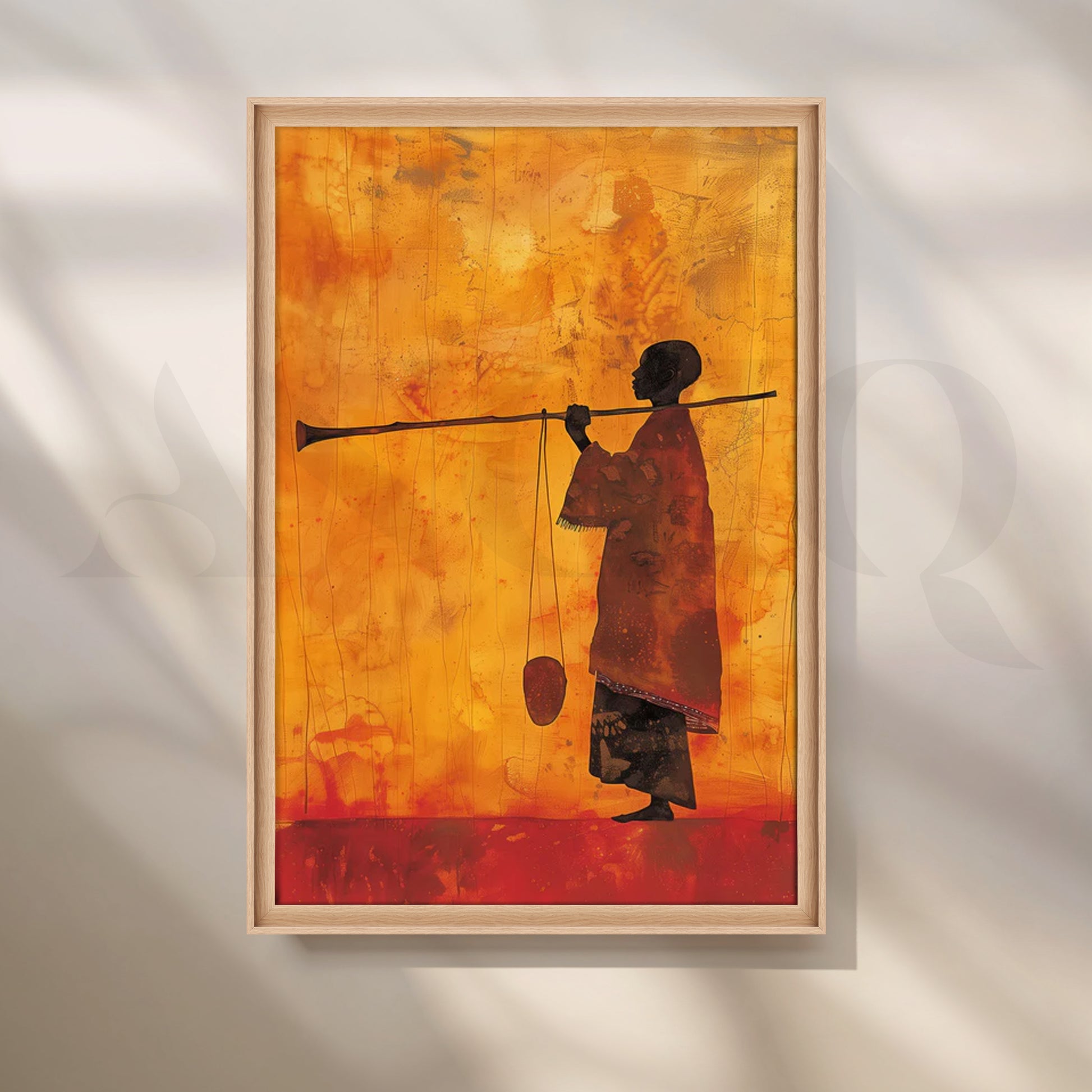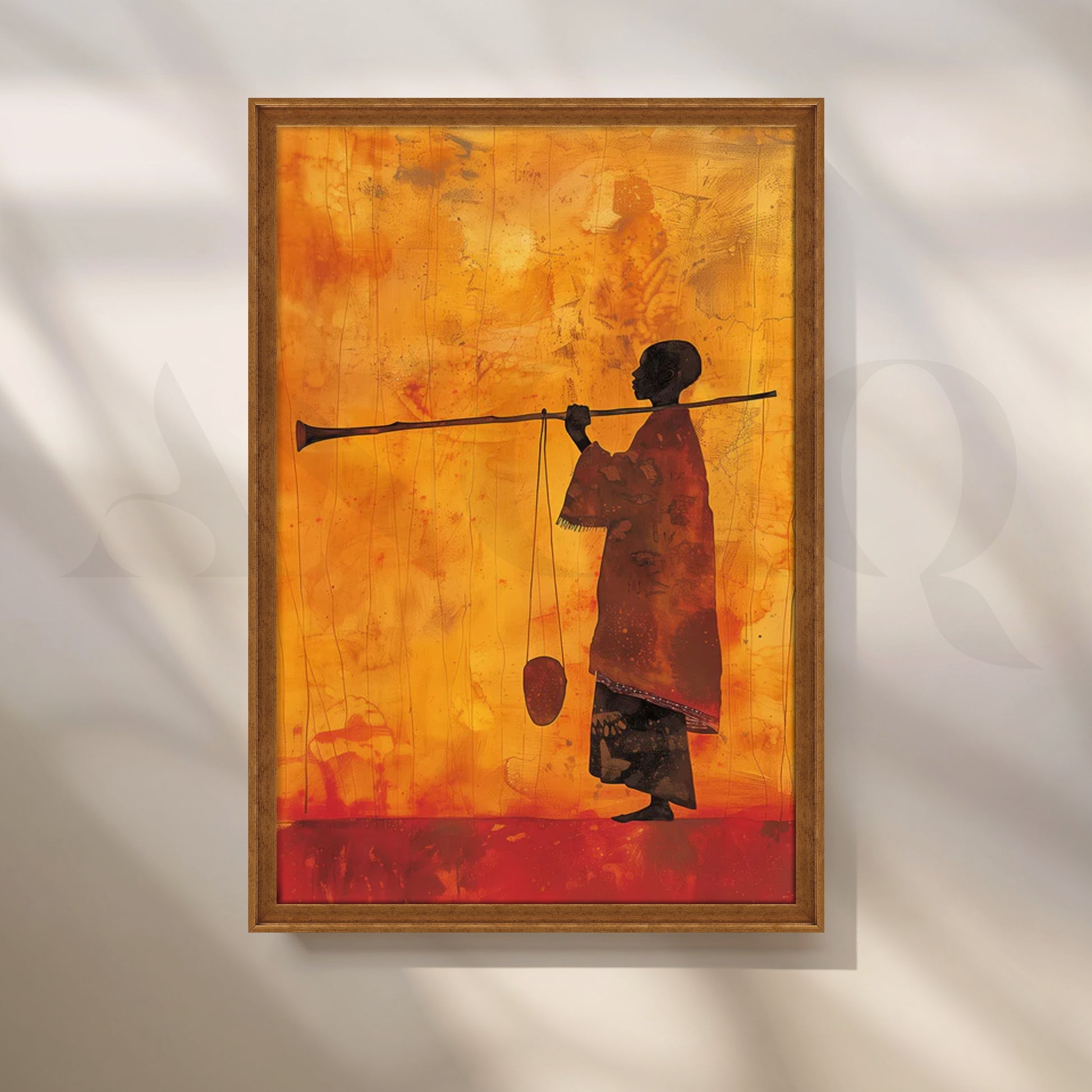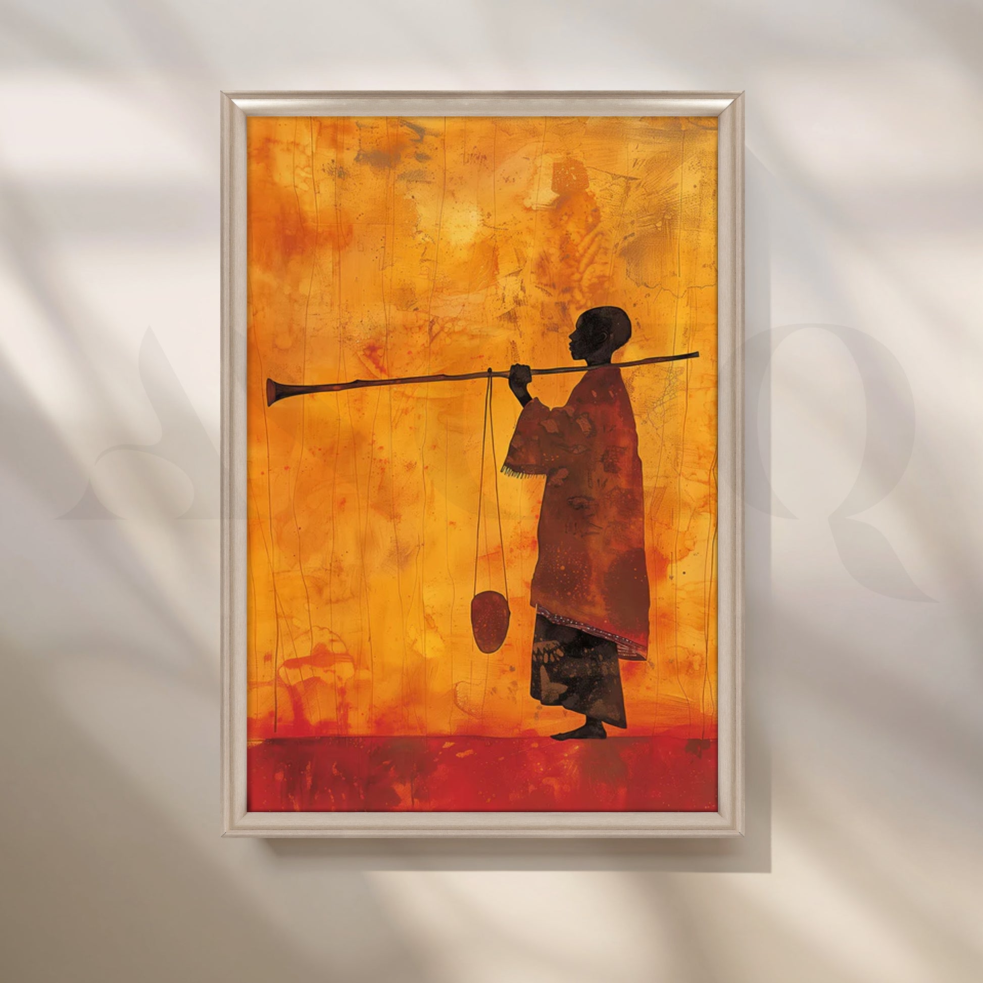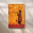 Set against sun-washed oranges and reds, a lone silhouetted figure stands with staff—quiet, contemplative, and powerful. The minimalist composition and rich, textured background create a refined modern canvas painting that centers a study or reading corner. Perfect for contemporary wall art, office décor, or a calm meditation space.