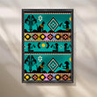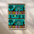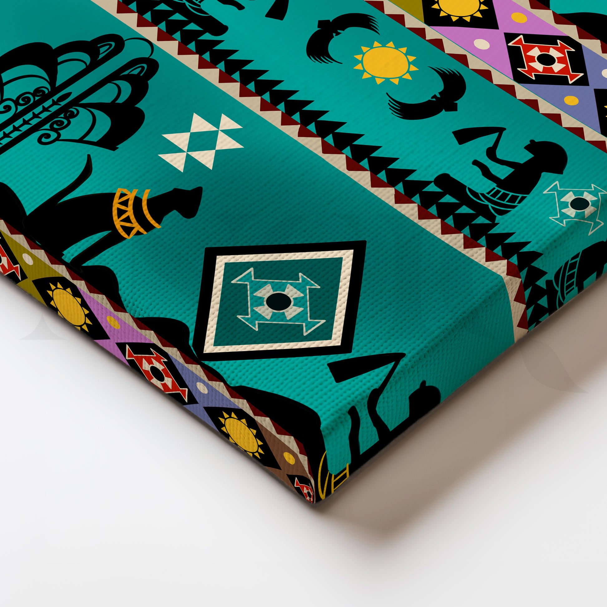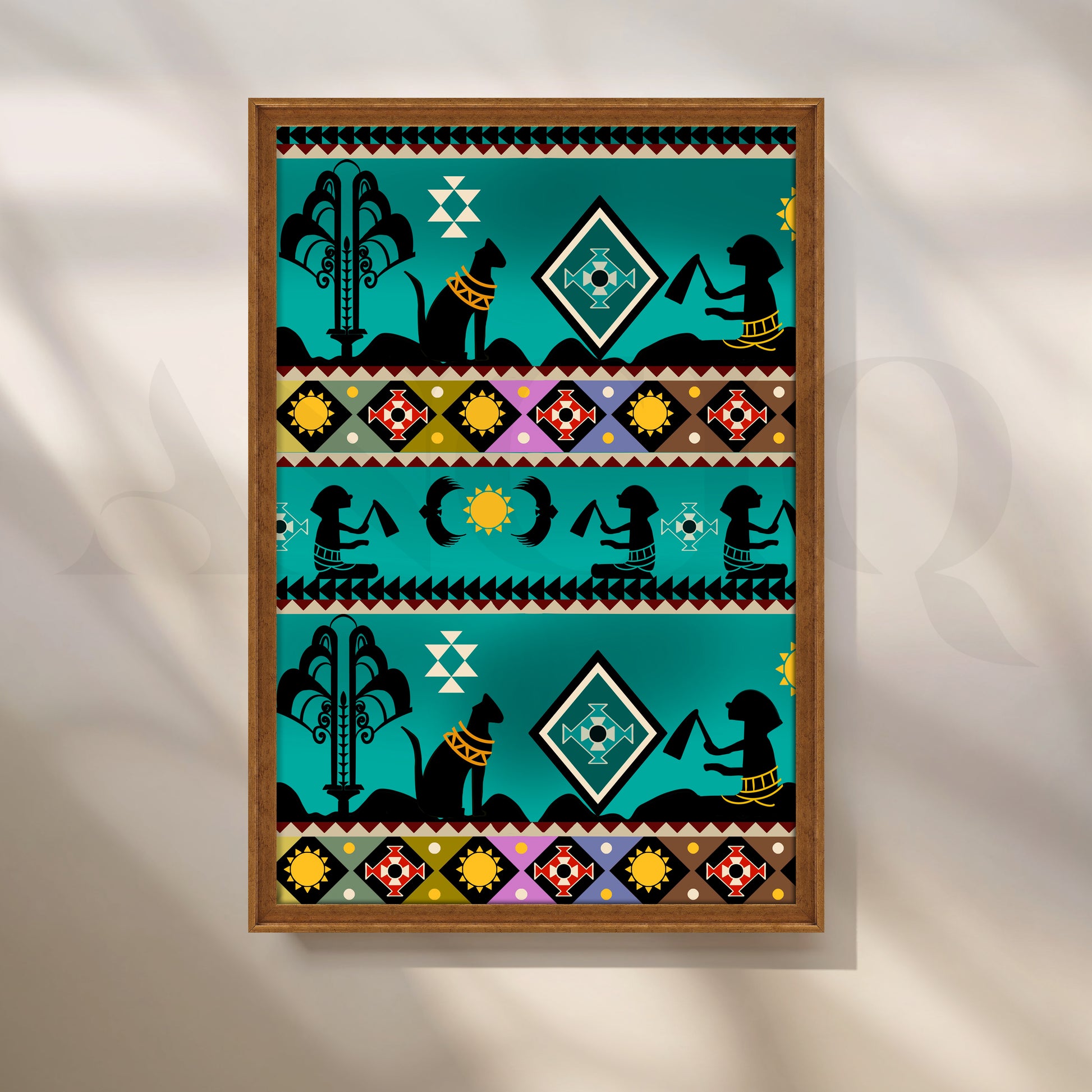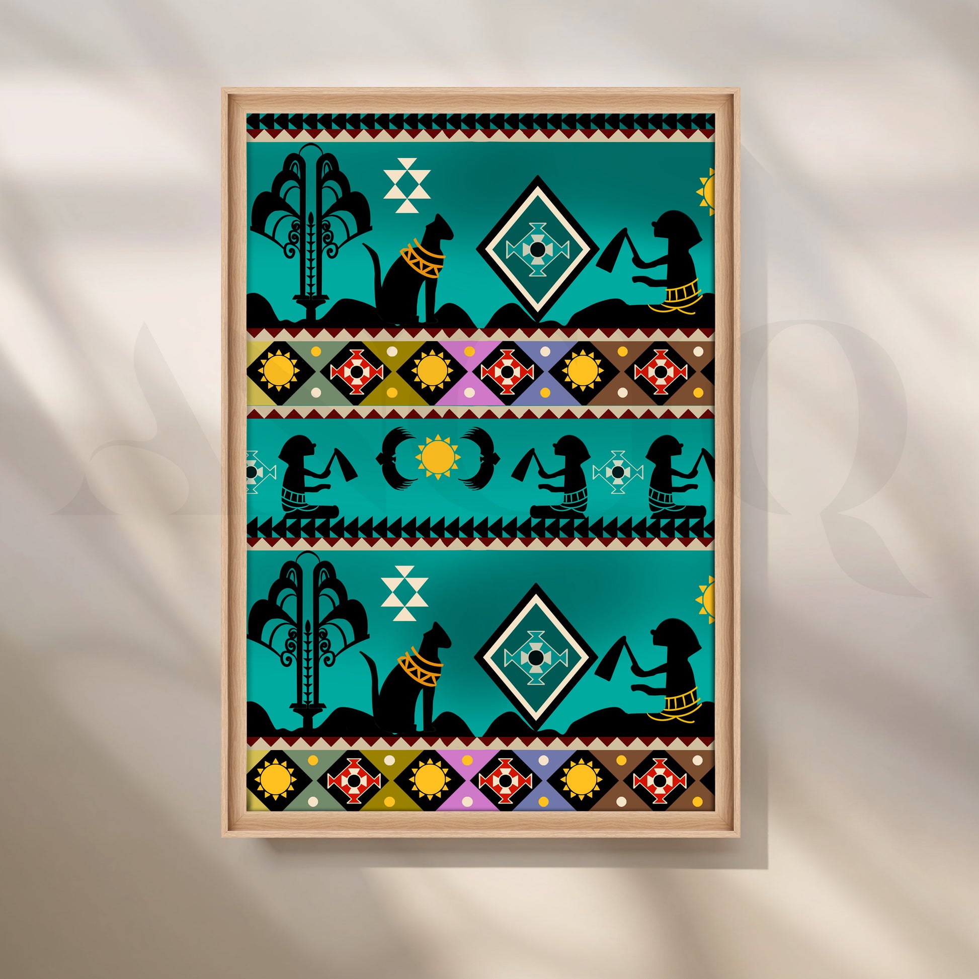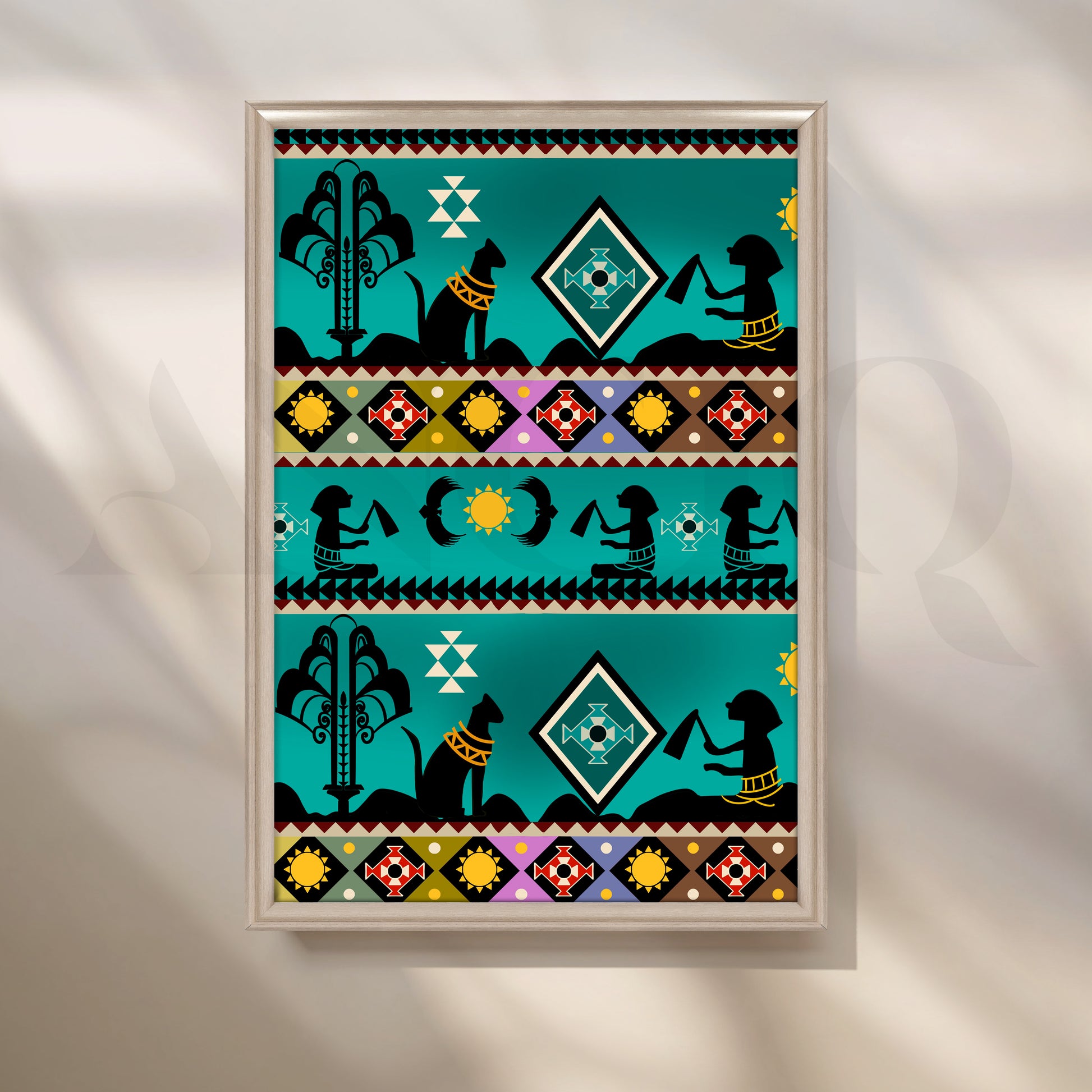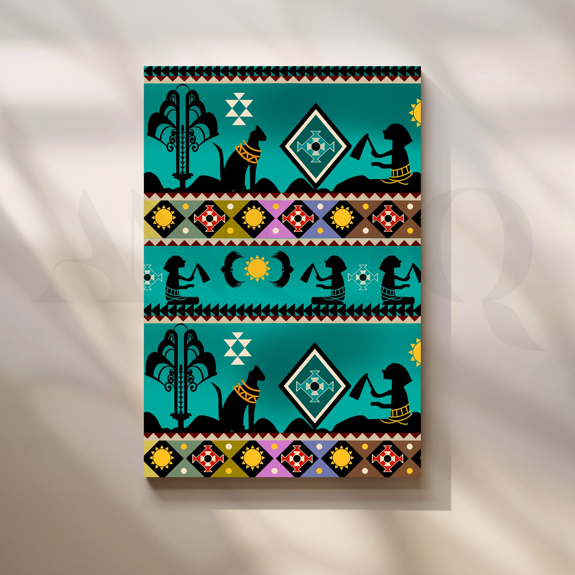 This turquoise Anciq artwork features Egyptian-inspired silhouettes, sacred cats, and geometric patterns in bold multicolor bands. Perfect for study rooms or creative spaces with a global aesthetic. Keywords: Egyptian wall art, tribal modern painting, cultural motif canvas, turquoise abstract decor, bohemian study room artwork.