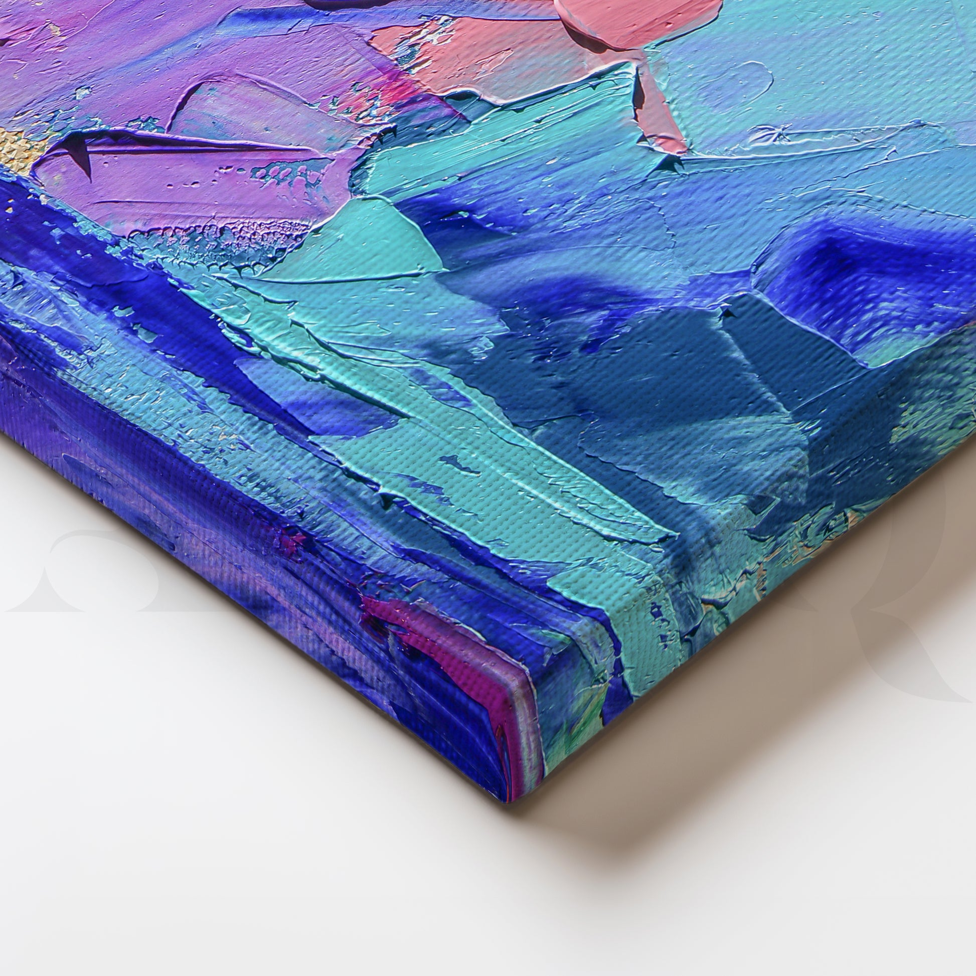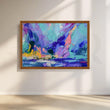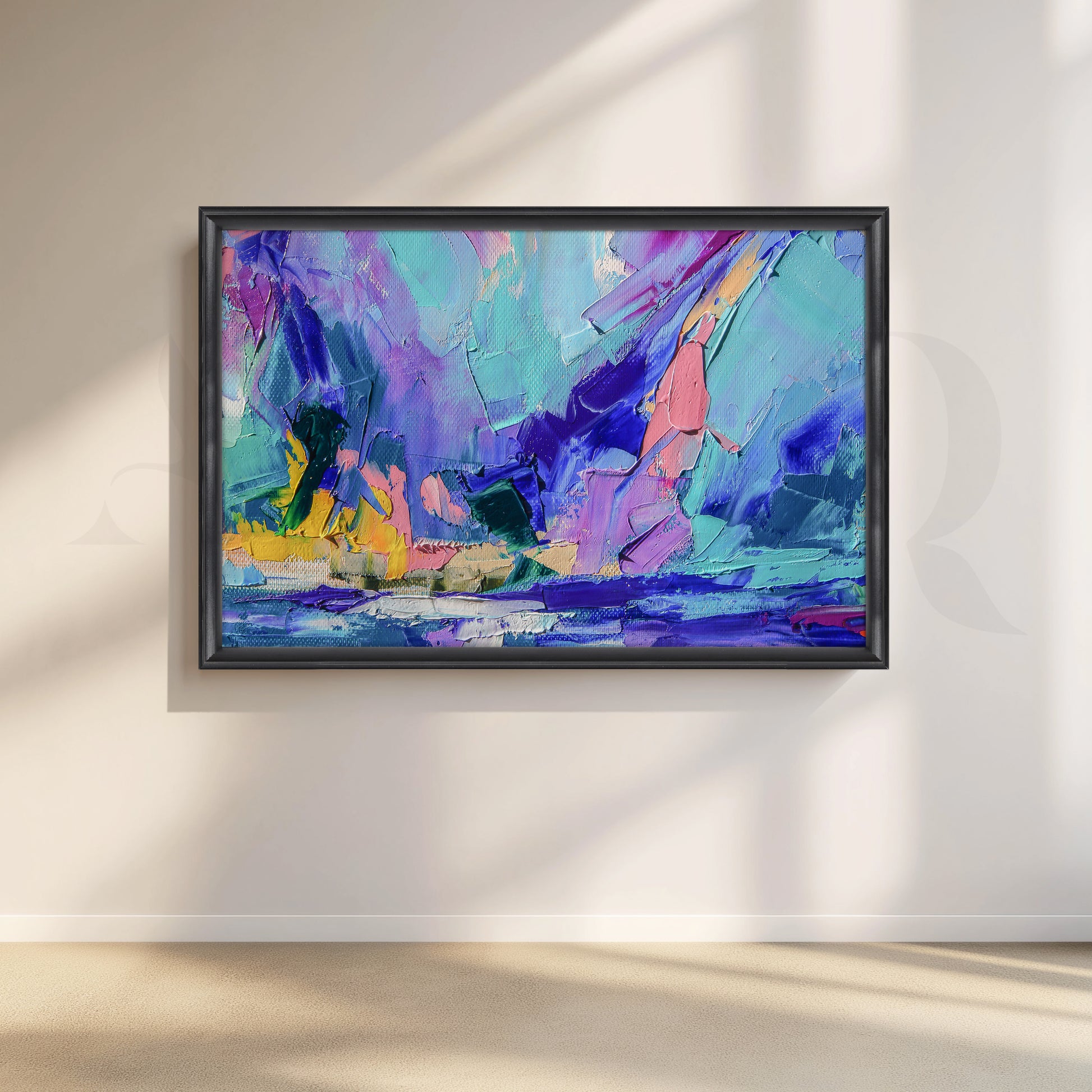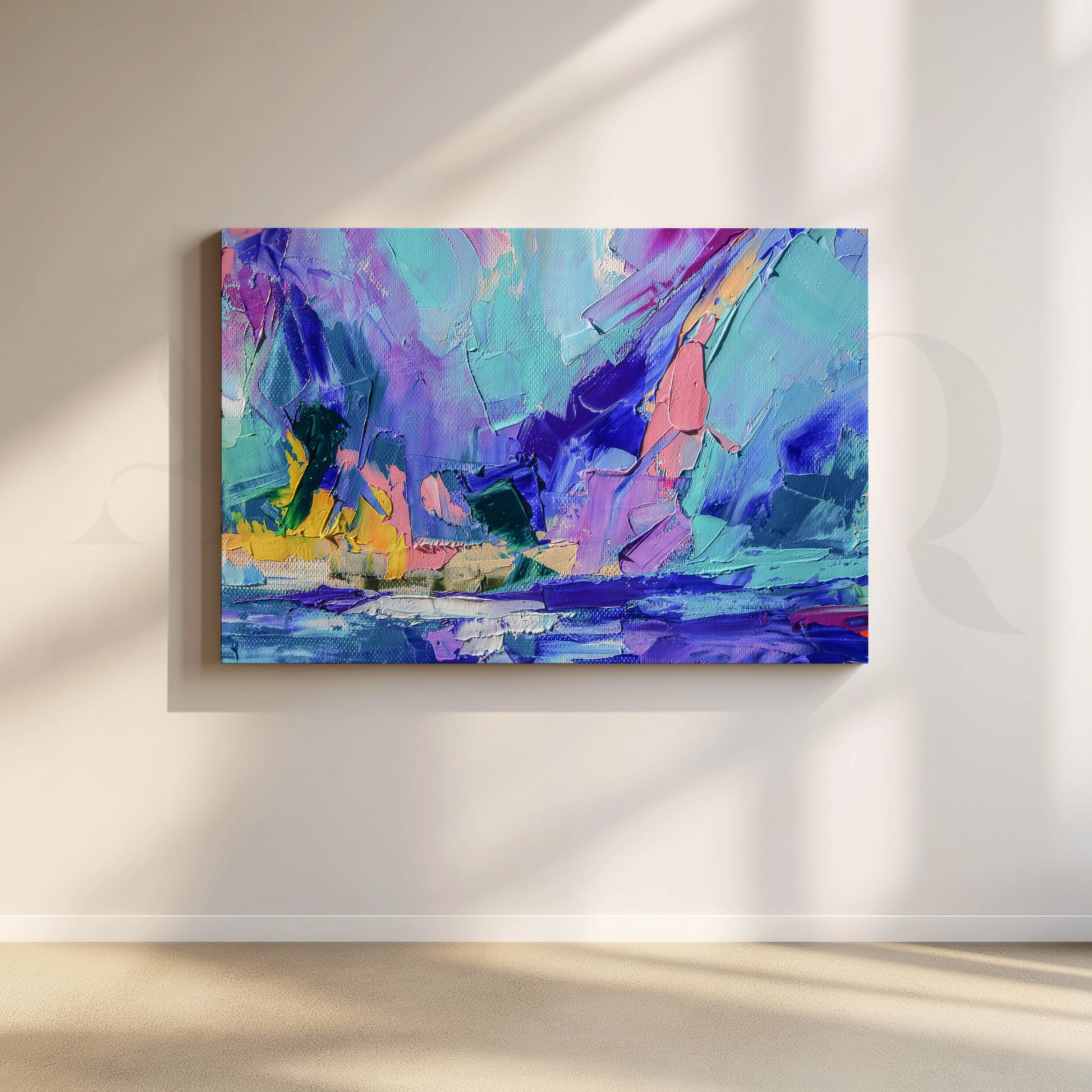 Experience a vivid explosion of colors with this abstract artwork masterpiece. Rich purple and blue blend seamlessly with bright splashes of yellow, green, and pink, creating a mesmerizing and charming composition. The bold, textured strokes invoke a sense of movement and depth, making this beautiful abstract art a focal point for any modern space.