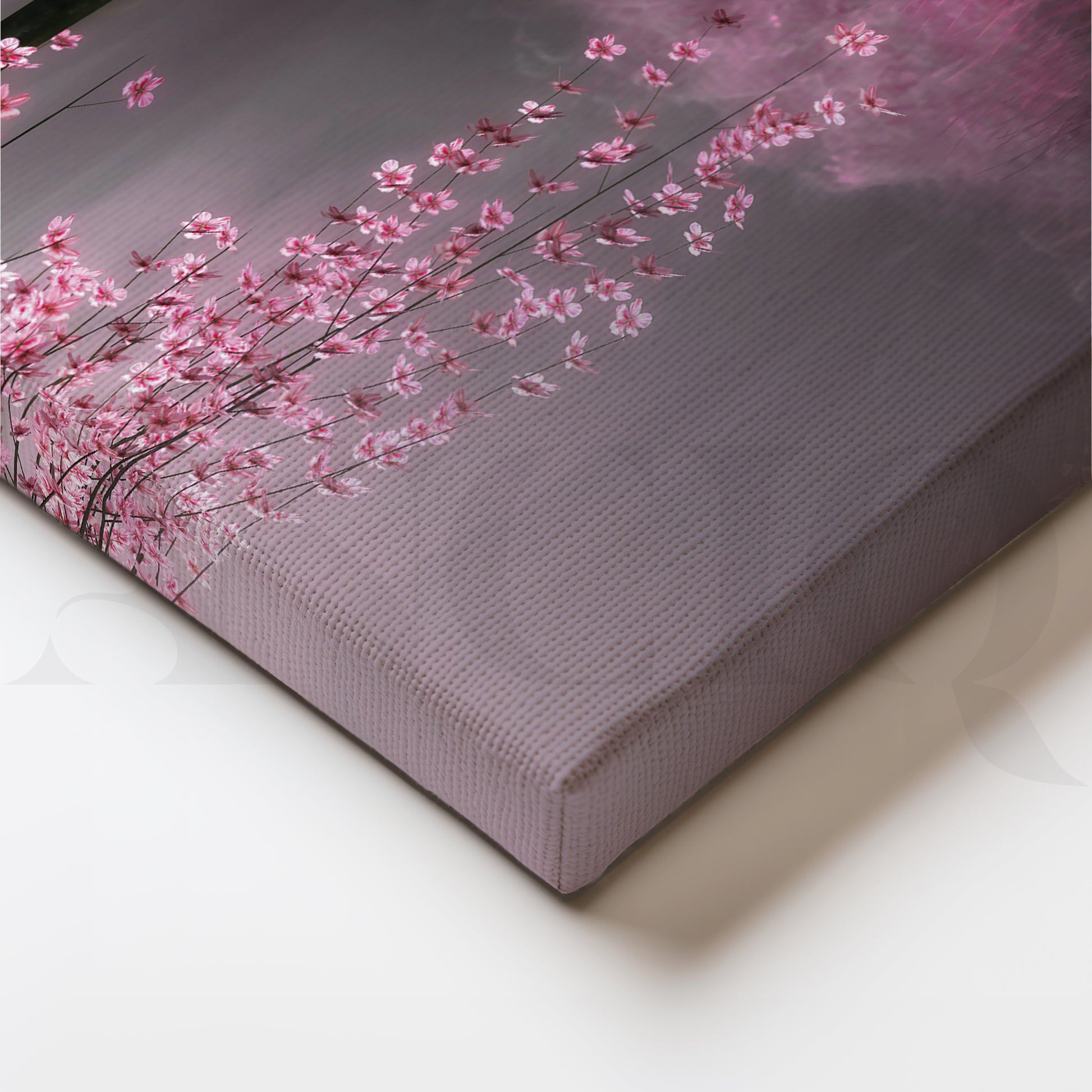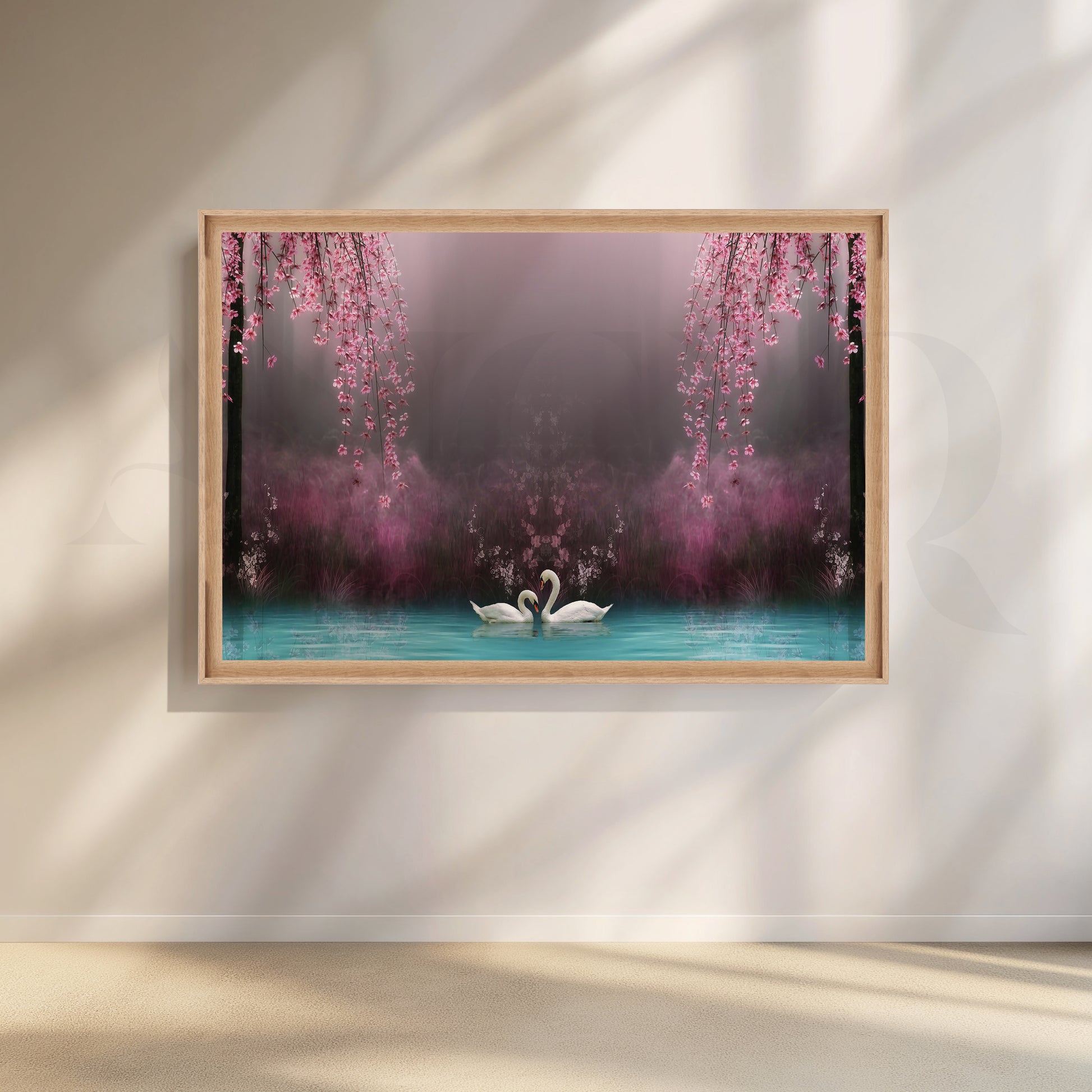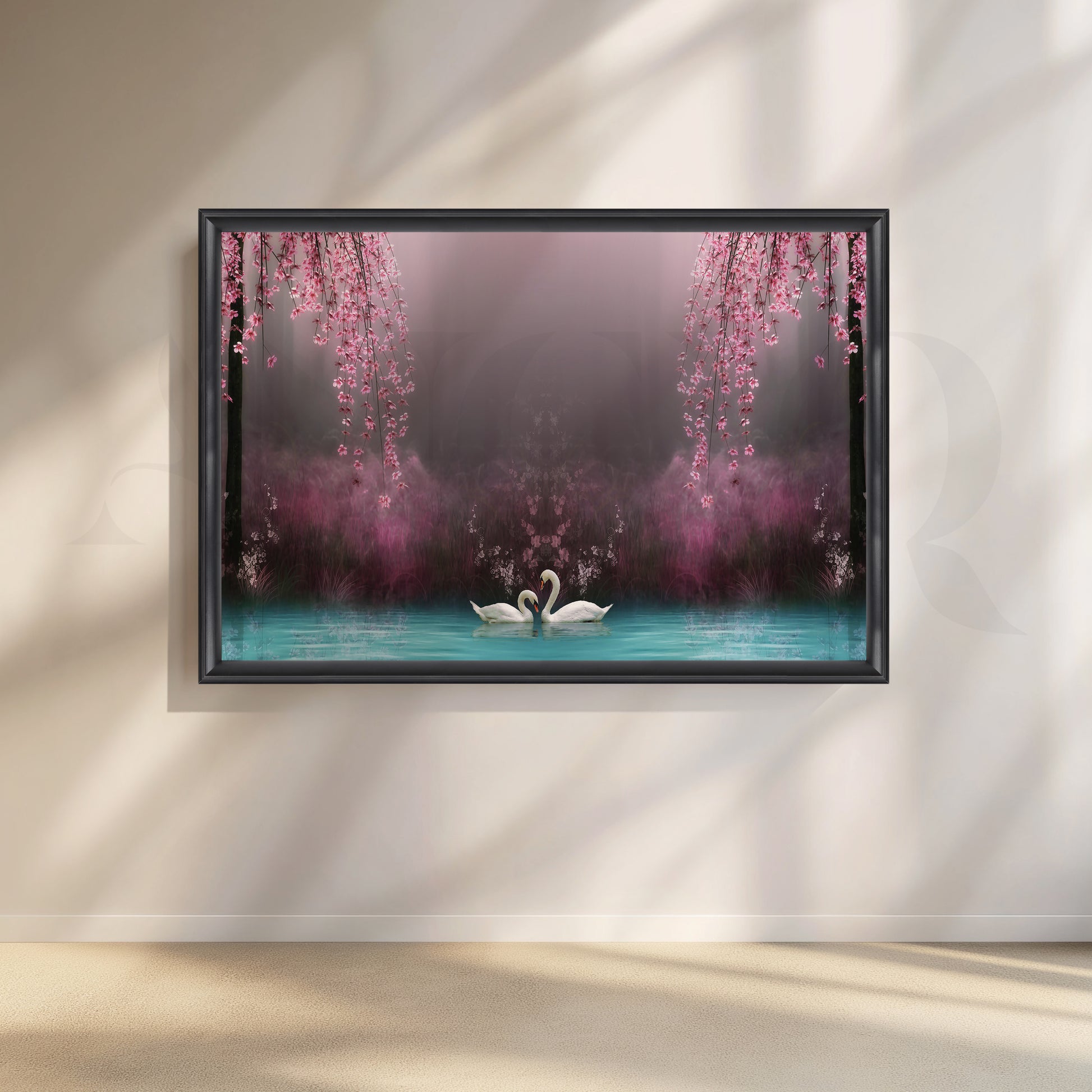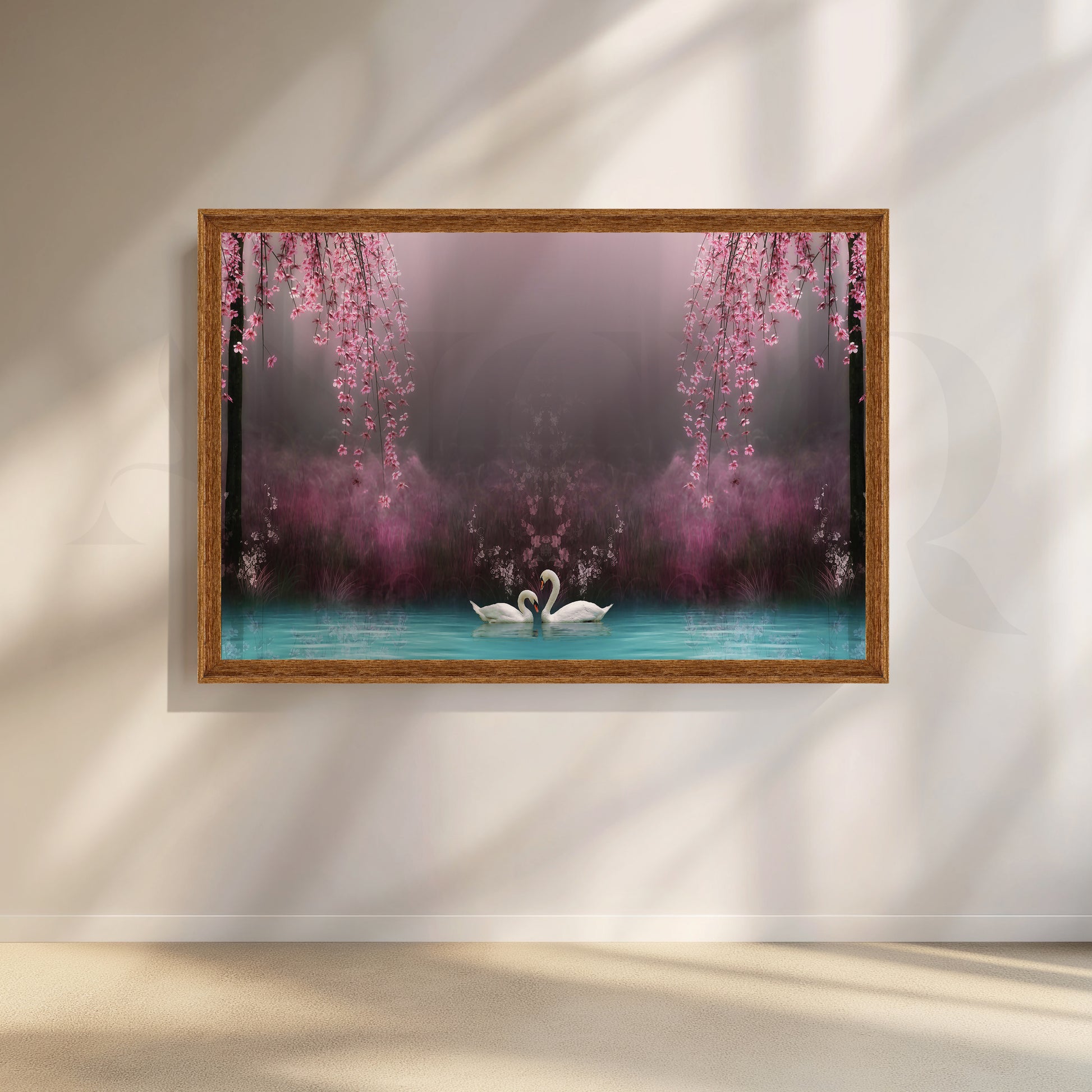 Immerse yourself in a dreamlike scene. This painting captures two swans gliding gracefully beneath a canopy of delicate cherry blossoms. Soft brushstrokes and a calming palette create a tranquil escape for your home.