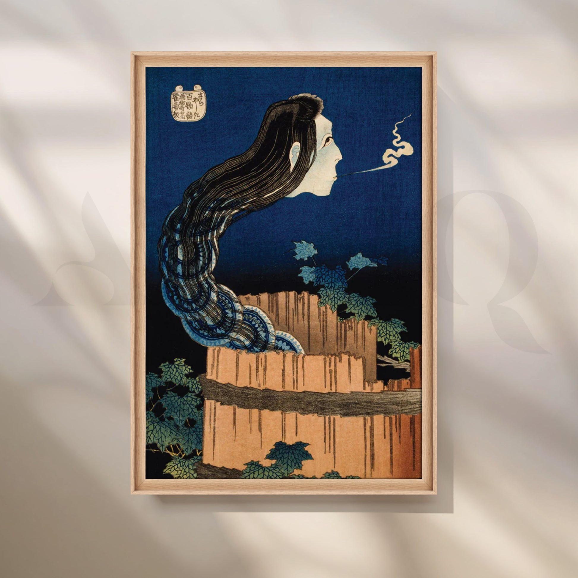 Channel moody Japanese folklore with “Ghost in the Well Ukiyo-e,” a mesmerizing canvas featuring a pale yōkai face and flowing black hair rising from a wooden barrel against deep indigo night. The vintage woodblock texture, rich navy and teak tones, and botanical accents create atmospheric, minimalist drama that pairs beautifully with modern, Japandi, and eclectic interiors. Perfect as modern wall art above a sofa, console, or reading nook, this piece attracts shoppers searching for Japanese wall art, ukiyo-e canvas print, yokai art, vintage Japanese poster, zen bedroom décor, and large living room art.
