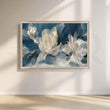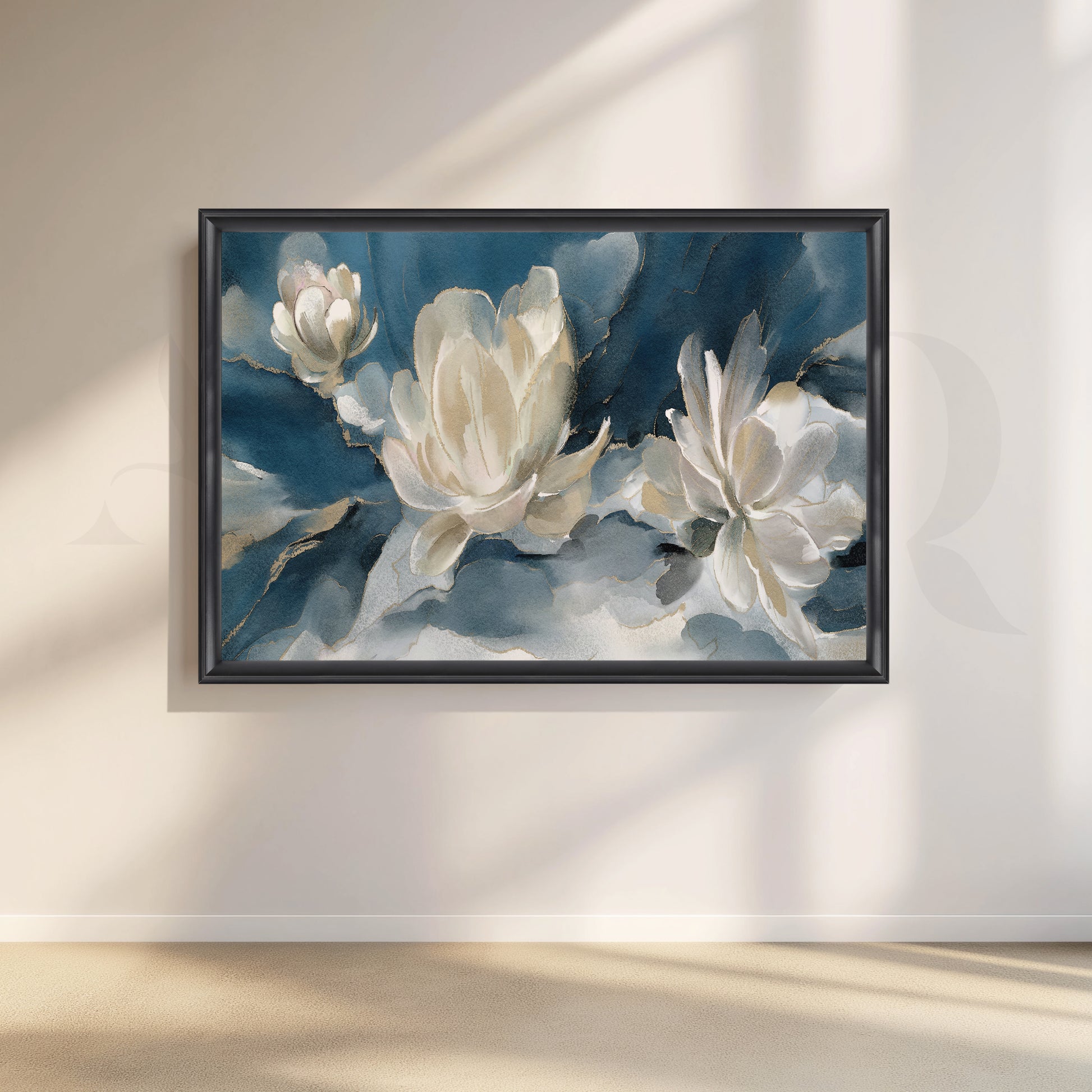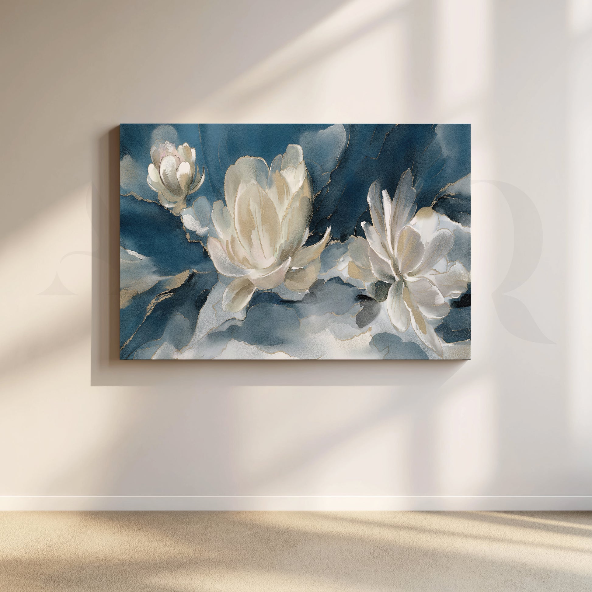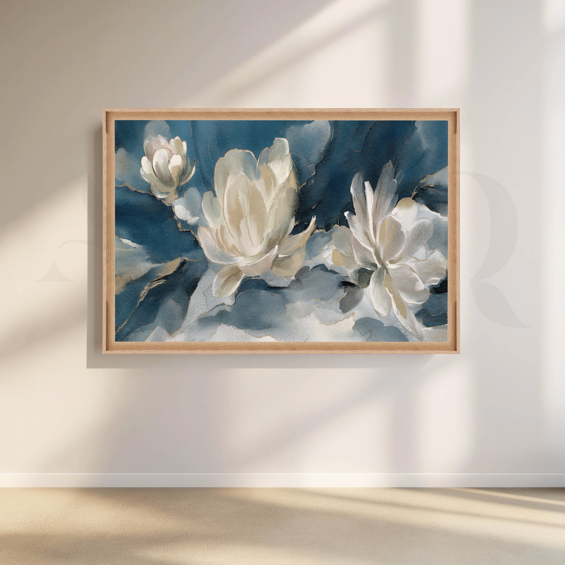 This triptych features a beautiful depiction of water lilies in a watercolor style. The flowers are white and delicate, and the blue background is serene and calming. The triptych design creates a modern and stylish look. This artwork would make a great addition to any home or office.