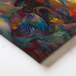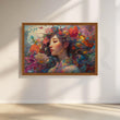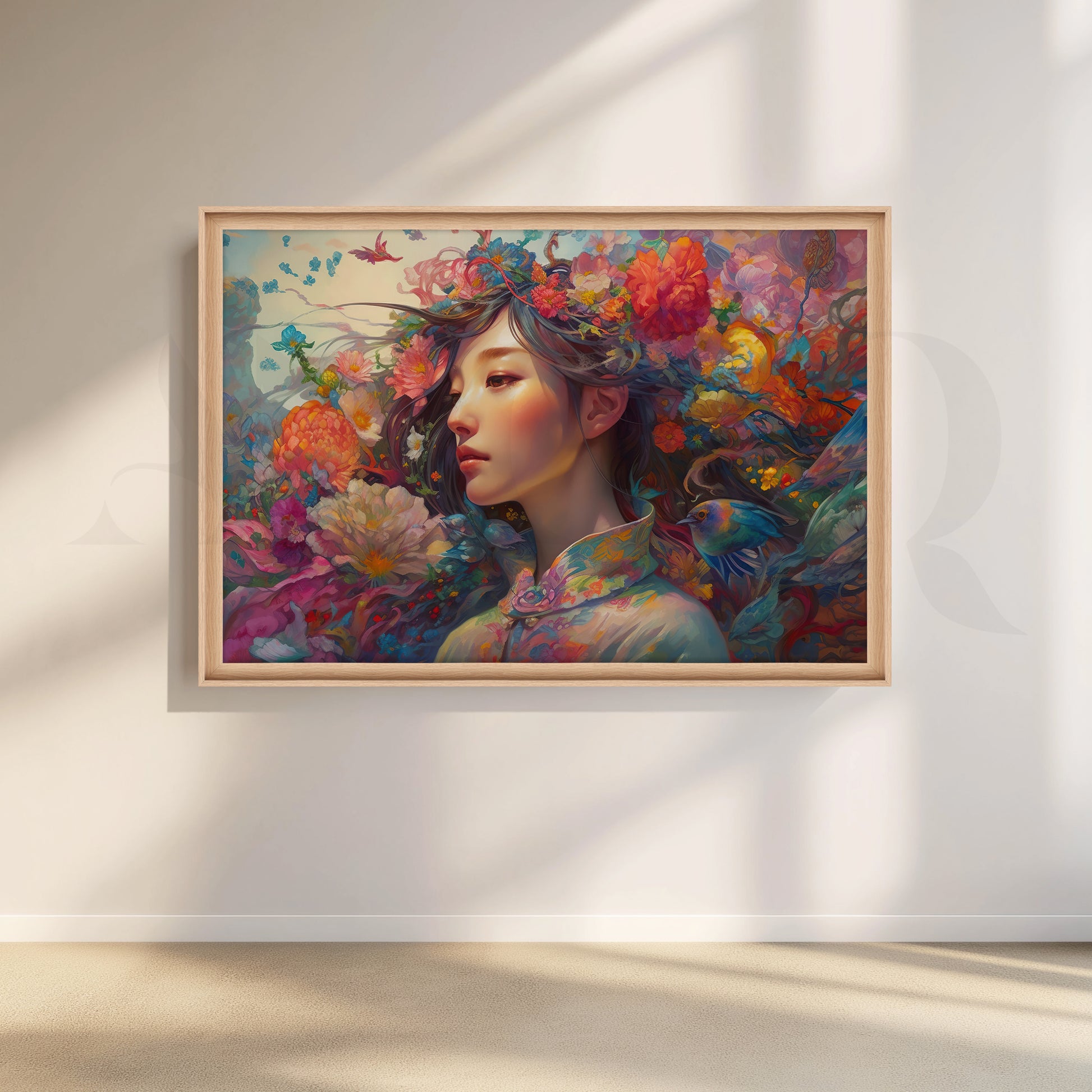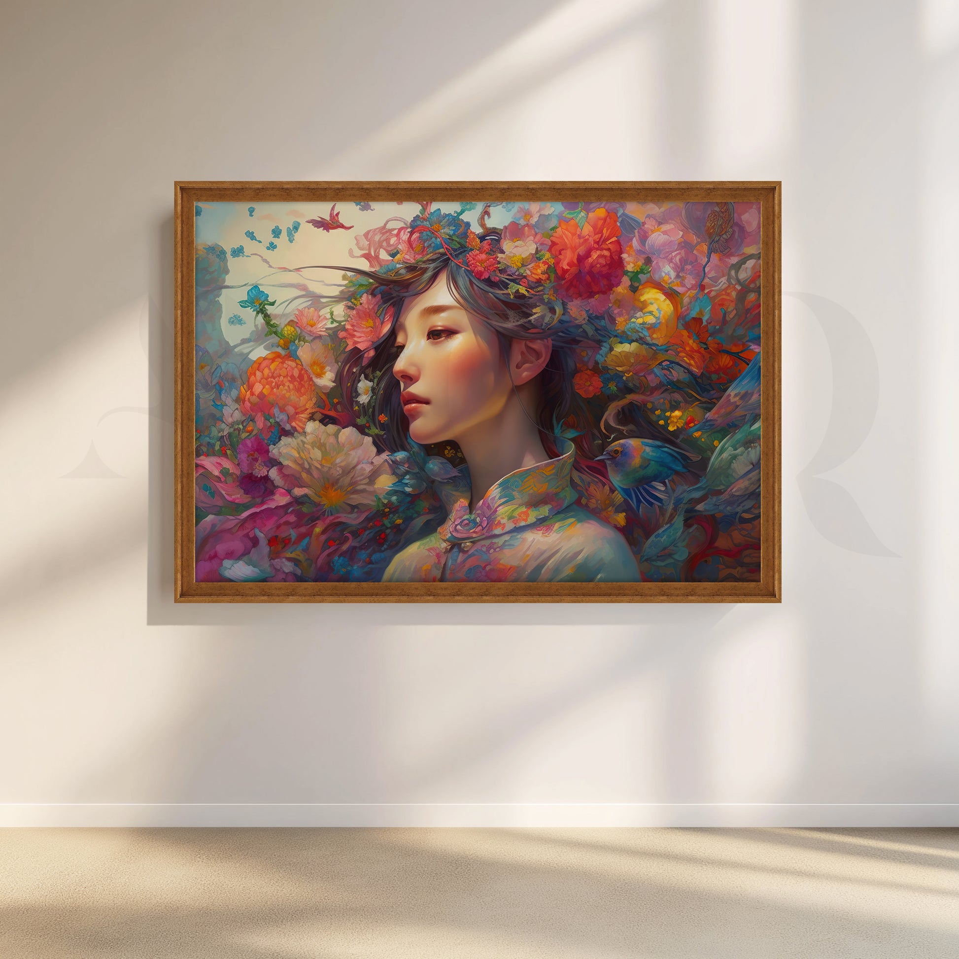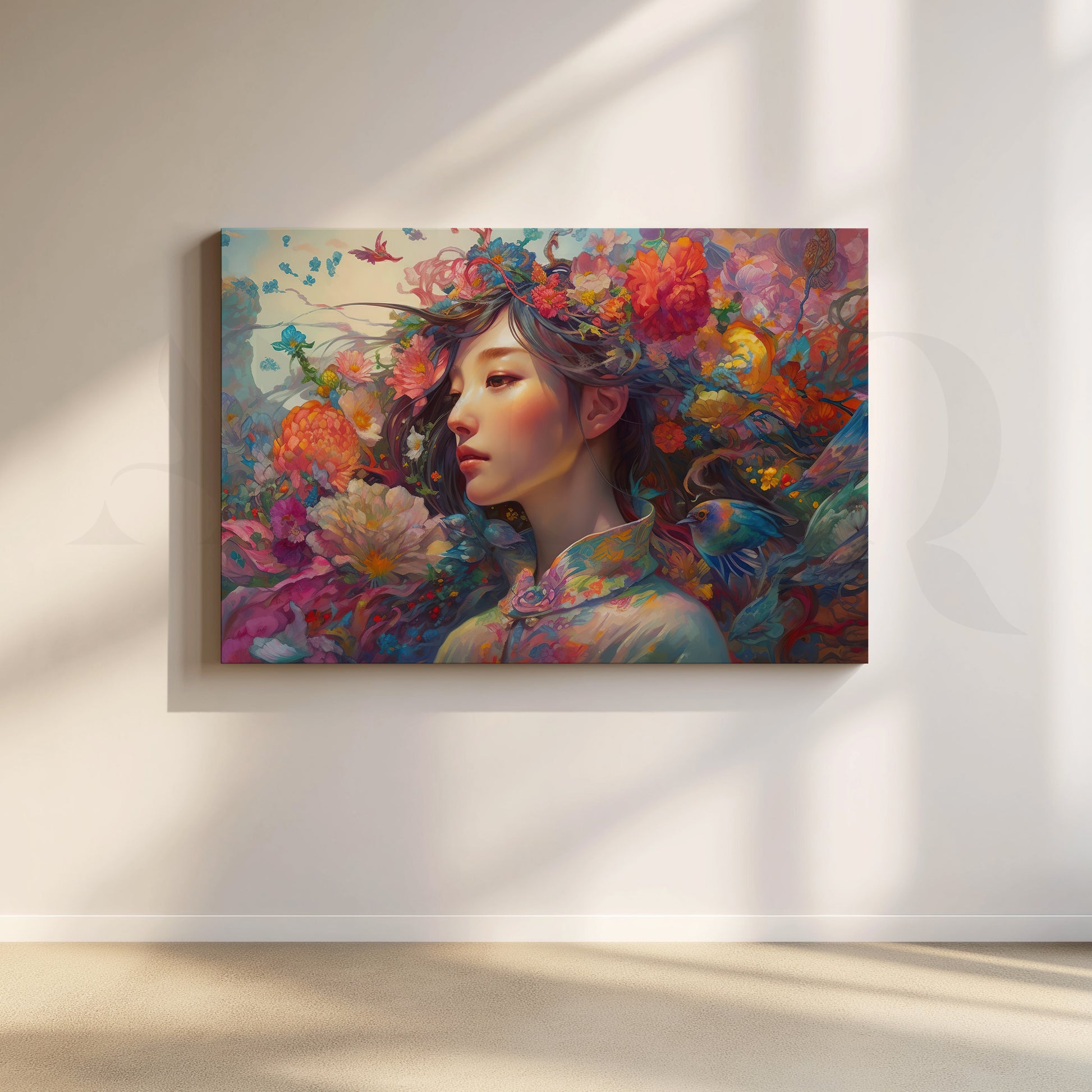 This stunning canvas artwork features a vibrant floral portrait of a woman surrounded by colorful flowers and birds. The intricate details and vivid colors create a mesmerizing visual experience, making it a perfect addition to any art collection.