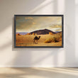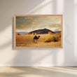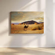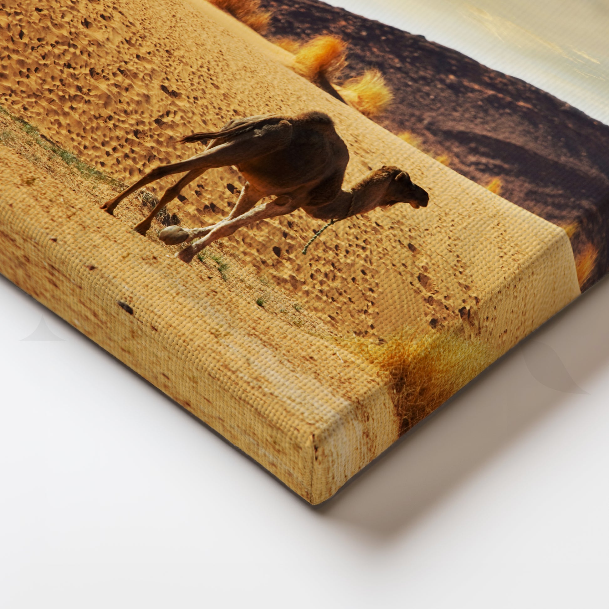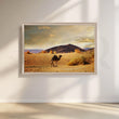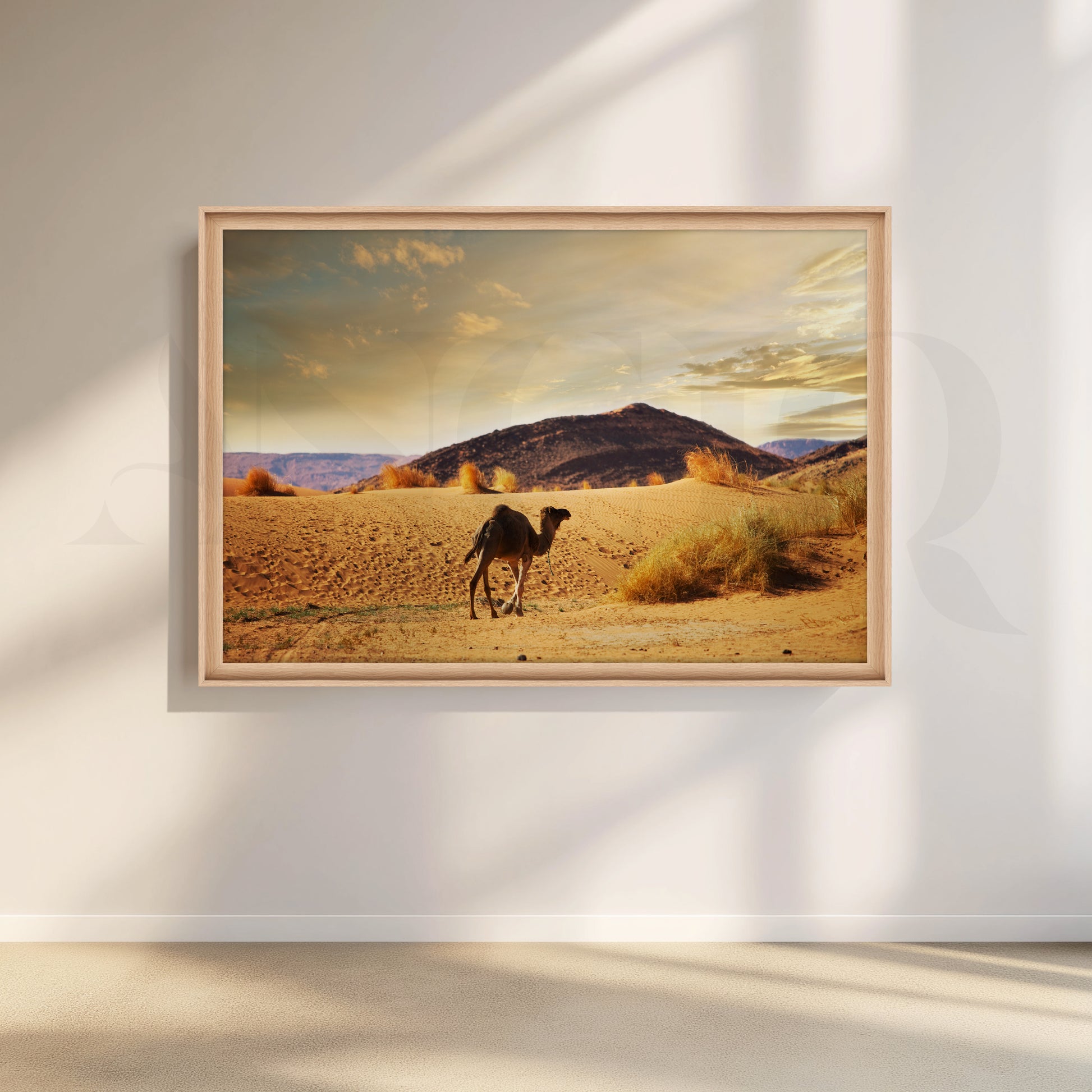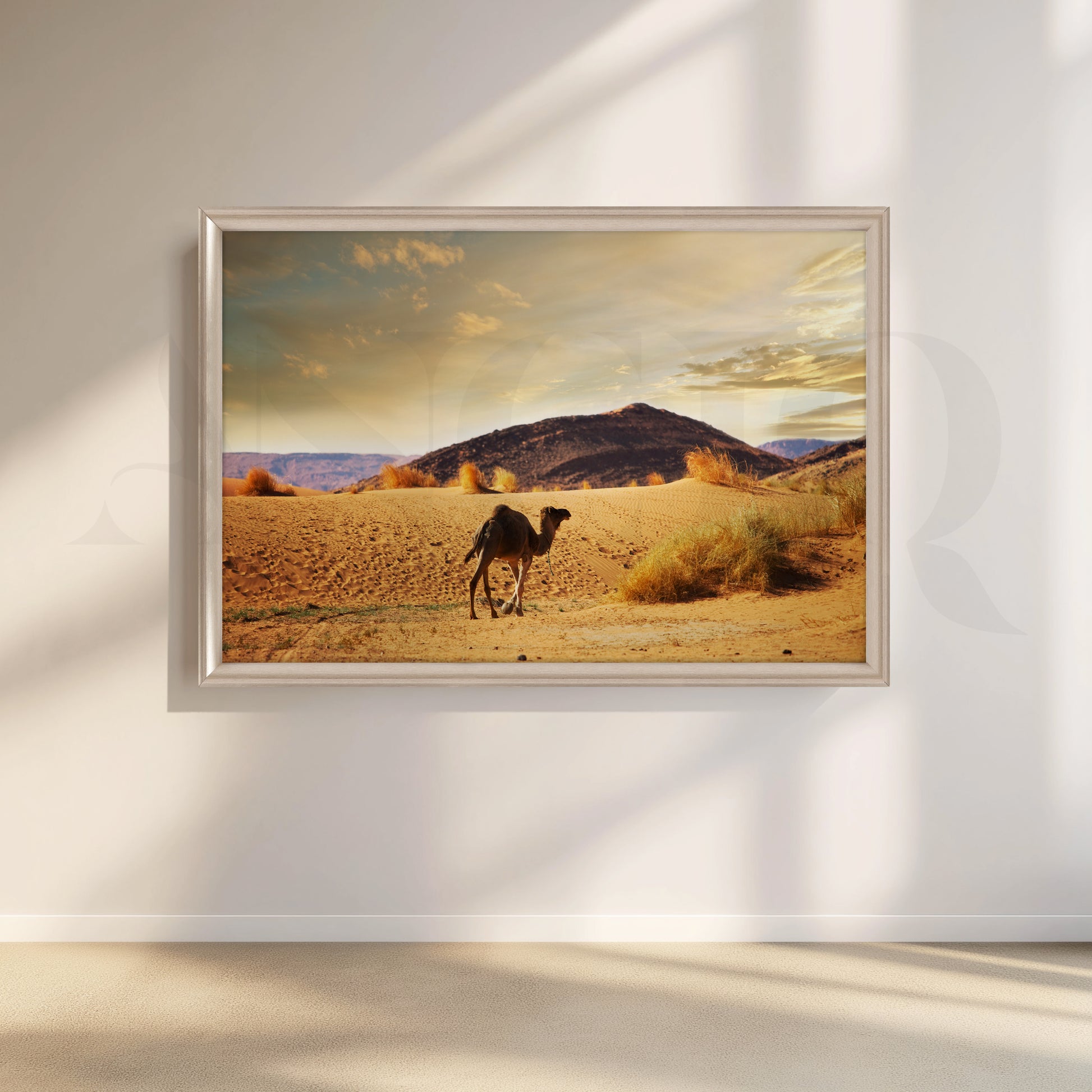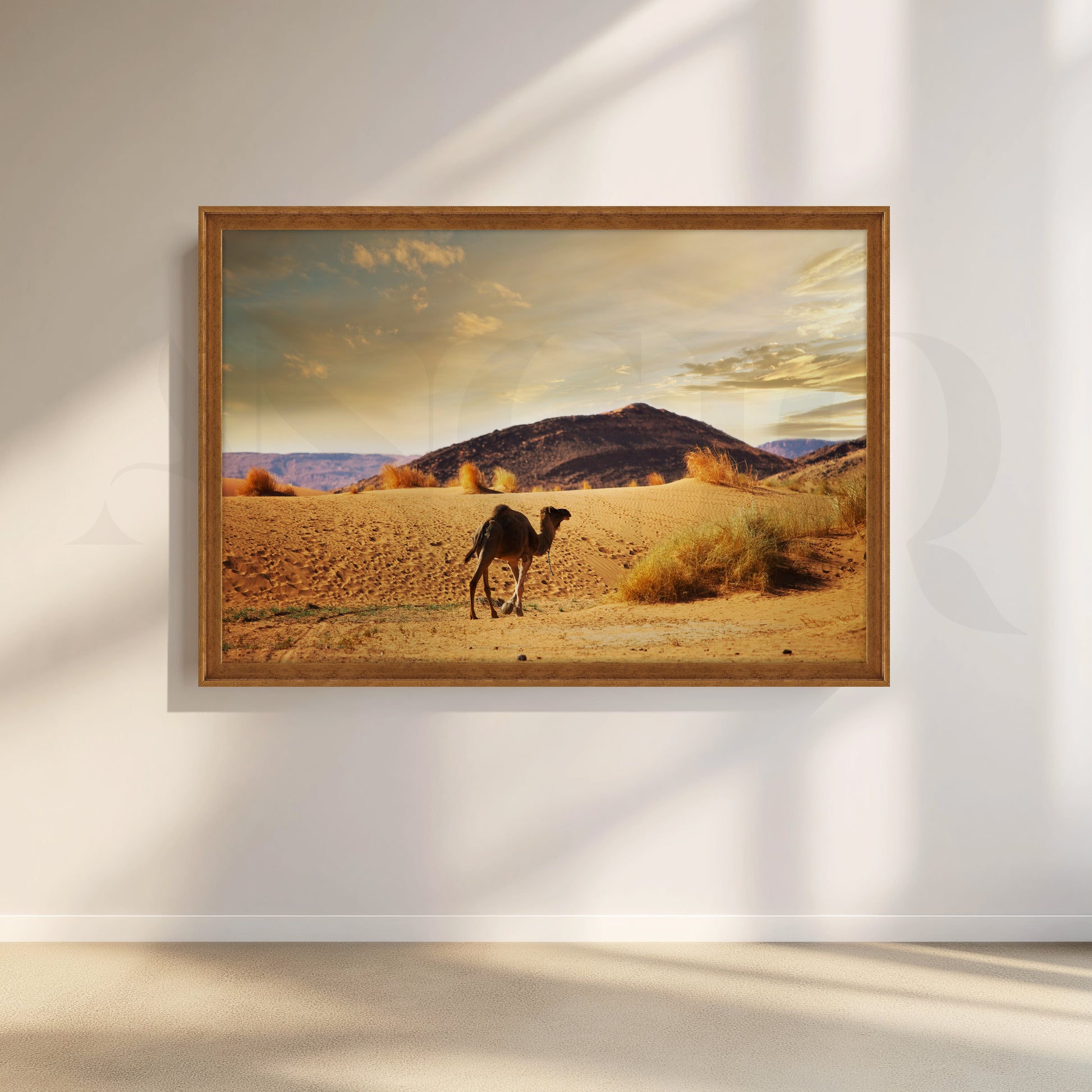 Soft, warm light and a single camel in an expansive desert create a peaceful visual perfect for quiet reading corners or guest bedrooms.