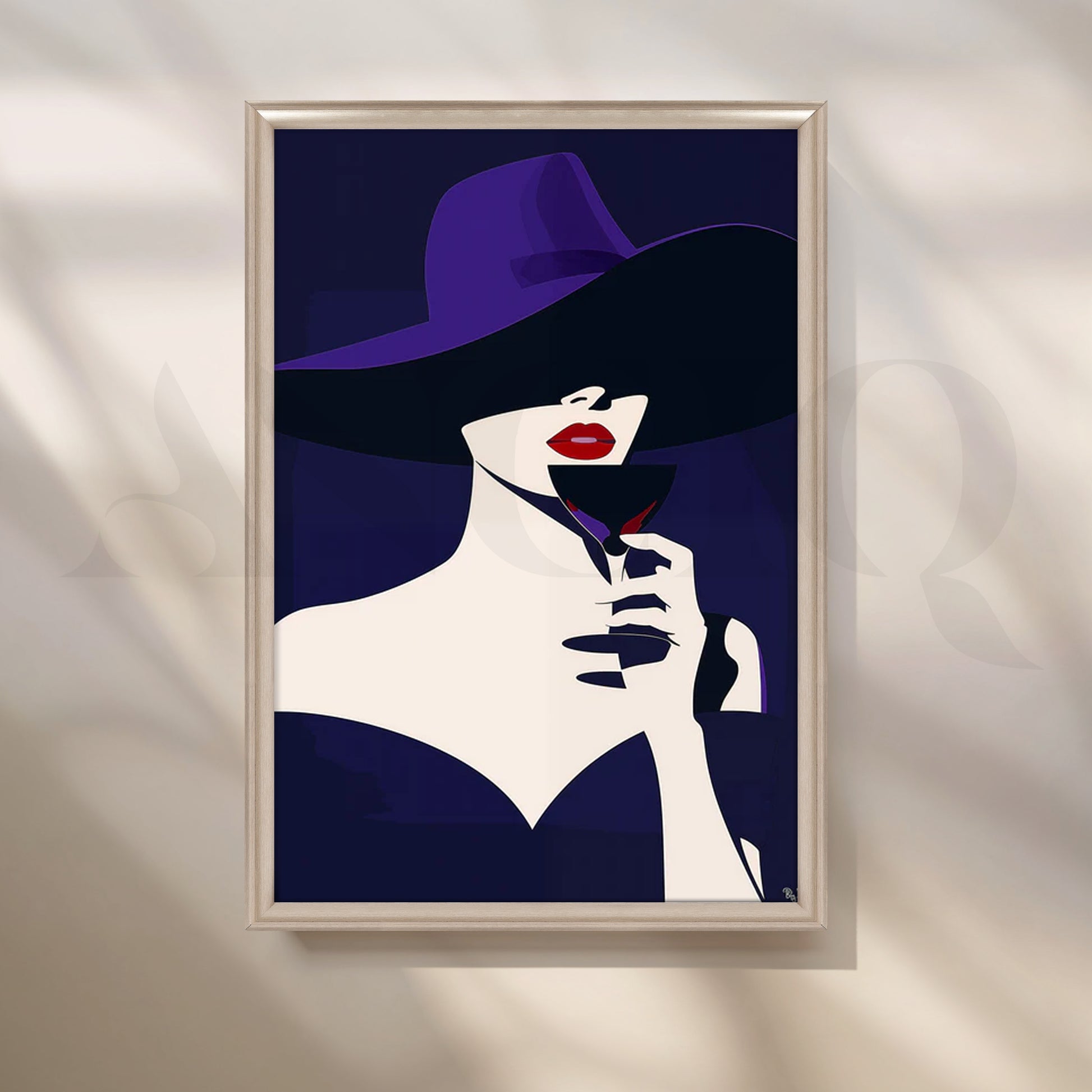 “Violet Noir” blends pop-art minimalism with Old Hollywood glamour: a mysterious woman in a wide-brim purple hat and vivid red lipstick, elegantly holding a martini against deep indigo and cream tones. This modern wall art delivers a sleek, graphic look with clean lines and high contrast—perfect as home bar wall art, dining room décor, or a chic focal point above a bar cart. The bold palette (violet, navy, ivory, and scarlet) complements contemporary, glam, and Art-Deco interiors, adding a sophisticated cocktail-hour vibe. Ideal for shoppers seeking minimalist canvas painting, pop art wall décor, large living room art, and modern bedroom or office lounge accents, this statement canvas elevates any space with effortless style.