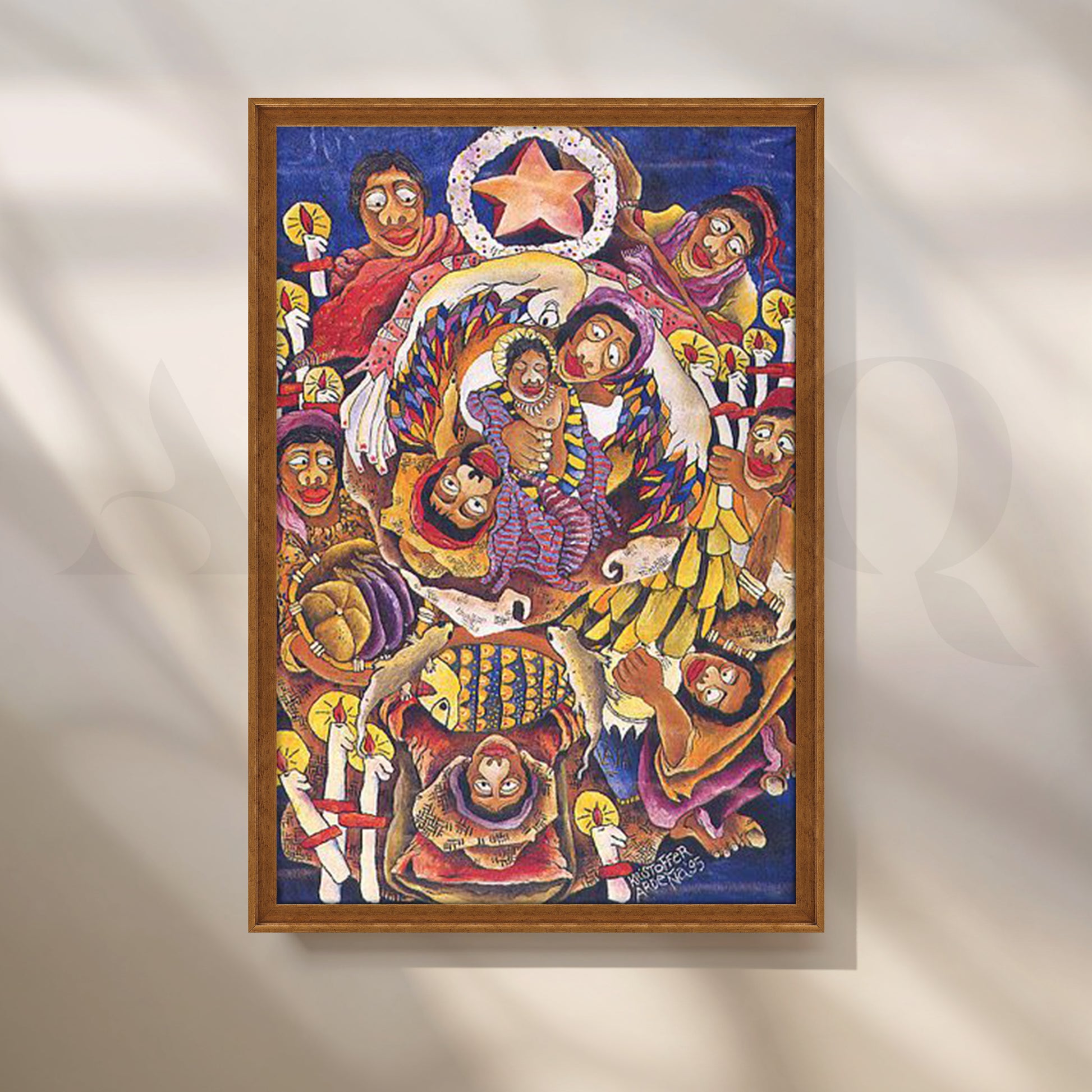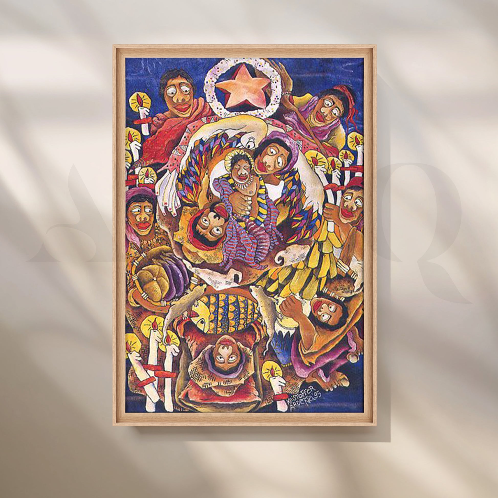 This expressive nativity folk canvas Artwork bursts with colour, emotion and storytelling. Layered figures, angels and glowing candles create a warm, festive scene that draws the eye. Perfect Christmas wall decor for living rooms, hallways or prayer corners, it adds handcrafted charm and a joyful, celebratory mood to any space.