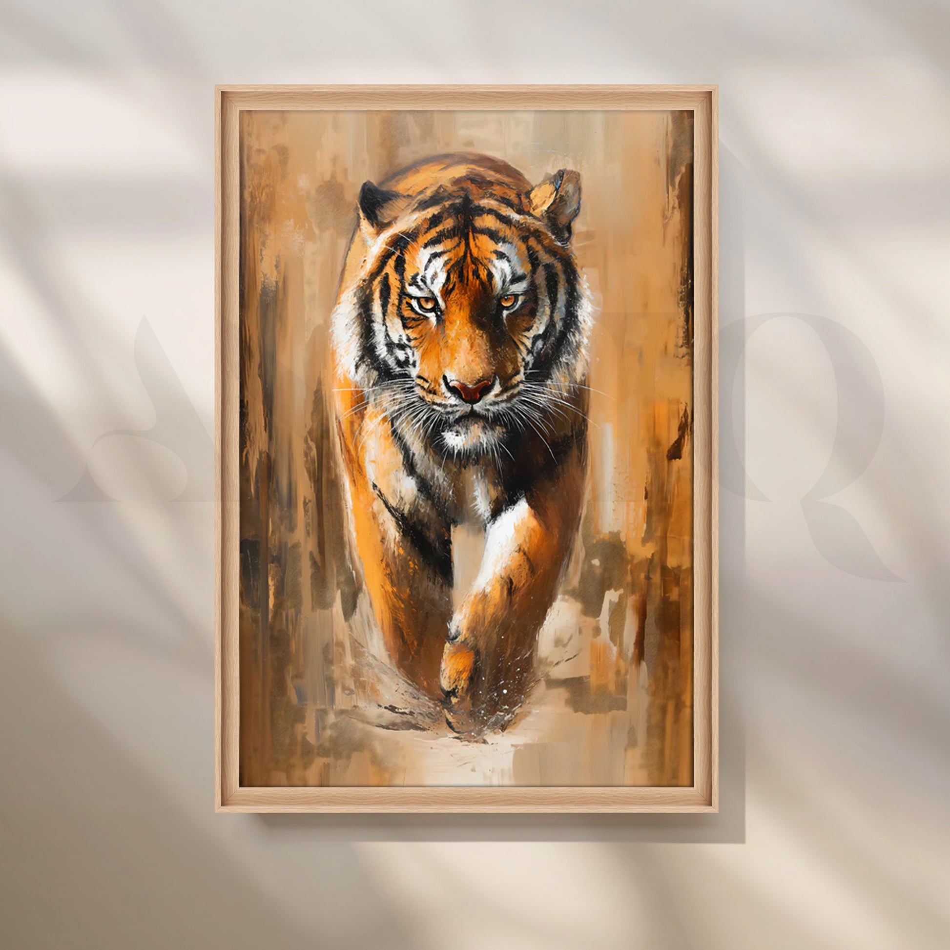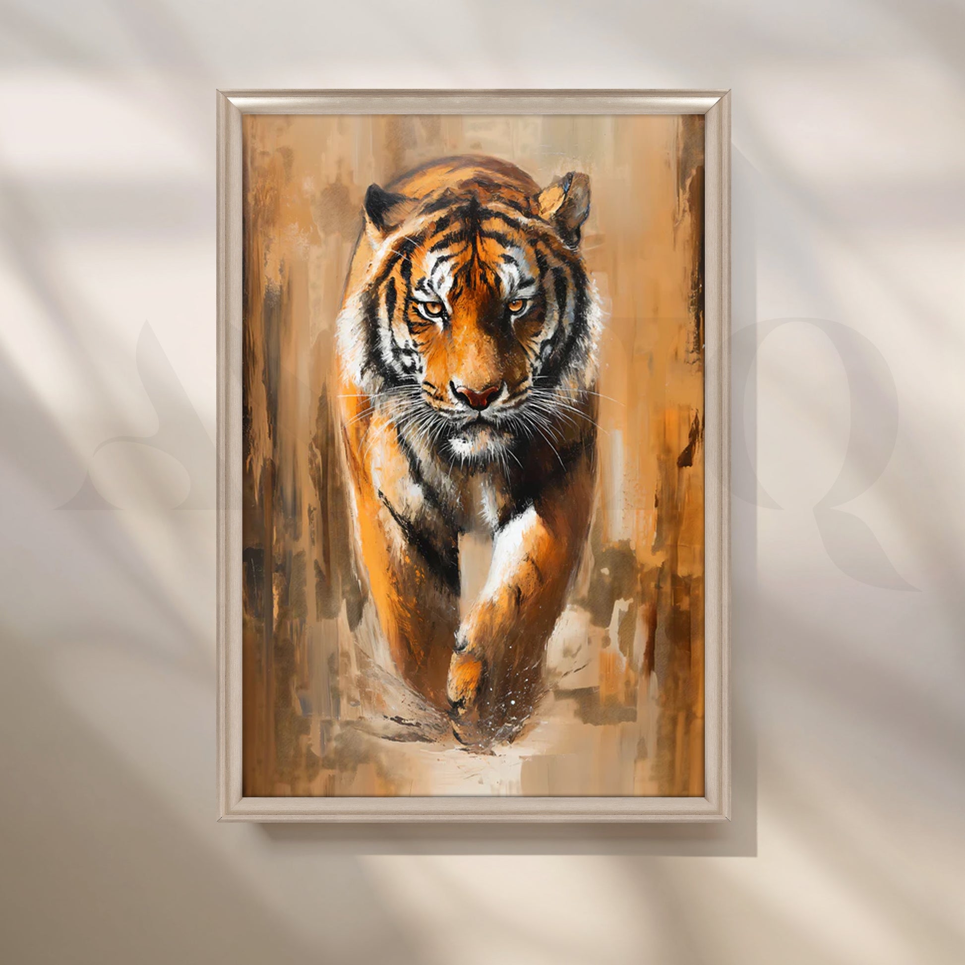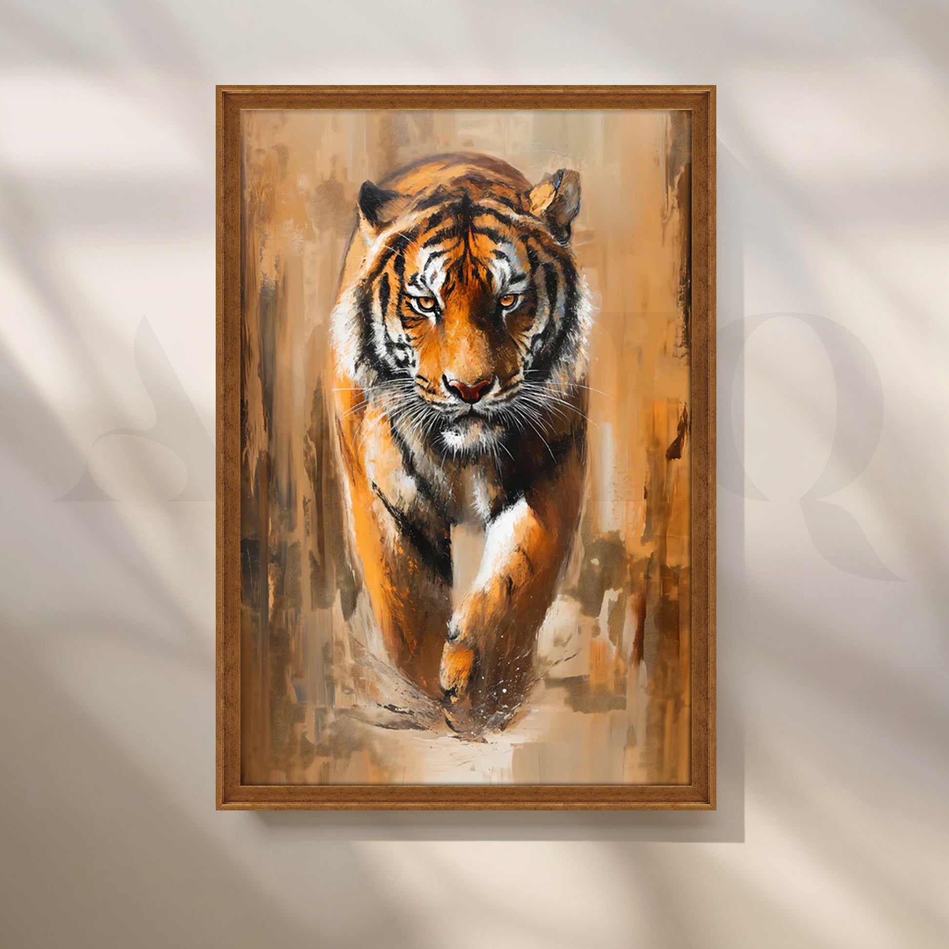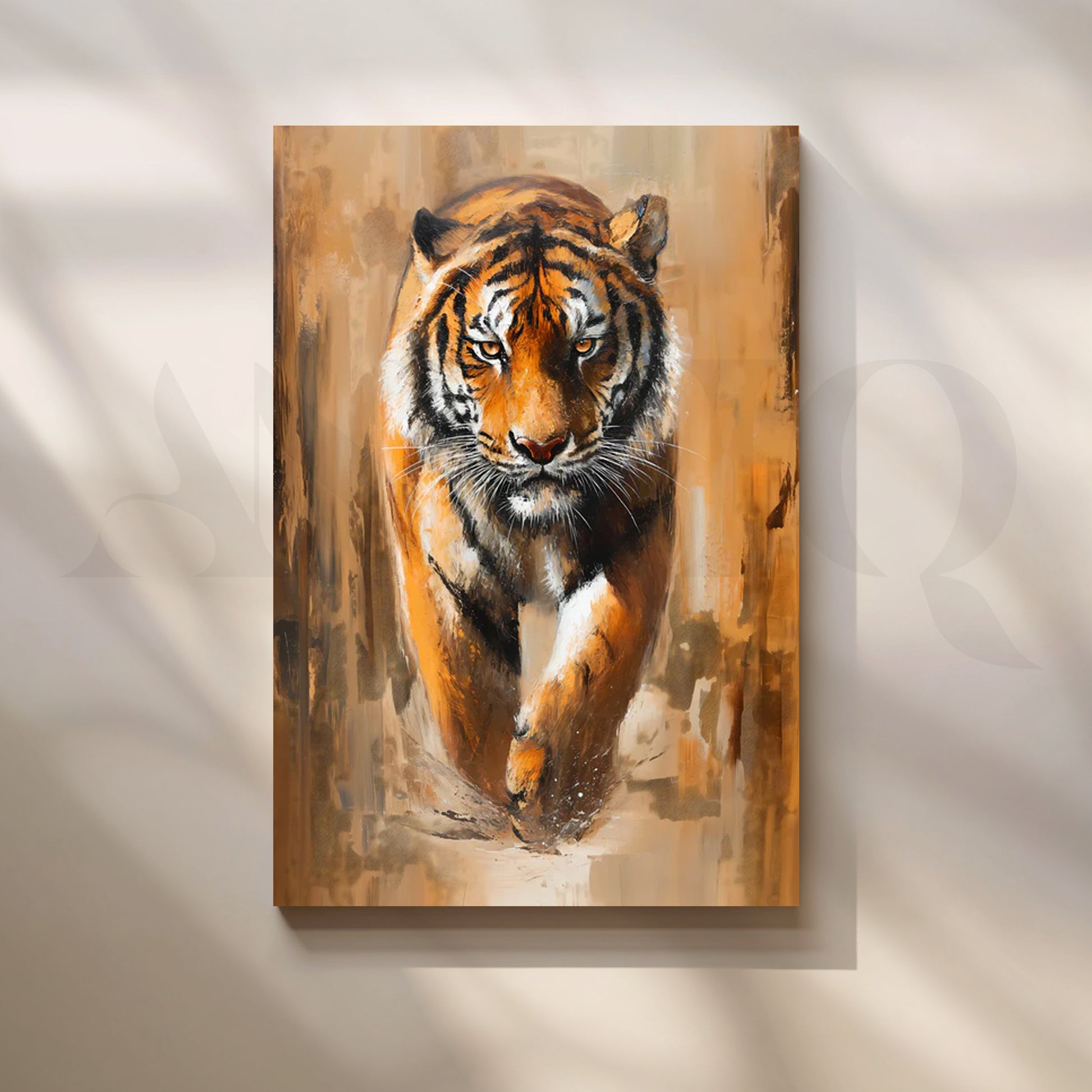 A dynamic wildlife portrait of a prowling tiger, painted with fluid watercolor splashes in warm taupe, amber, and inky black. This modern wall art adds energy and confidence to neutral spaces—perfect as large living room art, office statement décor, or entryway focal point. Bold yet elegant, it layers beautifully with contemporary furniture, “abstract canvas painting,” and minimalist interiors.