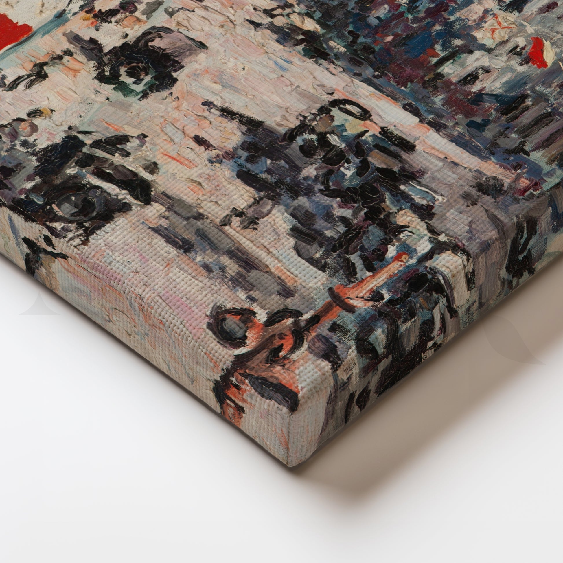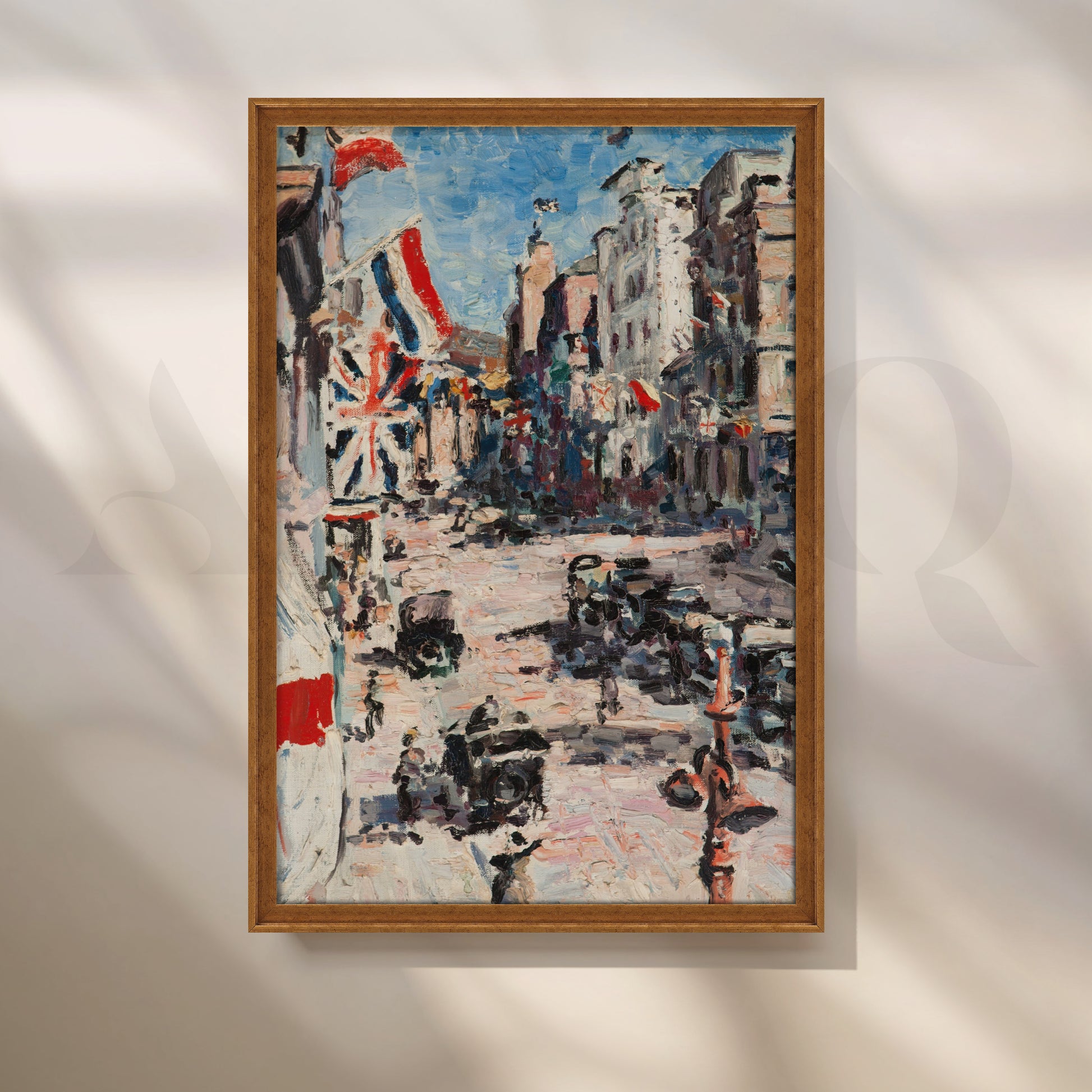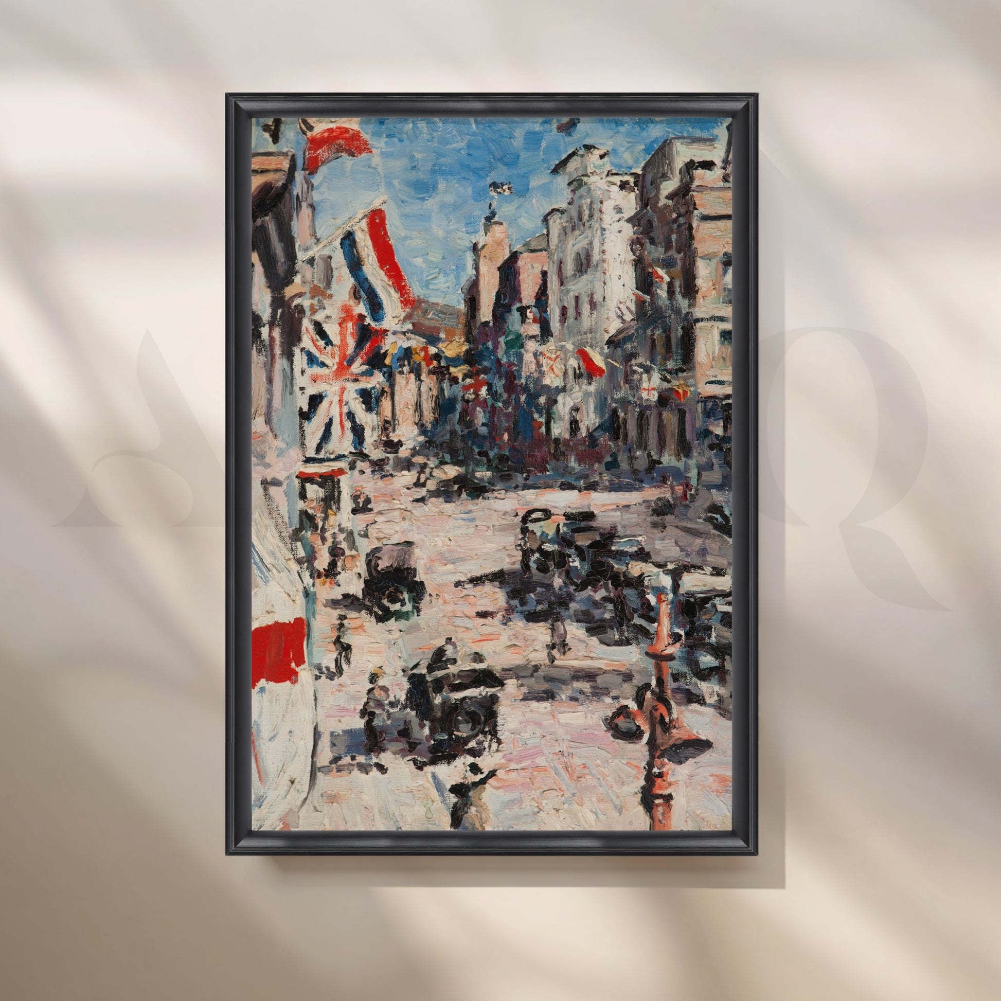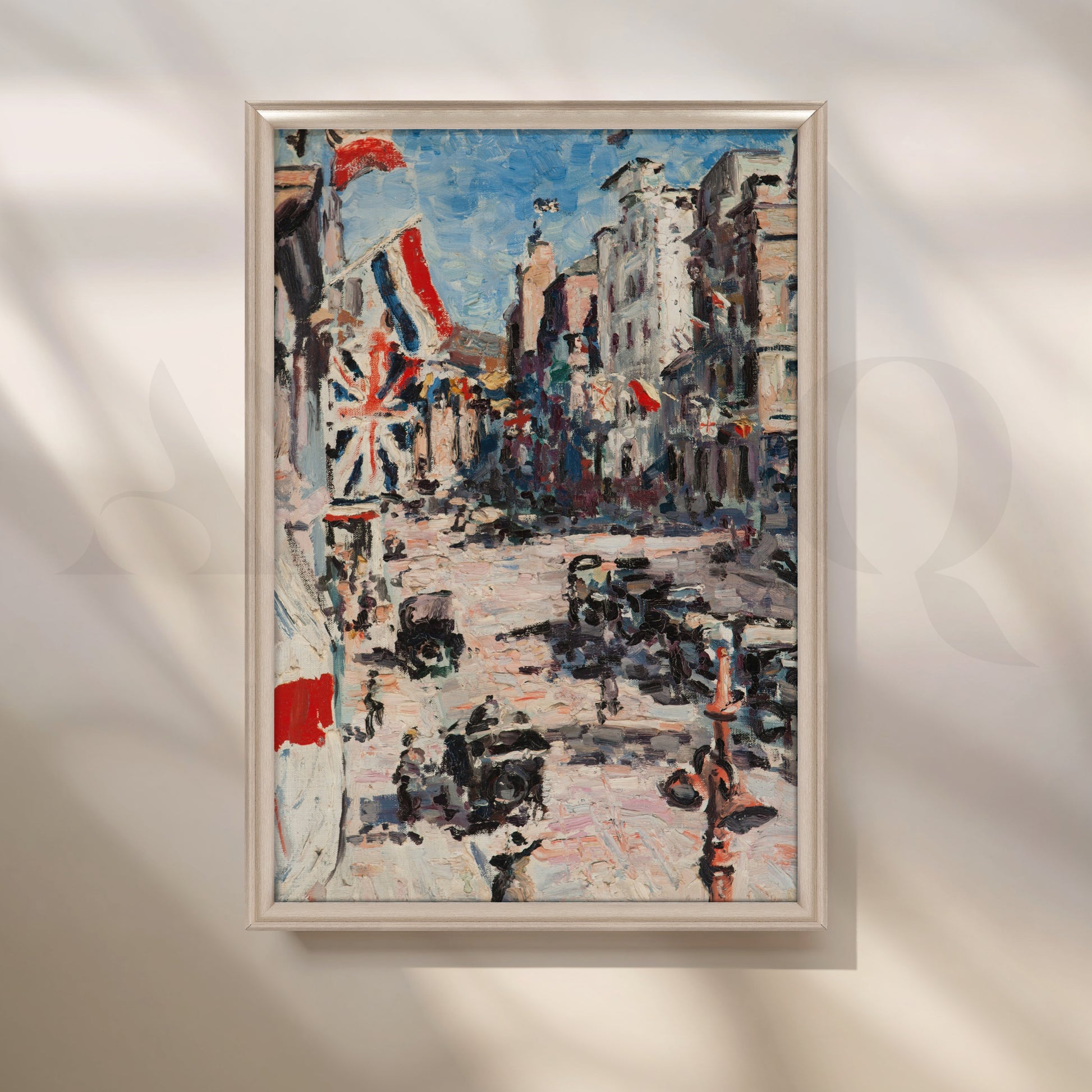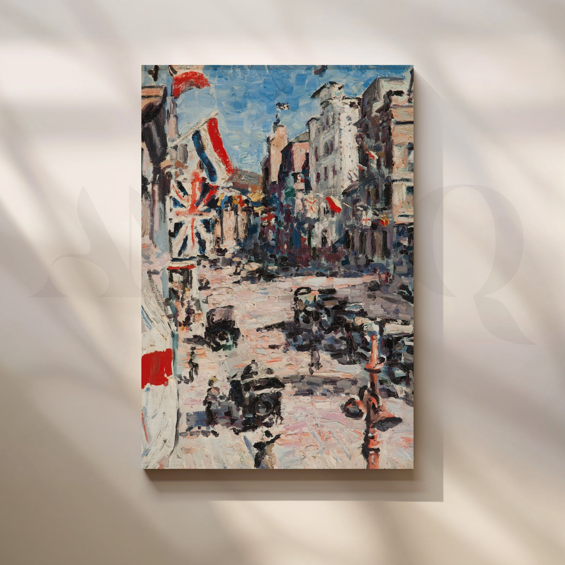 Celebrate city energy with a lively boulevard decked in Union Jack flags—impressionistic strokes animate pedestrians, carriages and sunlit facades. This spirited cityscape makes a striking focal point for living rooms, entry halls and creative workspaces. Keywords: London street painting, impressionist cityscape wall art, Union Jack decor, festive urban canvas, statement entryway art, vibrant living room print.