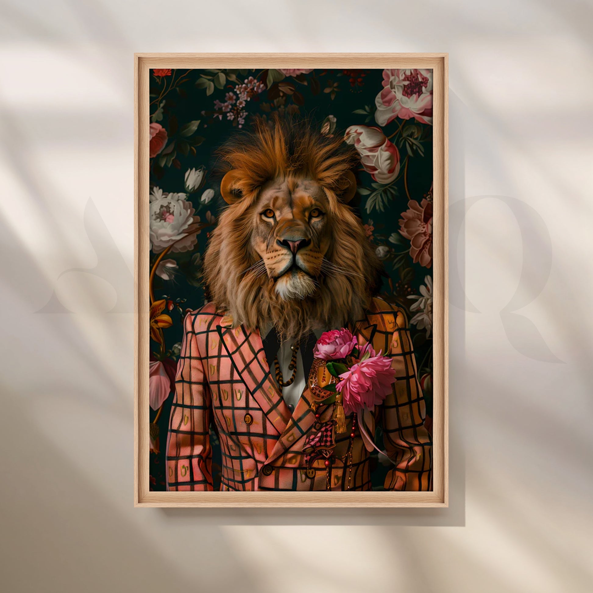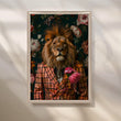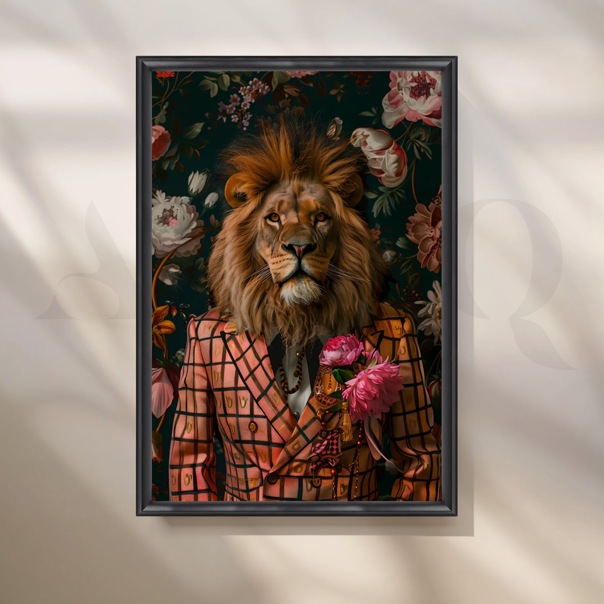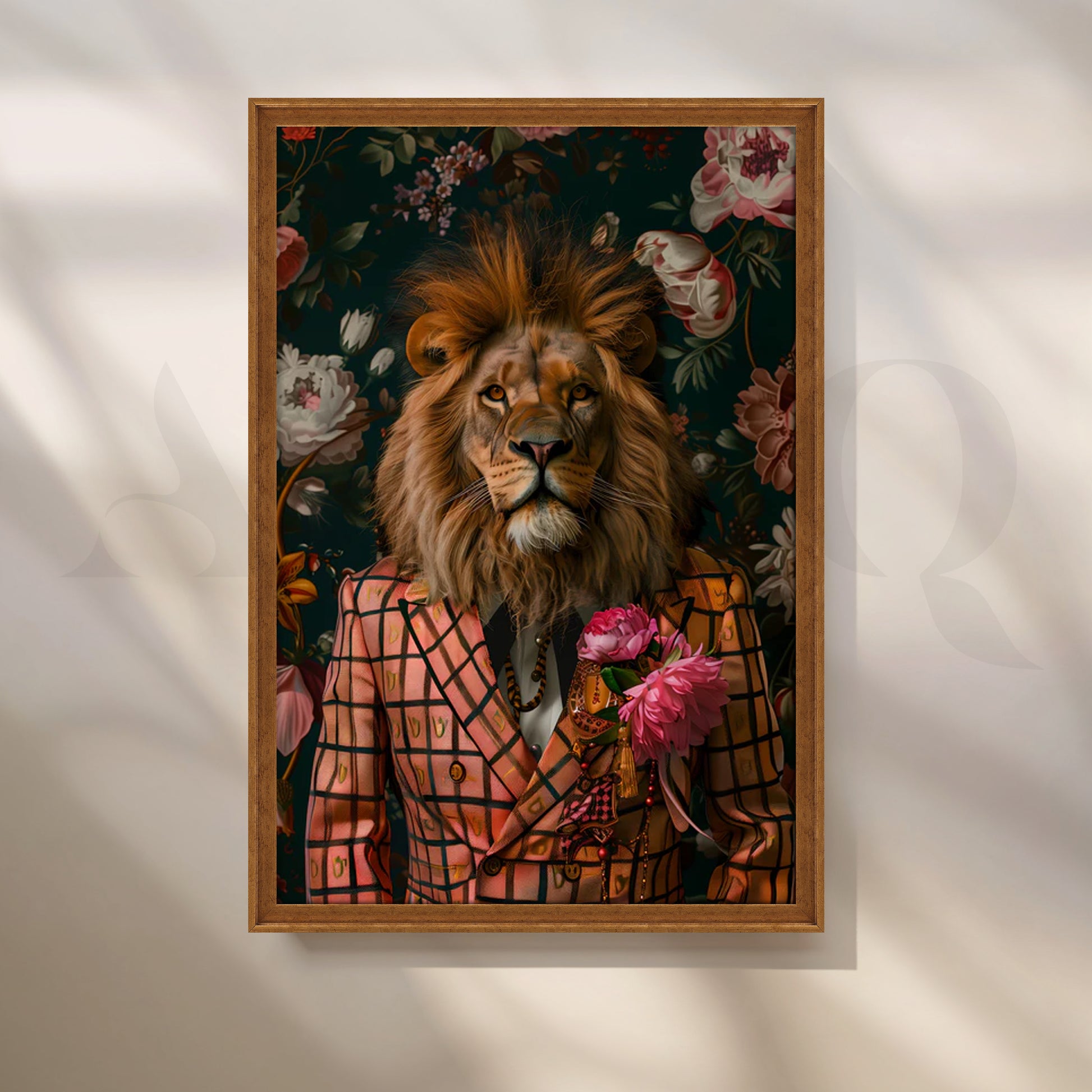Commanding yet elegant, this modern wall art features a regal lion in a plaid suit set against a lush, vintage floral backdrop—rich greens, blush pinks, and warm terracotta tones. The moody, maximalist style makes a striking statement canvas for a sophisticated living room, study, or library. Perfect for gallery walls or above a console, this animal portrait adds character and conversation-starting charm to eclectic décor, vintage interiors, or modern traditional spaces seeking large living room art and unique office wall art.