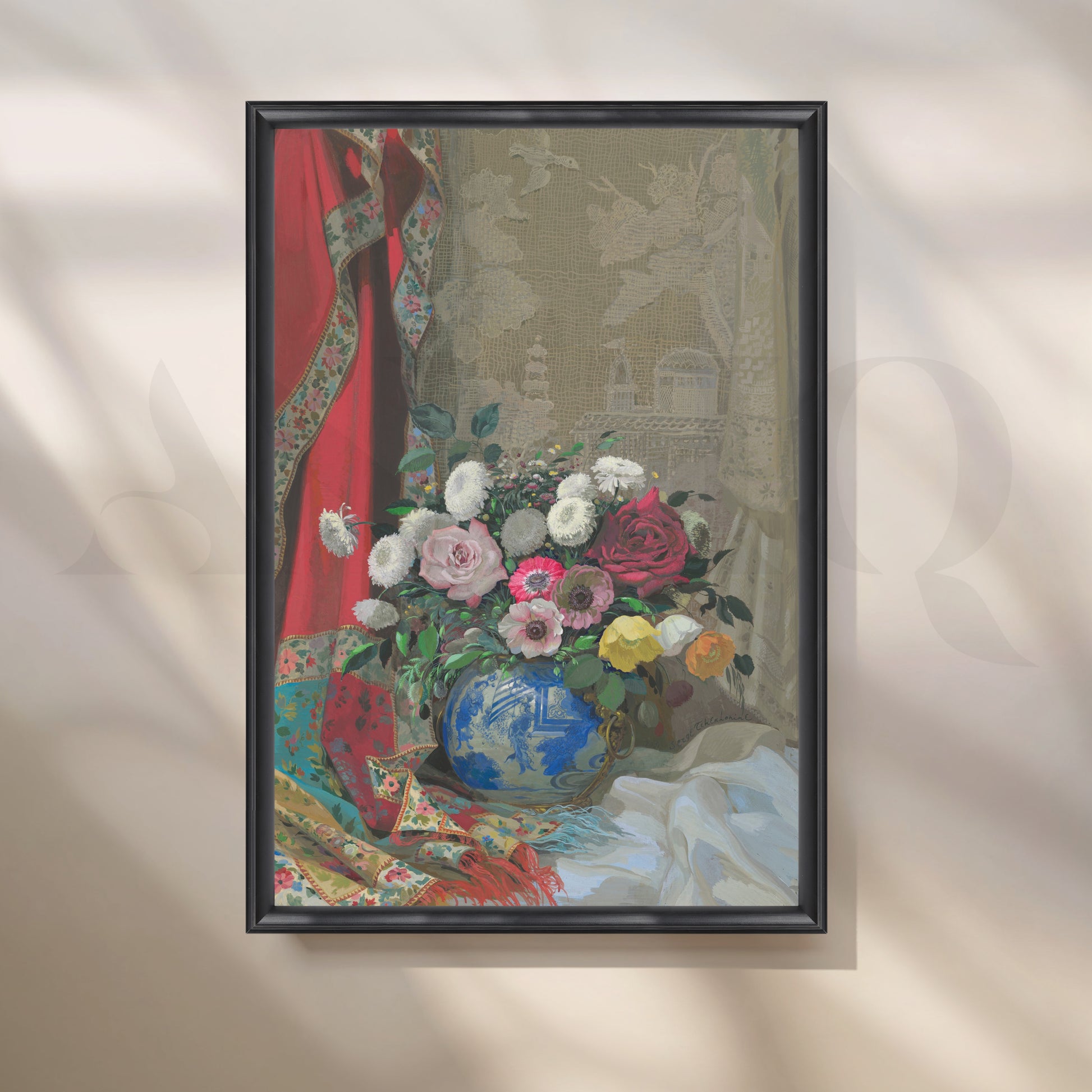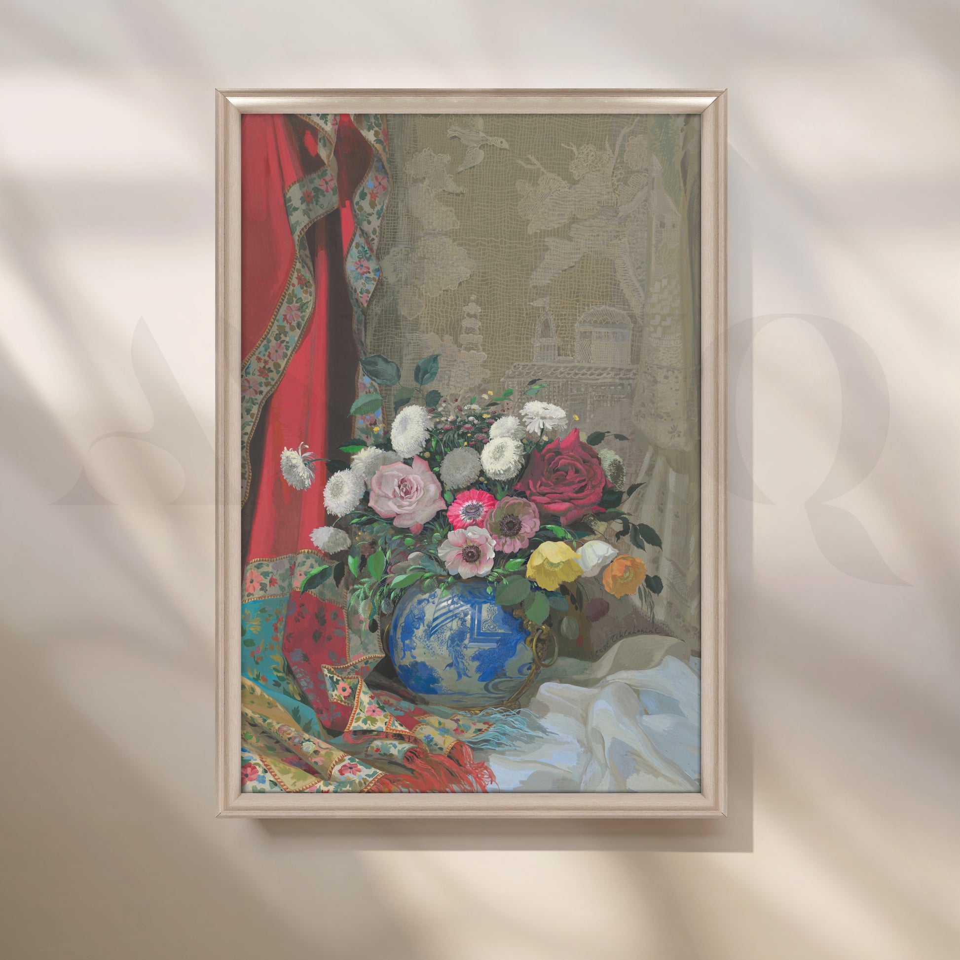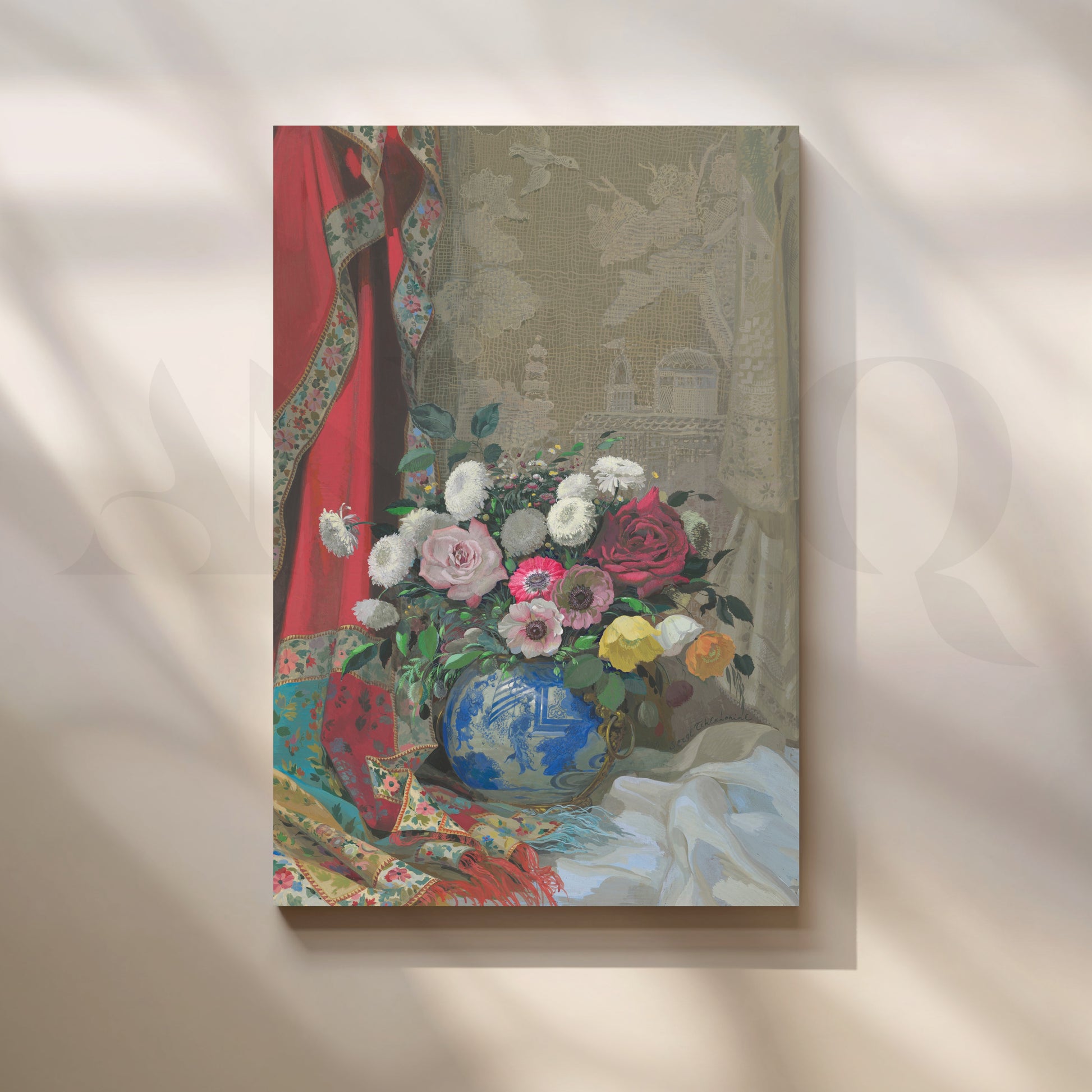 An exquisite Anciq artwork featuring pastel blooms in a decorative blue vase, framed by soft drapery and ornate textiles. Perfect for living or drawing rooms seeking refined sophistication. Keywords: floral vase painting, elegant living room art, vintage home decor, European floral canvas, luxury wall artwork.